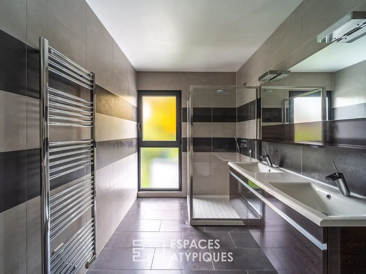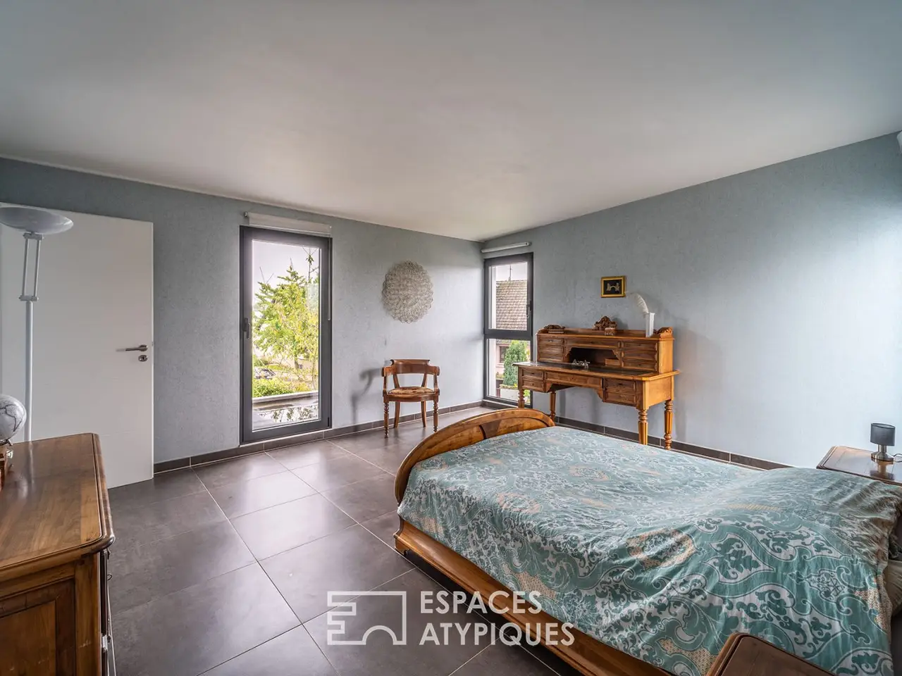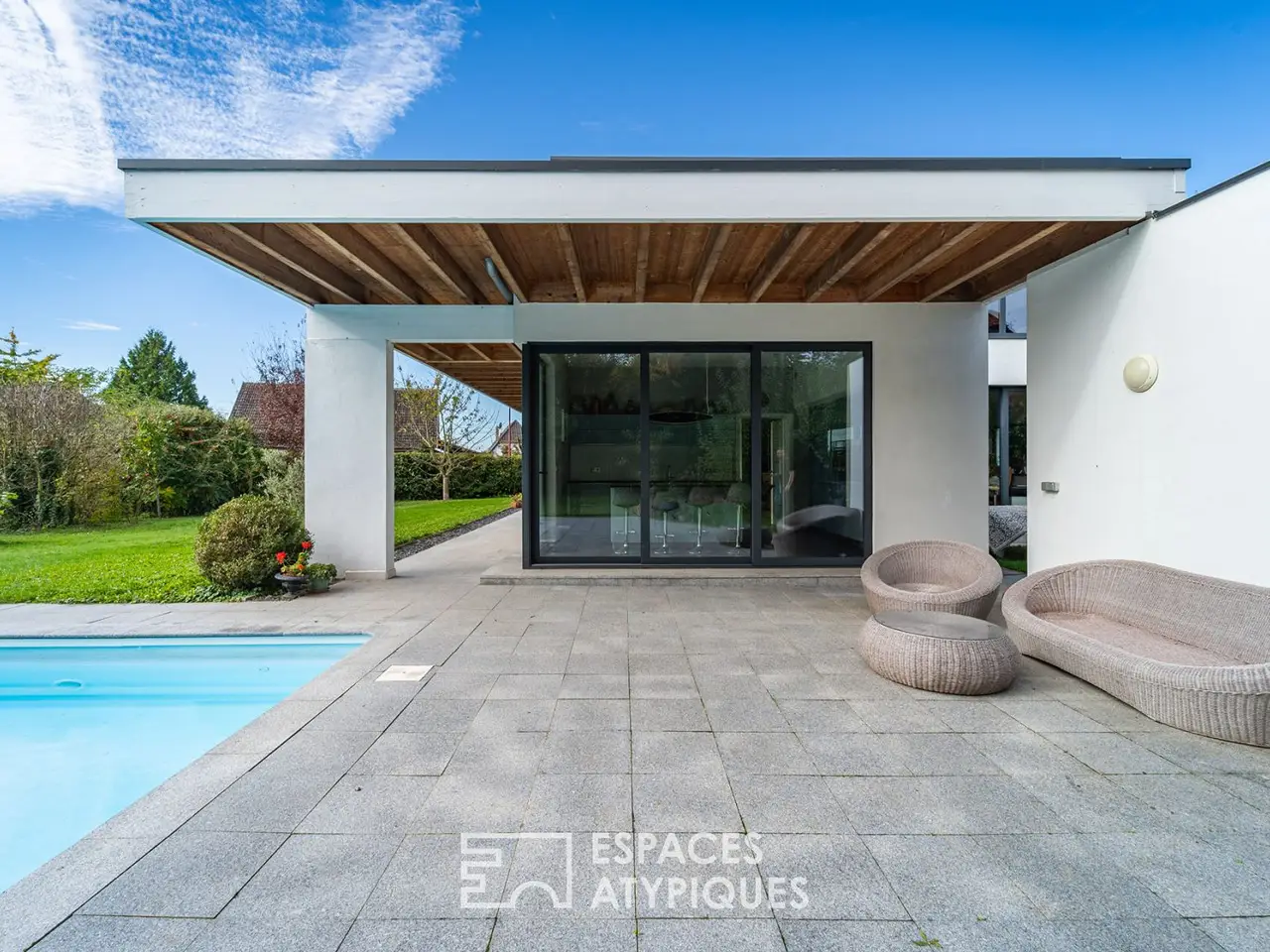 Situated in a peaceful setting just 25 minutes from Strasbourg, this sleek architect-designed villa spans 250 m2. Built in 2011, it sits in 15.7 acres of wooded grounds with a 10 x 4.5 m heated swimming pool. Designed to offer maximum light, it boasts generous, functional living space for a comfortable family lifestyle. The entrance hall sets the tone for the extraordinary volumes to follow. With 3 m high ceilings, the 60 m2 living room offers an exceptional sense of space and depth. It comprises a lounge and dining room warmed by a wood-burning stove and bathed in light thanks to more than 9 metres of picture windows overlooking the lush garden. Adjoining the dining room is a large, bright kitchen/diner with a central island and granite worktop, offering a pleasant view of the garden and swimming pool, as well as direct access to the terrace. A study opening onto the garden, a shower room and a utility room complete the ground floor. The upper floor is given over to sleeping quarters, with a shower room, a vast bathroom with sauna and four generous bedrooms, one with an adjoining made-to-measure dressing room. A double garage completes the features of this property, which also benefits from high-performance insulation, ensuring comfort and energy savings for its future owners. Its sophisticated lines, functional design and above all its vast green setting in a privileged area make this a particularly rare property that will delight lovers of contemporary purity. REF. 1404 Additional information * 7 rooms * 5 bedrooms * 3 bathrooms * Outdoor space : 1571 SQM * Property tax : 1 554 €