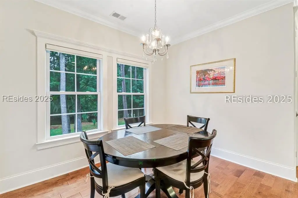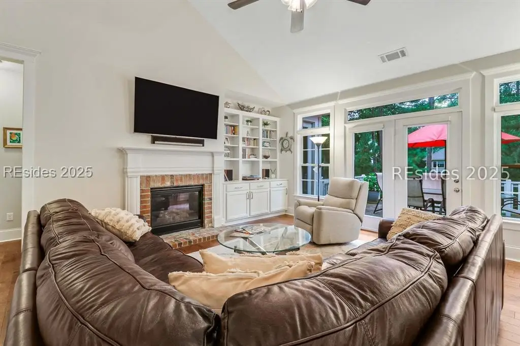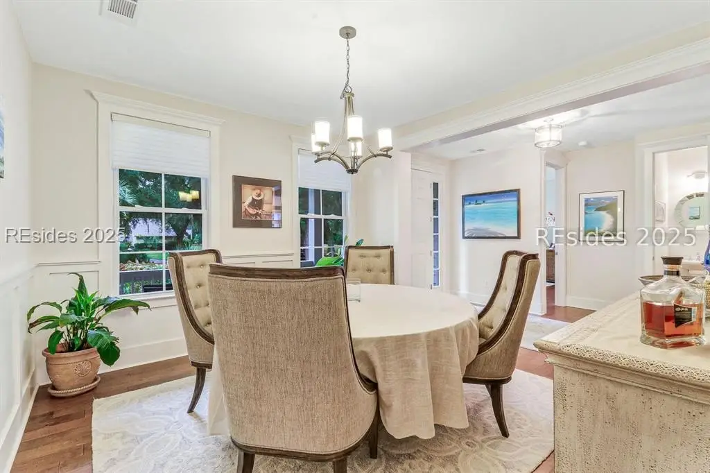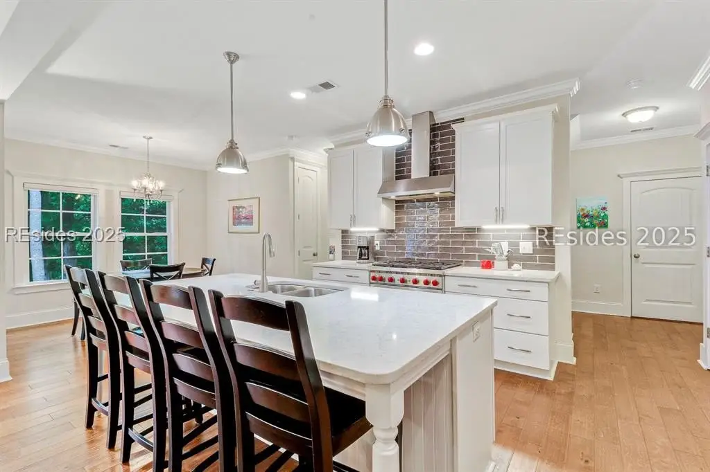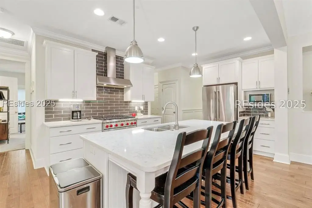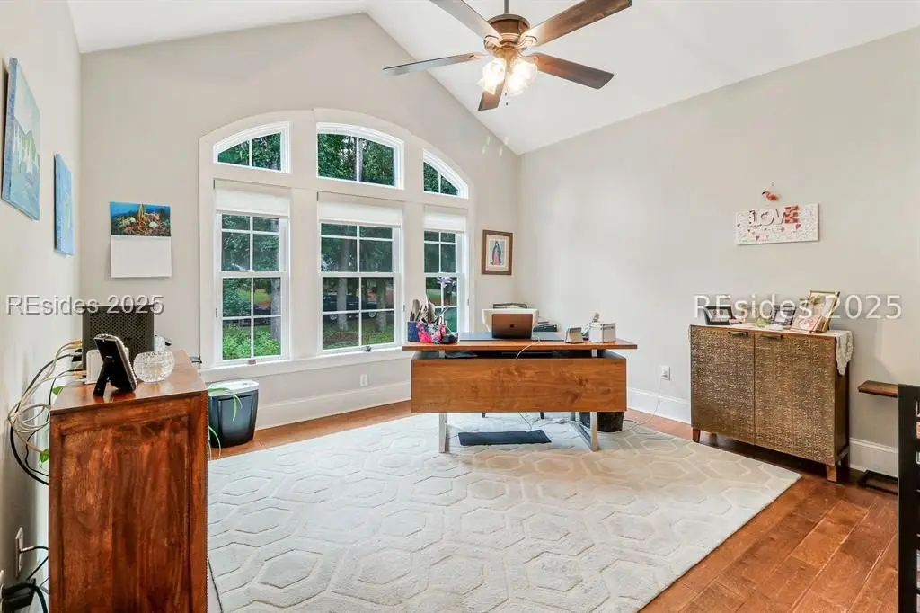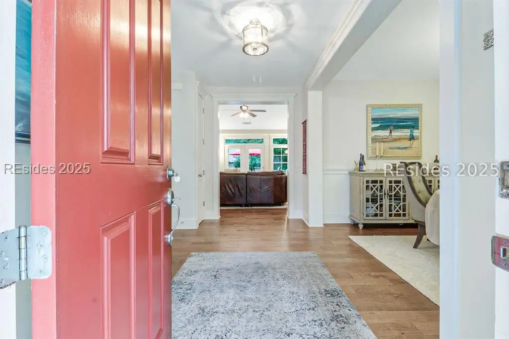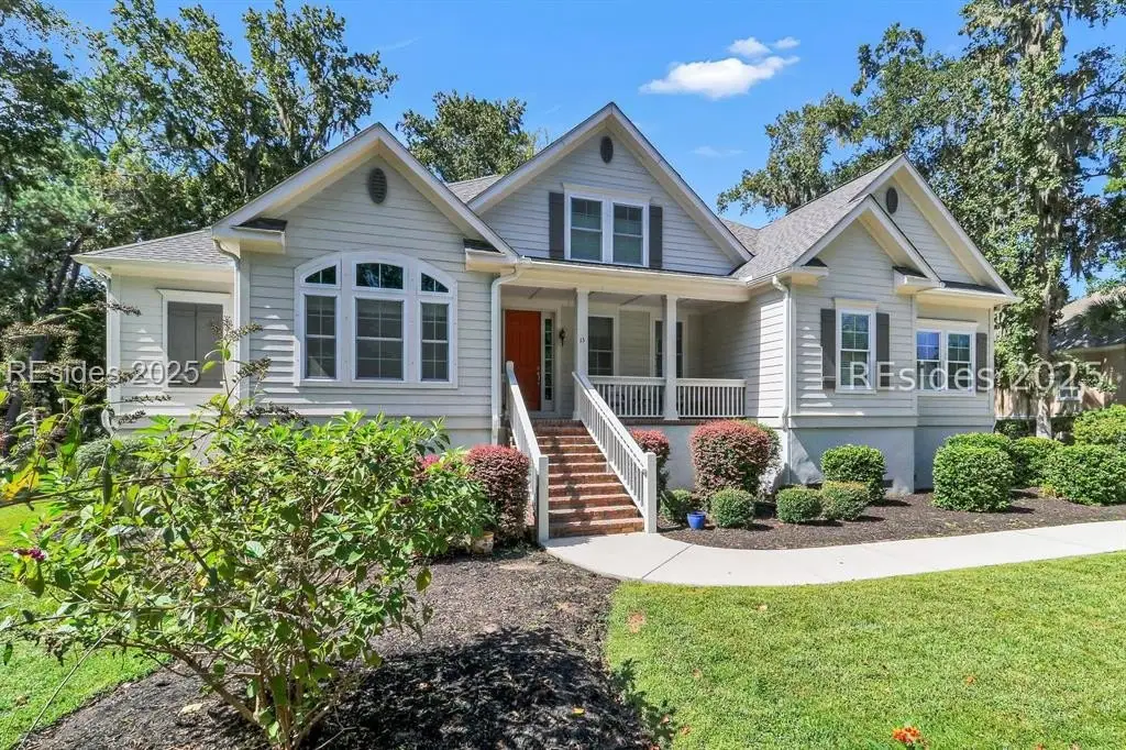 Pristine, 9 years young residence with excellent curb appeal & sweeping lagoon views on quiet cul de sac street in amenity rich Moss Creek. Interior features include smooth vaulted/tray ceilings, wood flooring, quartz counters, excellent natural light/walls of windows to view including transom & Palladian windows, impressive custom millwork (crown molding, chair rail, over height baseboards, wainscoting, etc.), built-ins and cabinetry/vanities by master craftsmen, high end stainless steel appliance package including new Wolf range/oven, 8 ft. 1st floor interior doors, gas fireplace with brick hearth/surround, designer fixtures/hardware, recessed/pendant/under cabinet lighting, ceiling fans, custom window treatments, 1 new HVAC system and ample closet/storage space throughout home. Very livable & popular floor plan boasting impressive island kitchen w/4 seat breakfast bar open to great room, formal/casual dining, den/study, laundry rm, powder rm, oversize 2 car garage and excellent BR separation w/4 BRs including expansive primary BR w/well-appointed bath & huge walk-in closet. Exterior offers attractive/durable Hardie board siding, charming covered front porch, carriage lighting, private rear deck & brick paver grilling patio, lush sub-tropical garden, specimen trees, mature lawn & large back yard. All centrally located between gated front entry and top-notch amenities in this preferred private club community offering some of the most breathtaking scenery anywhere in the Lowcountry!