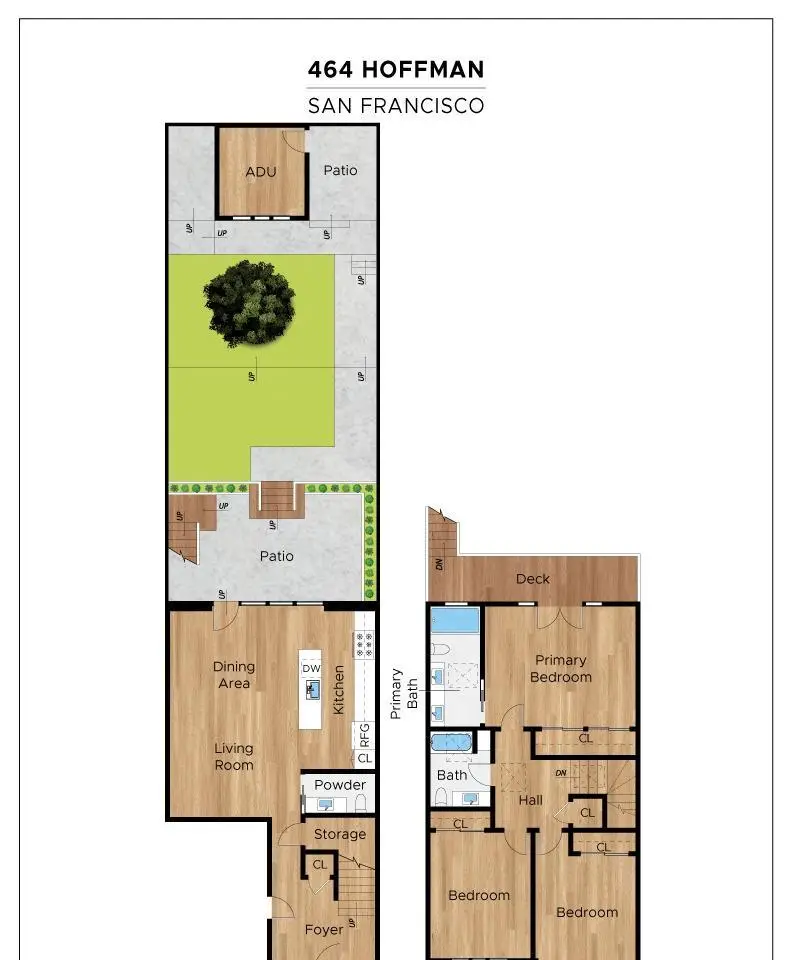 This isn't a fixer. It's a finisher. 464 Hoffman is a fully reimagined Noe Valley home waiting for someone to bring it across the finish line. The home has been extensively transformed with new electrical in 2024, plumbing, and HVAC systems, a reinforced foundation w/steel beams, all-new siding, and a 2019 roof.The open-concept great room flows to the backyard through a four-panel accordion door for effortless indoor-outdoor living. The kitchen has custom wood cabinetry, Caesarstone waterfall counters, a Thermador stove, and a Fischer & Paykel fridge. Upstairs, you'll find all three bedrooms, including a primary suite w/ private deck and an upstairs laundry room where it actually belongs. The terraced yard feels like its own little park, anchored by a mature oak tree, complete with a gas line for your grill or firepit and a bonus detached shed. Now, the fine print (because we believe in transparency): the property is missing its final permit and has a few open Notices of Violation and abatements. Bring your architect and/or contractor to understand the final vision. For the right buyer, it's a dream project that's part of the way there. And here's the kicker: for qualified buyers, ask about a special loan offer!