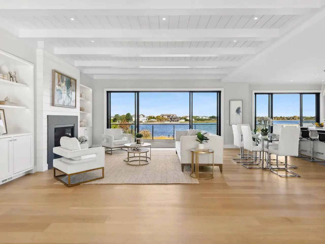 Discover luxury waterfront living at 218 Dune Road, Westhampton Beach. This stunning bayfront coastal oasis offers unparalleled elegance and comfort throughout 4,000 sf of living space. The traditional style architecture spans across 2 stories offering 5 bedrooms, including both a first-floor and second-floor primary suite, 5 full baths and 1 half-bath. The open and bright interior features a gourmet eat-In kitchen with top-of-the-line appliances, living room with cozy fireplace, family room, and den/office. Each room showcases the spectacular vistas with walls of windows and sliding glass doors leading to decks and balconies. Outdoors, enjoy breathtaking bay views, direct bay access, the in-ground, heated pool, hot tub, and an expansive entertainment-ready deck surrounded by water views. Ample driveway parking plus 3 garage spaces and plenty of storage. Located between the bridges, this property also includes beach access. Come to 218 Dune Road where every day feels like a vacation.