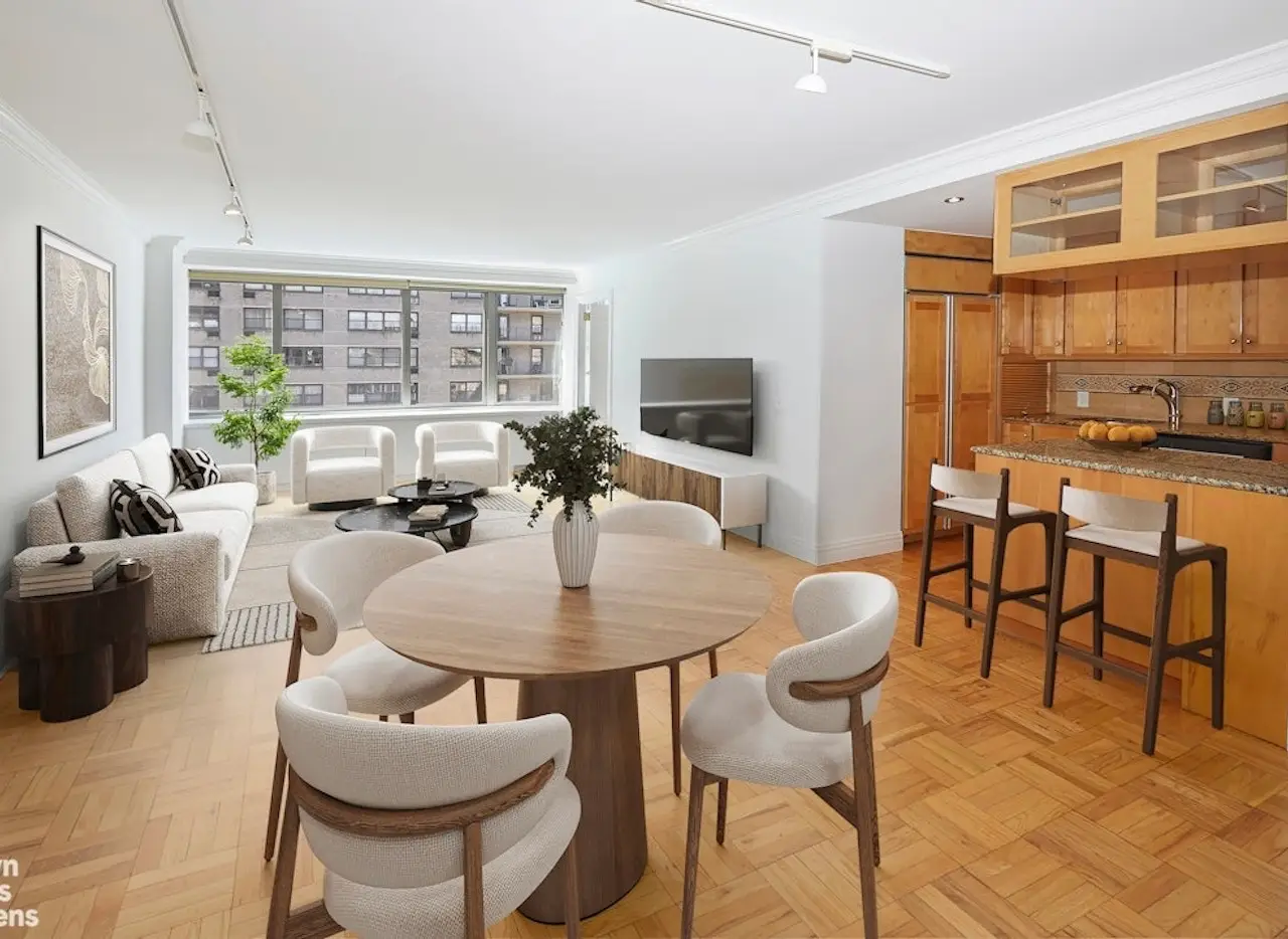 Elegant & Spacious Upper West Side Residence with Stunning City & River Views Nestled in one of the Upper West Side's iconic residential buildings, this bright and airy high-floor residence in the prestigious Presidential Towers offers an exceptional blend of space, style, and convenience. Recently refreshed with new paint, this sophisticated home is move-in ready and perfect for a variety of lifestyles. Property Highlights: Flexible Layout: Originally a two-bedroom, the apartment has been intelligently reconfigured to include a third space, ideal for a home office, nursery, or guest room. Expansive Living Area: The open-plan living and dining spaces are bathed in natural light, thanks to oversized south-facing windows and city views. Modern Kitchen: The updated open kitchen is both functional and stylish, featuring stainless steel appliances, a brand-new microwave/convection oven, a dishwasher, and ample cabinetry for storage. Private Outdoor Space: A large balcony offers a serene escape with beautiful neighborhood and Hudson River views. Generous Bedrooms: Both bedrooms are king-sized, with the primary suite boasting a walk-in closet, an ensuite bathroom and a separate area perfect for a desk or lounge. In unit W/D - plus laundry room in the building for larger loads. Complete Finishes: Crisp neutral decor, quality parquet flooring, and a welcoming foyer with a built-in storage add to the home's refined character and design. Additional Building Features: Pet-friendly with board approval Pied- -terre, sublets, co-purchasing, and guarantors permitted on a case-by-case basis 75% financing allowed ALL utilities - natural gas, water, and electricity (including central air conditioning) are included in the monthly maintenance Building & Neighborhood: Designed by renowned architect Morris Lapidus, the Presidential Towers is a full-service, mid-century co-op with a 24-hour doorman, central laundry, storage room, bike room, and an onsite parking garage (note, both storage and garage have waiting lists). This sought-after Lincoln Square location is between Riverside Park and Central Park, with Trader Joe', premier dining, shopping, and world-class entertainment at Lincoln Center in close proximity. Multiple subway lines are within easy reach, ensuring effortless access to the rest of the city.