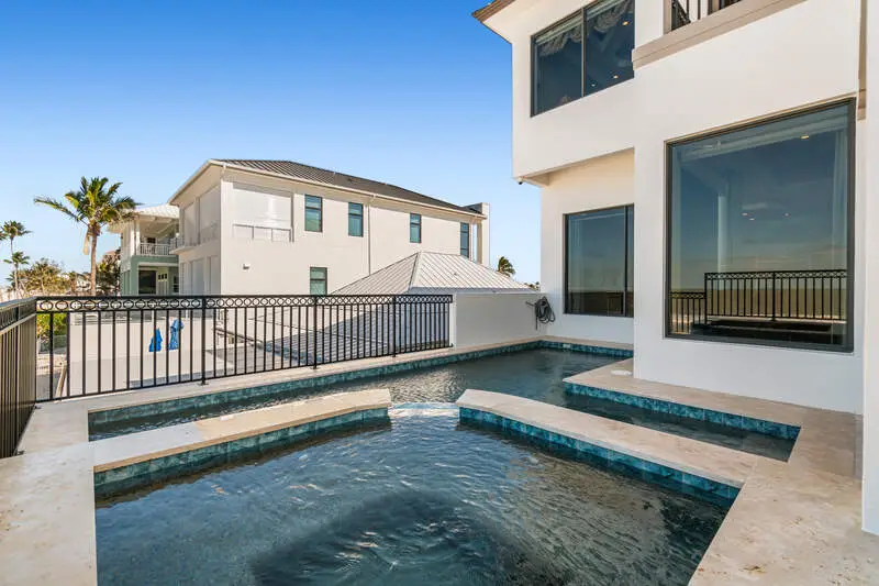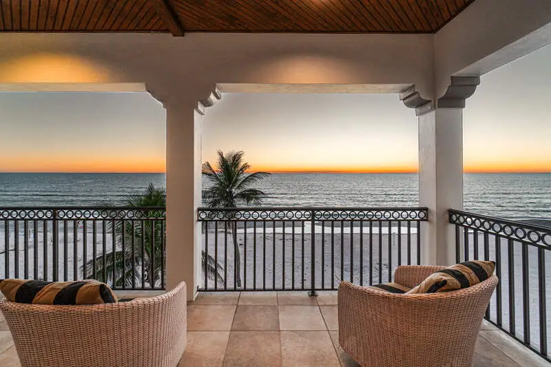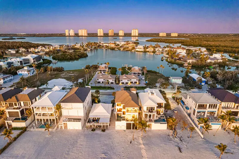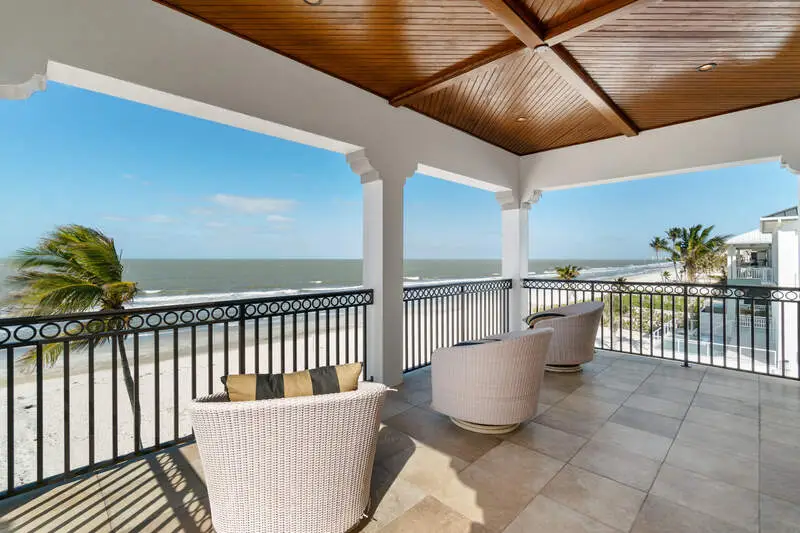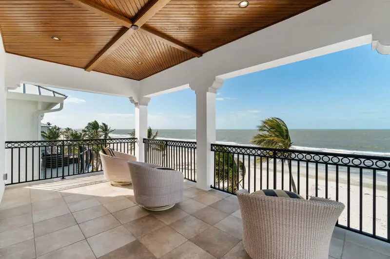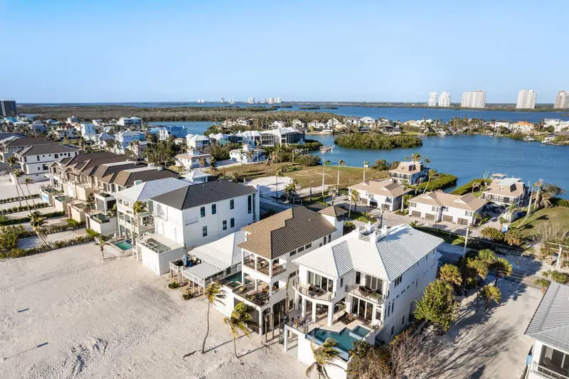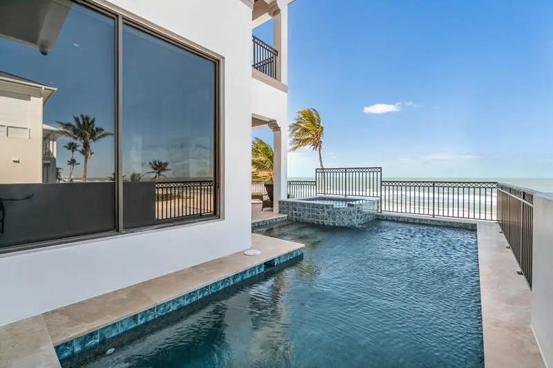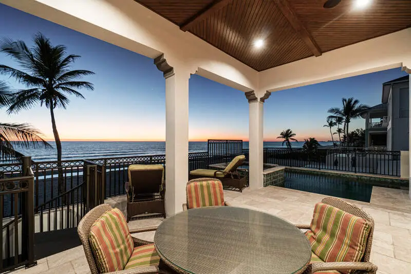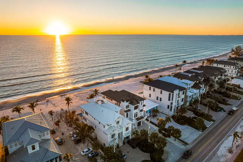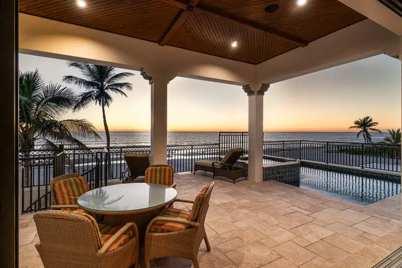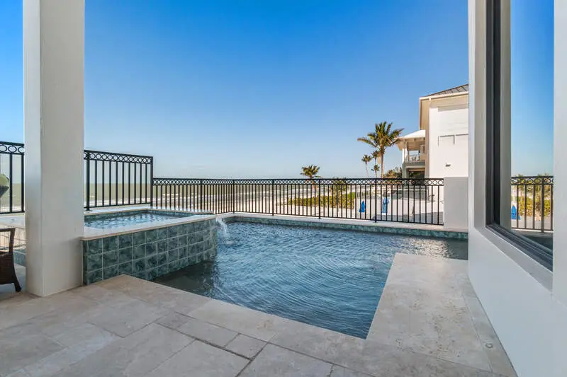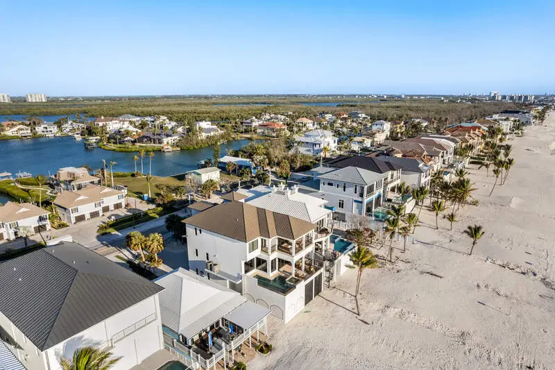 Stunning and newer-built beachfront home with breathtaking views of the Gulf, ideally situated on the highly coveted Bonita Beach. With unobstructed views of the turquoise waters and pristine white sands, this home is a true coastal gem. Built like a fortress, this home features all concrete-block construction and brand-new hurricane impact windows and sliders. Perfect for entertaining, the spacious open floor plan includes 4 bedrooms, 5.5 bathrooms, an expansive upstairs bonus room, and a versatile ground-floor flex space. Step outside to a private backyard oasis, complete with a RARE elevated pool and spa, a summer kitchen, and panoramic Gulf views. Inside, you'll find luxurious finishes throughout, including custom wood-paneled coffered ceilings and a seamless blend of hardwood and travertine tile flooring. The chef's kitchen boasts granite countertops, an oversized island, light colored custom cabinetry, an eat-in area, and a breakfast bar perfect for casual dining. Adjacent to the kitchen is a custom bar area with a built-in wine cooler, wet bar, and additional bar seating-ideal for entertaining guests. The expansive primary suite offers a serene retreat with sweeping Gulf views, a private balcony to enjoy spectacular sunsets, and a spa-like bathroom with dual vanities, a frameless glass shower, and a separate soaking tub. The upper-floor bonus room is a versatile space, complete with an ensuite bathroom, wet bar with beverage cooler, and an open-air balcony-perfect for a media room, office, or additional living area. Additional features of this home include a private elevator and a smart lighting system. Close to several fantastic restaurants and only a 10-minute drive to Mercato and the Promenade, with Waterside Shops, Coconut Point, Naples 5th Ave, and the International Airport nearby. Live the ultimate coastal lifestyle with sweeping views of the Gulf-this is luxury living at its finest!
