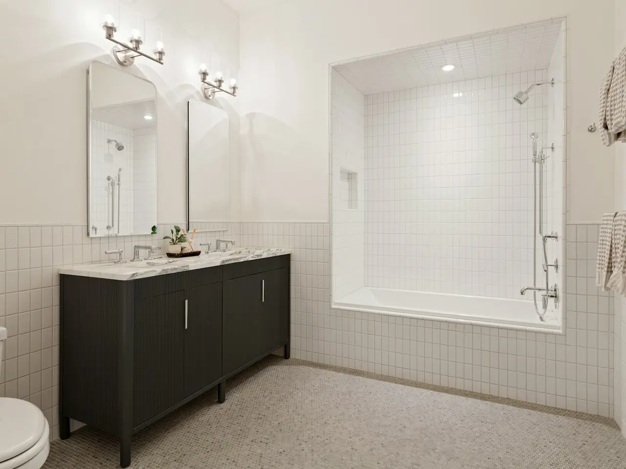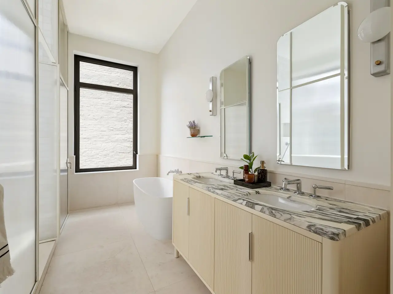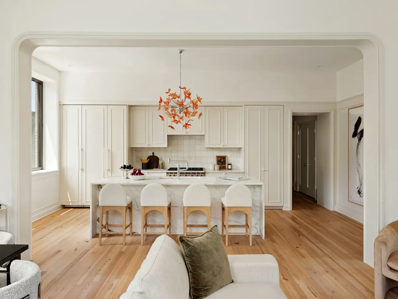 A seamless blend of architectural heritage and refined design, this corner three-bedroom, two-and-a-half-bathroom home at the prestigious 1 Prospect Park West offers a rare level of luxury, space, and light. With southeast and southwest exposures, the home is located on the corner overlooking Prospect Park West and President Street and is bathed in natural light. Spanning 2046 square feet, residence 3C is a sanctuary of proportion and detail with an optimal and gracious layout. At the heart of the home is the great room, crowned by 13-foot ceilings and graced with tree-lined views of Prospect Park. The layout unfolds with a sense of purpose and grandeur, beginning in a formal entry gallery where hand-laid, reclaimed heart pine floors-patterned in a motif inspired by Frank Stella-set a tone of warm elegance. These floors flow throughout the residence, unifying each space with rich texture and timeless appeal. Whether you are a hobbyist or a gourmet chef, the open kitchen's sculptural and functional elements will inspire your cuisine. Honed Estremoz marble counters, an oversized Calacatta Vagli island, and fully integrated Wolf and Sub-Zero appliances are complemented by custom Workstead paneled cabinetry, a cast iron undermount sink, and a Dornbracht chrome faucet that reads more like a piece of art than hardware. An arched opening transitions the kitchen into the grand entertaining space, where thoughtful moldings and custom trim elevate the room's pre-war charm. The private quarters are quietly tucked away along a central hall. Two well-proportioned secondary bedrooms enjoy generous closet space and share a serene bathroom outfitted with a Calacatta Nero vanity, Waterworks chrome fixtures, and gray limestone mosaic flooring. The primary suite is both tranquil and luxurious, anchored by custom oversized windows, bespoke millwork, and two spacious closets, including a walk-in wardrobe. The en-suite bath is a study in soft contrast and curated materials: Novelda Cream limestone, a Bianco Dolomite marble shower with pyramid glass and powder-coated steel, a freestanding soaking tub, and Calacatta Nero-topped double vanity complete the spa-like experience. A 1920s landmark, One Prospect Park West is a beautifully restored exercise in Classic Revival architecture, reimagined by Workstead with interiors that speak to quiet elegance and modern craftsmanship. Residents enjoy a full suite of elevated amenities: a 24-hour attended lobby, landscaped rooftop terrace by ODA New York with a unique apple orchard, outdoor kitchen, and sun deck with skyline views. Wellness offerings include a state-of-the-art gym, sauna and steam room, movement studio and basketball court, and ample bike and package storage. Private storage is also available for purchase. Set at the gateway to Park Slope and directly across from Prospect Park, this location offers immediate access to green space, cultural institutions, beloved neighborhood restaurants, and excellent transportation-placing luxury, lifestyle, and legacy all at your doorstep.