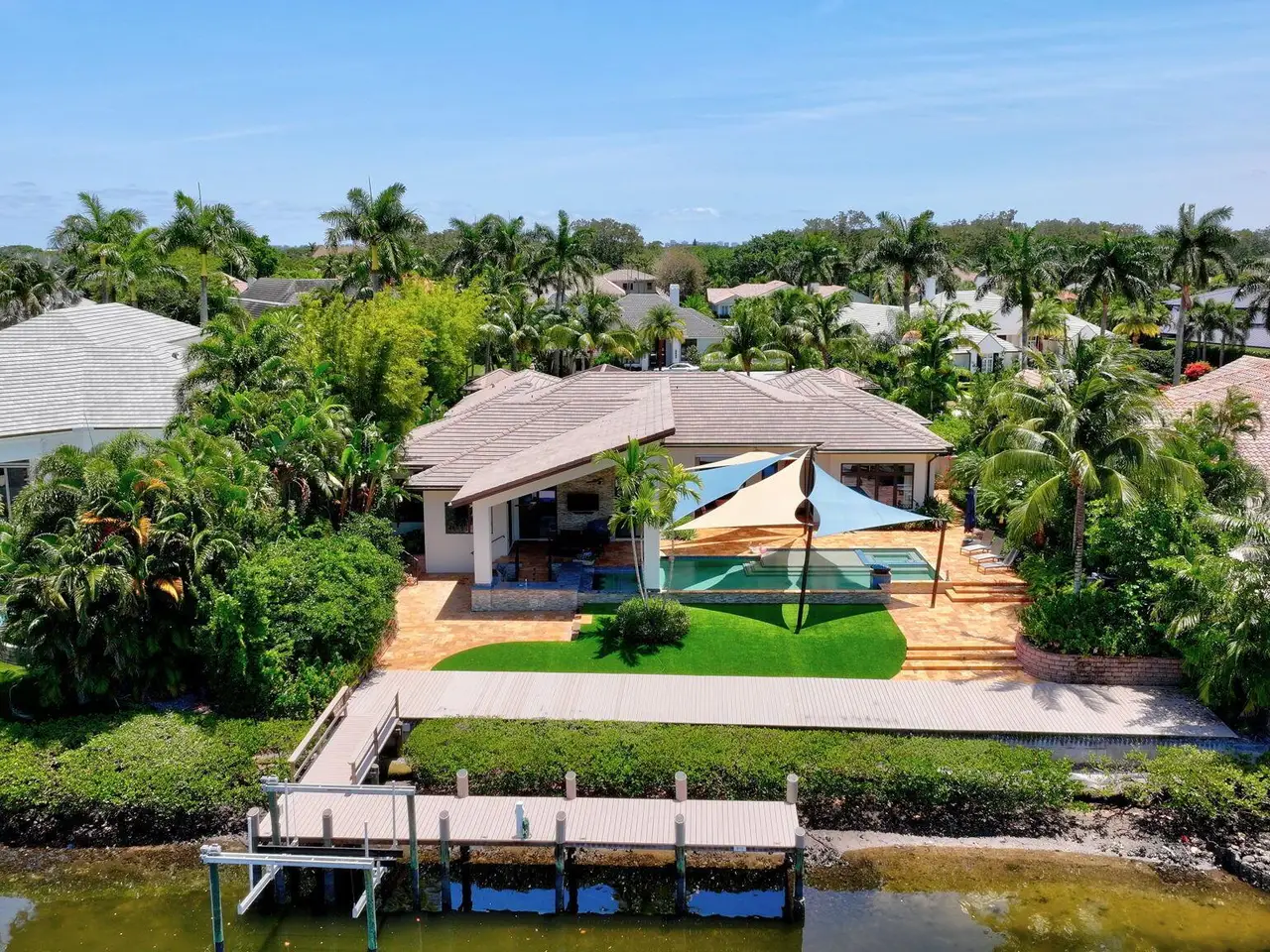 Welcome to waterfront living, in prestigious Frenchman's Creek. This exquisite 4-bedroom, 4.5-bath residence offers breathtaking water views, a private dock with boat lift, and direct access to the Intracoastal. Designed for both relaxation and entertainment, the outdoor oasis features a summer kitchen and a resort-style pool with spa, perfect for unwinding or hosting guests. Inside, the spacious chef's kitchen -- complete with a butler's pantry and breakfast nook -- offers a seamless blend of elegance and functionality. The grand living room, adorned with a decorative fireplace, wet bar, and floor-to-ceiling glass, invites natural light and showcases stunning vistas. 4-car + golf cart garage and unparalleled amenities, this home is a must-see for those seeking sophistication and comfort.