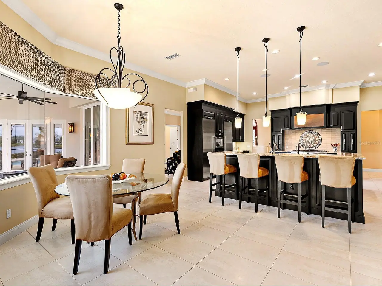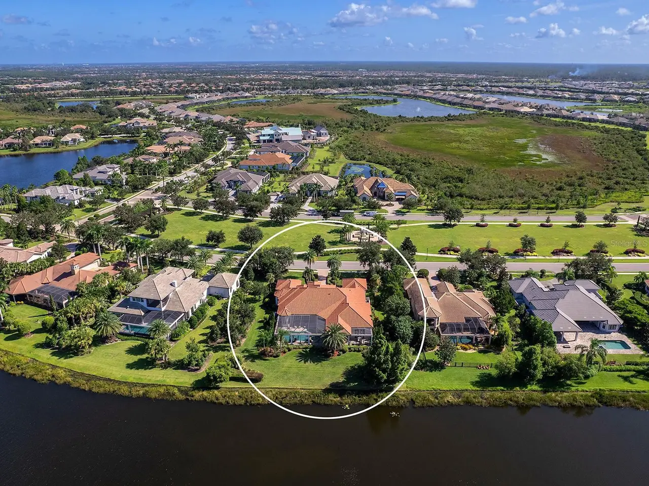 Located in the prestigious Lake Club, you will appreciate this custom Todd Johnston home on a prime 0.67-acre lot with southern lake views from the lanai and Linear Park right outside your front door. This peaceful setting is in the original and most desirable section of The Lake Club, known for its Tuscan-inspired charm, lush foliage, and interconnected lakes. Demonstrating a luxurious lifestyle, the hand-selected fine finishes in this home include Italian porcelain tile flooring, custom ceilings with crown molding, wide lake views, custom window treatments, custom entry door, in-ceiling speakers, and more in every room. The elegant floor plan offers versatile entertaining spaces from the formal living room with coffered ceiling and center-opening pocketing sliders, to the formal dining room, to the casual dinette with aquarium window, to the oversized family room with a wall of sliding glass doors, custom built-ins, and custom dry bar with two wine refrigerators. Outside on the shellstone paver lanai you’ll find a tranquil lakeside setting surrounded by classic colonnade screen enclosure plus sparkling heated pool and spa, and well-equipped outdoor kitchen. The kitchen is a true paradise with every upgrade imaginable including two islands with seating, custom cabinetry, and large walk-in pantry with shelving. The top-of-the-line appliance suite will be the envy of Michelin Star Chef’s with two Bosch dishwashers, two Thermador wall ovens each with separate warming drawers, Thermador gas cooktop with 6 burners and griddle, two U-Line wine refrigerators, built-in Thermador cappuccino maker, reverse osmosis, and split 30” Thermador freezer and refrigerators. If you’re searching for respite and relaxation, you will almost never need to leave your primary suite with a spacious bedroom, separate seating area, French doors to the lanai, walk-in closet with built-in safe, and custom morning bar with refrigerator and bar sink. Enjoy a five-star spa at home in the oversized primary bathroom with dual split vanities, separate make-up vanity, another walk-in closet, dual water closets for extra privacy, central whirlpool tub, and roman-style walk-in shower. Your guests won’t be left wanting with two spacious guest suites large enough for king beds and outfitted with walk-in closets and en-suite bathrooms with walk-in showers. When you’re ready to work select from the front study with double doors, or the rear office with a private en-suite bathroom and plenty of space for a future closet if you prefer a 4th en-suite bedroom. Fun, flexibility and function can be found in the separate bonus room and media room – including a custom theatre with 133” screen and 7.1 surround sound system. Rounding out this impressive estate is two powder bathrooms for guests, laundry with plentiful storage, two-car garage bay with direct access, and one-car garage bay with golf cart parking area and covered breezeway. Peace of mind is secured with impact windows and doors throughout, water filtration system, smart home integrations, zoned AC system, 2025 freshly painted exterior, and 2025 epoxy garage flooring. The Lake Club is an exclusive premier, gated community with a Grande Clubhouse, restaurant, pool, tennis, pickleball and more.