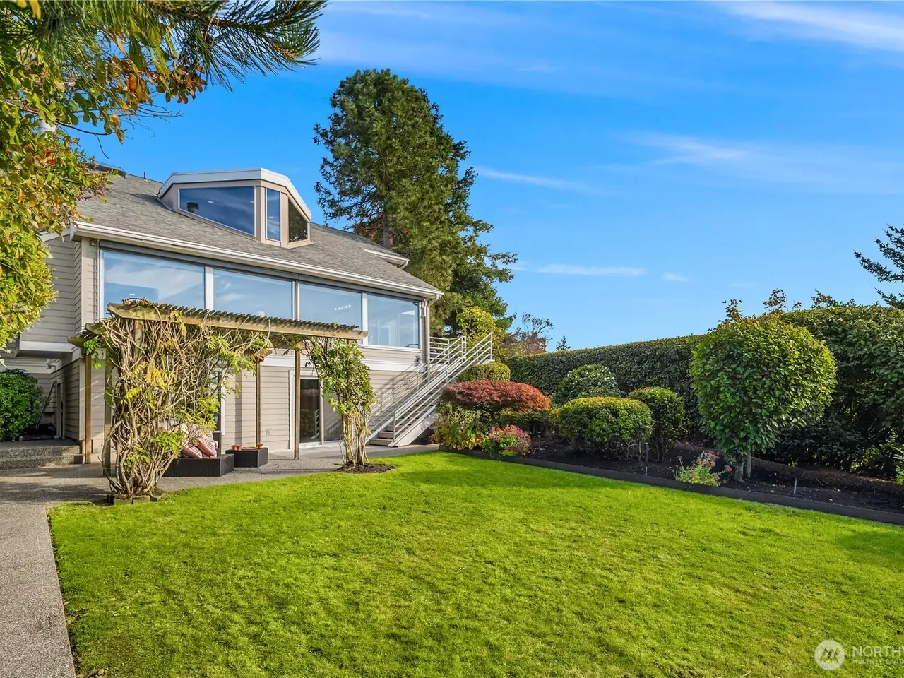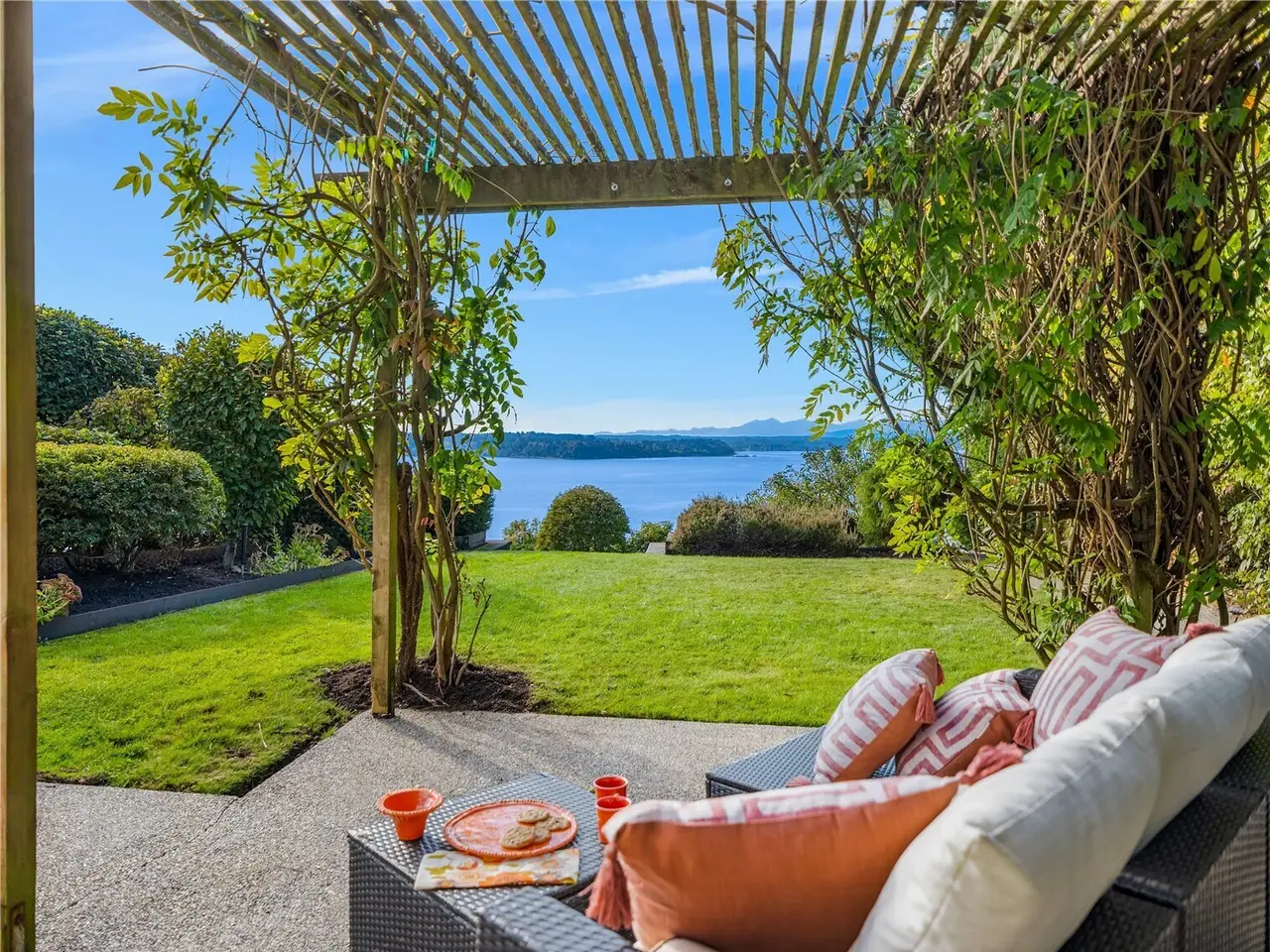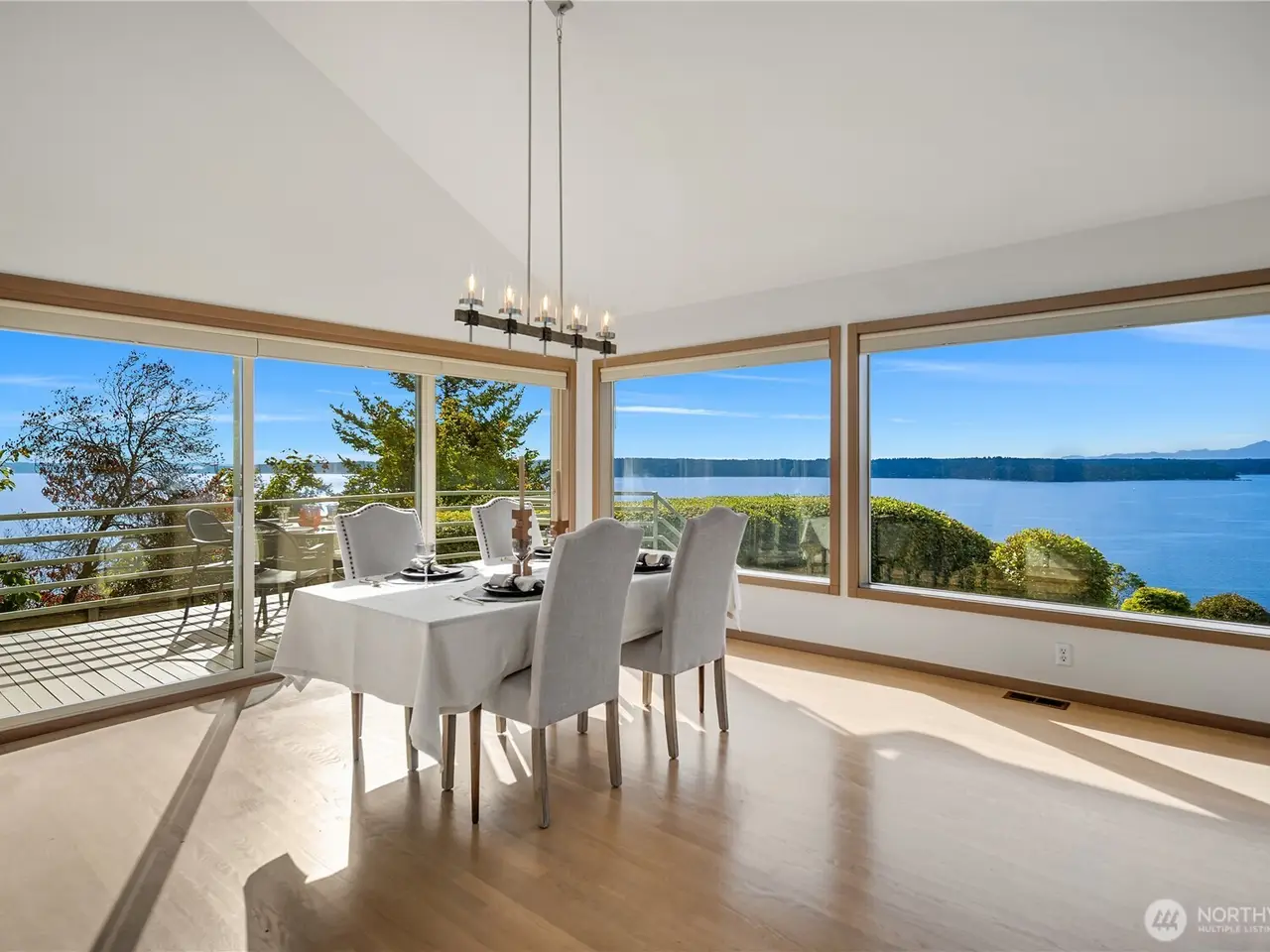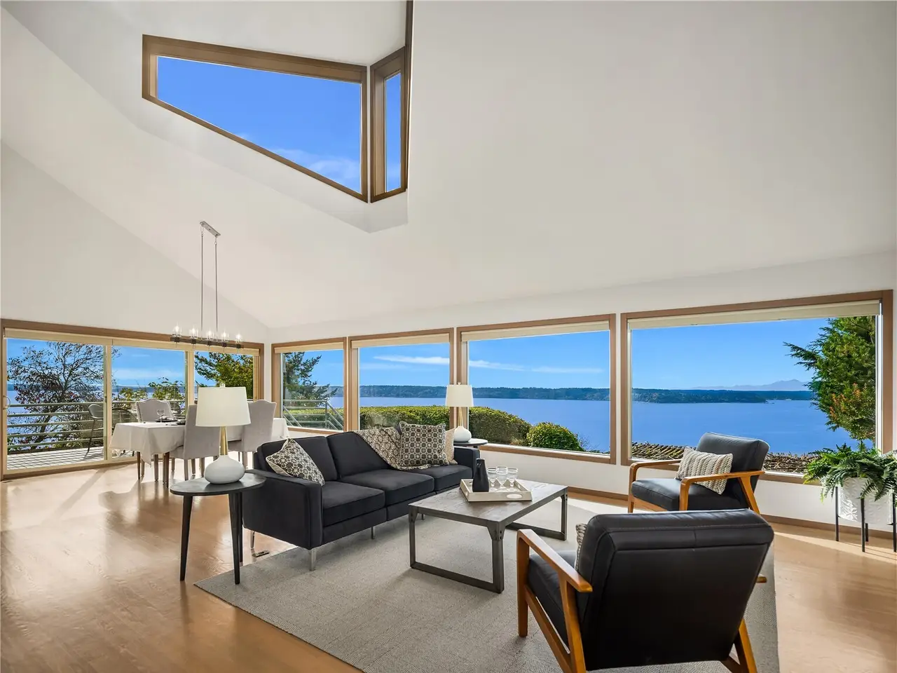 Amazing Northwest Contemporary home. Quiet and Peaceful. Sweeping Puget Sound views from all floors. Exceptional craftsmanship. Expansive living and dining areas. Family room next to gorgeous kitchen with dining nook and top of the line appliances. Upper floor features three bedrooms, two fantastic baths, and sitting or playroom loft space. Downstairs has huge rec room, or use as 2nd primary suite, with glass doors leading to patio and backyard. Office area, exercise room too. New interior paint, carpet, and tile. Beautifully landscaped. Privately tucked away from street down circular driveway that accesses two garages. 2nd garage has electric, water, and sewer for potential extra unit. Level entry. A truly grand property. Whole house A/C!