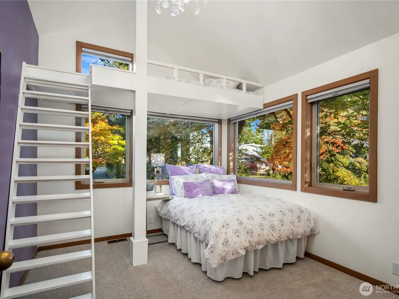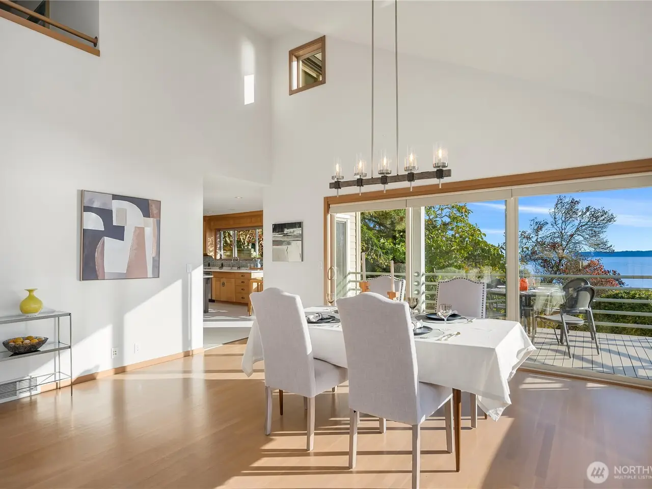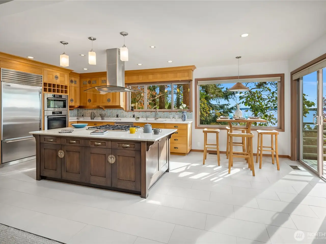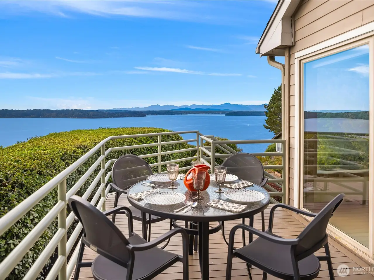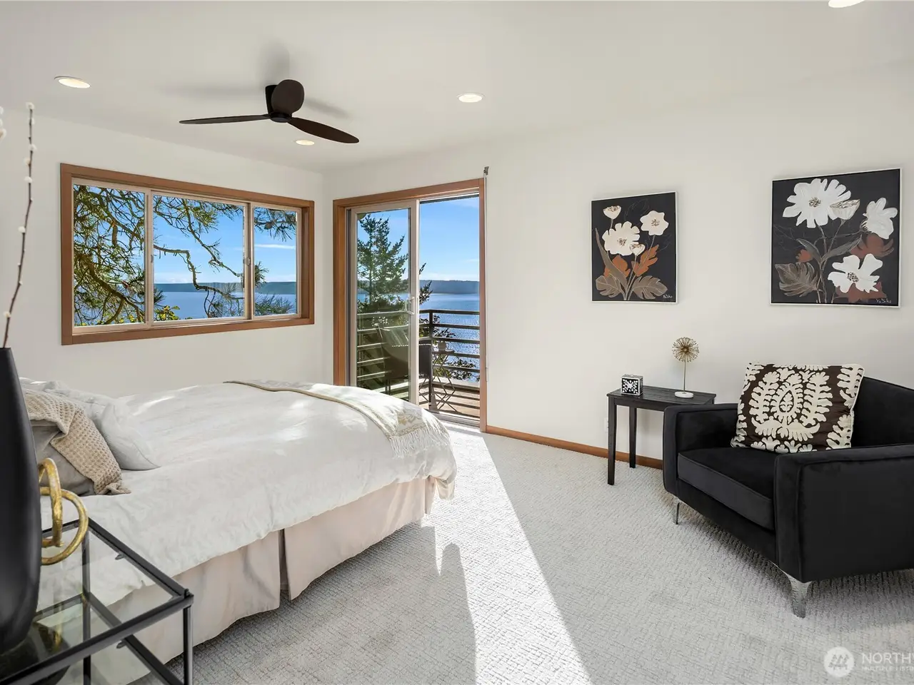 Amazing Northwest Contemporary home. Quiet and Peaceful. Sweeping Puget Sound views from all floors. Exceptional craftsmanship. Expansive living and dining areas. Family room next to gorgeous kitchen with dining nook and top of the line appliances. Upper floor features three bedrooms, two fantastic baths, and sitting or playroom loft space. Downstairs has huge rec room, or use as 2nd primary suite, with glass doors leading to patio and backyard. Office area, exercise room too. New interior paint, carpet, and tile. Beautifully landscaped. Privately tucked away from street down circular driveway that accesses two garages. 2nd garage has electric, water, and sewer for potential extra unit. Level entry. A truly grand property. Whole house A/C!