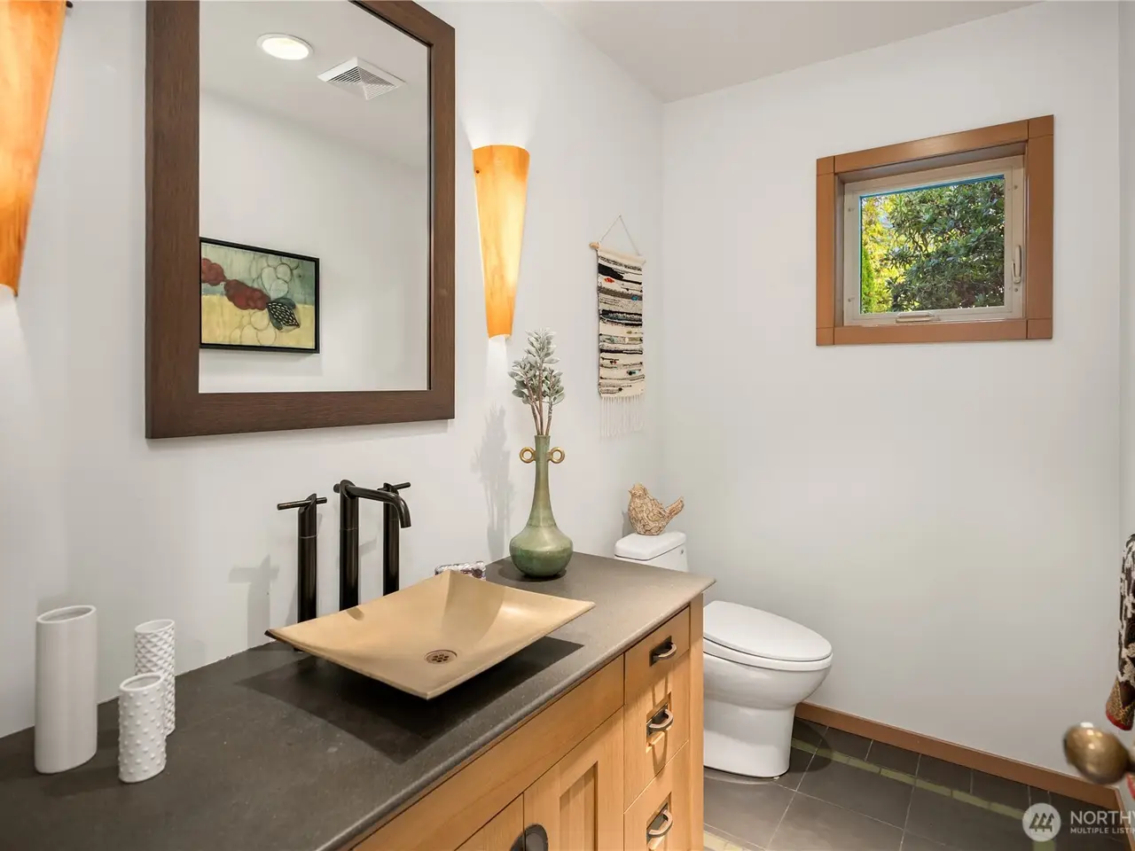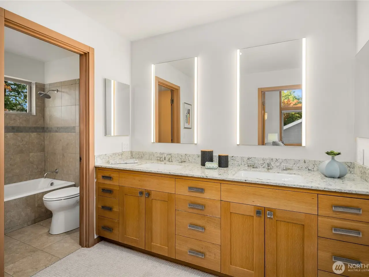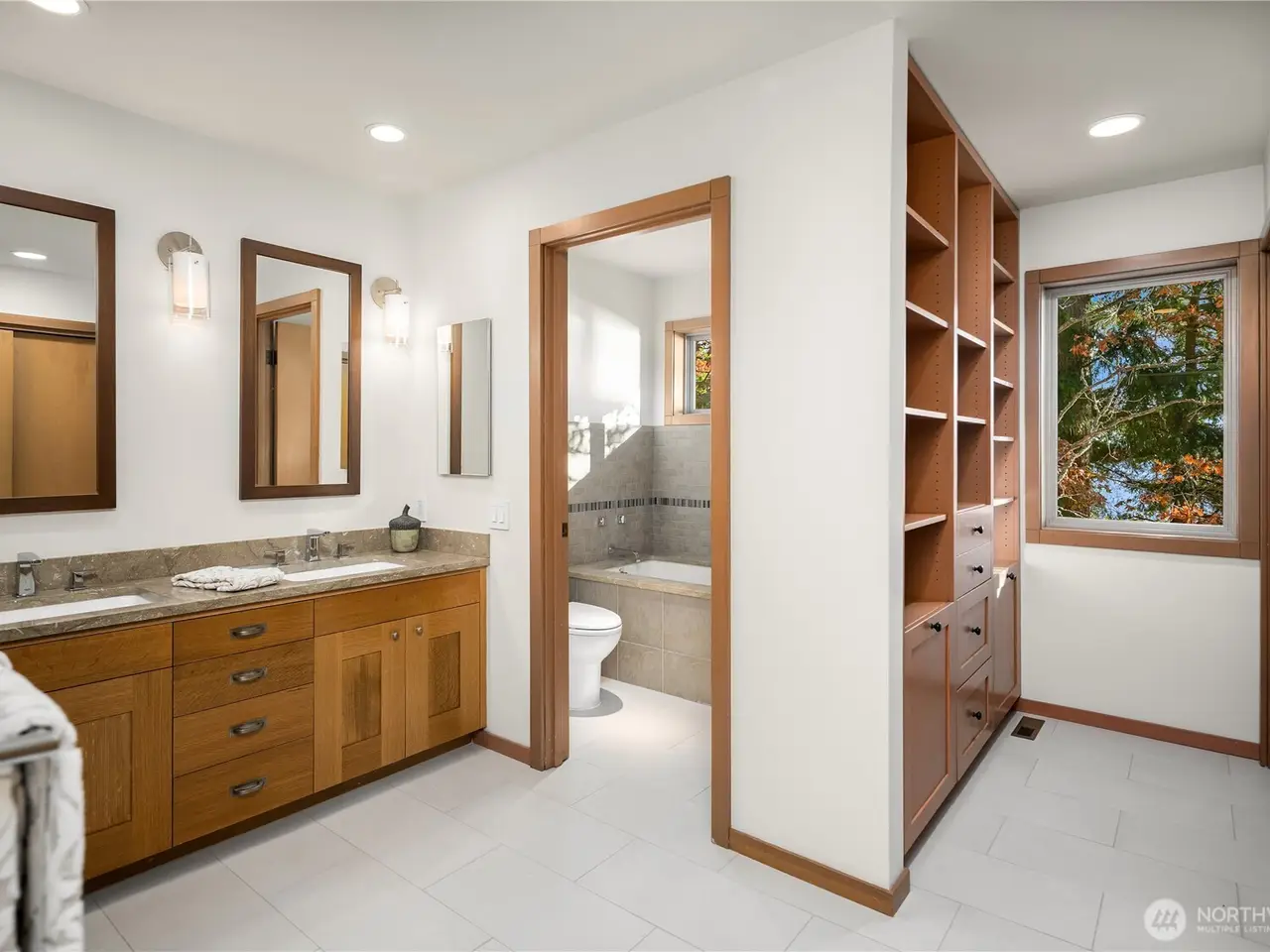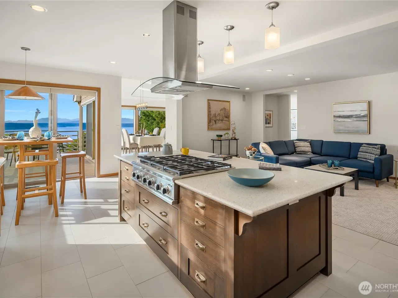 Amazing Northwest Contemporary home. Quiet and Peaceful. Sweeping Puget Sound views from all floors. Exceptional craftsmanship. Expansive living and dining areas. Family room next to gorgeous kitchen with dining nook and top of the line appliances. Upper floor features three bedrooms, two fantastic baths, and sitting or playroom loft space. Downstairs has huge rec room, or use as 2nd primary suite, with glass doors leading to patio and backyard. Office area, exercise room too. New interior paint, carpet, and tile. Beautifully landscaped. Privately tucked away from street down circular driveway that accesses two garages. 2nd garage has electric, water, and sewer for potential extra unit. Level entry. A truly grand property. Whole house A/C!