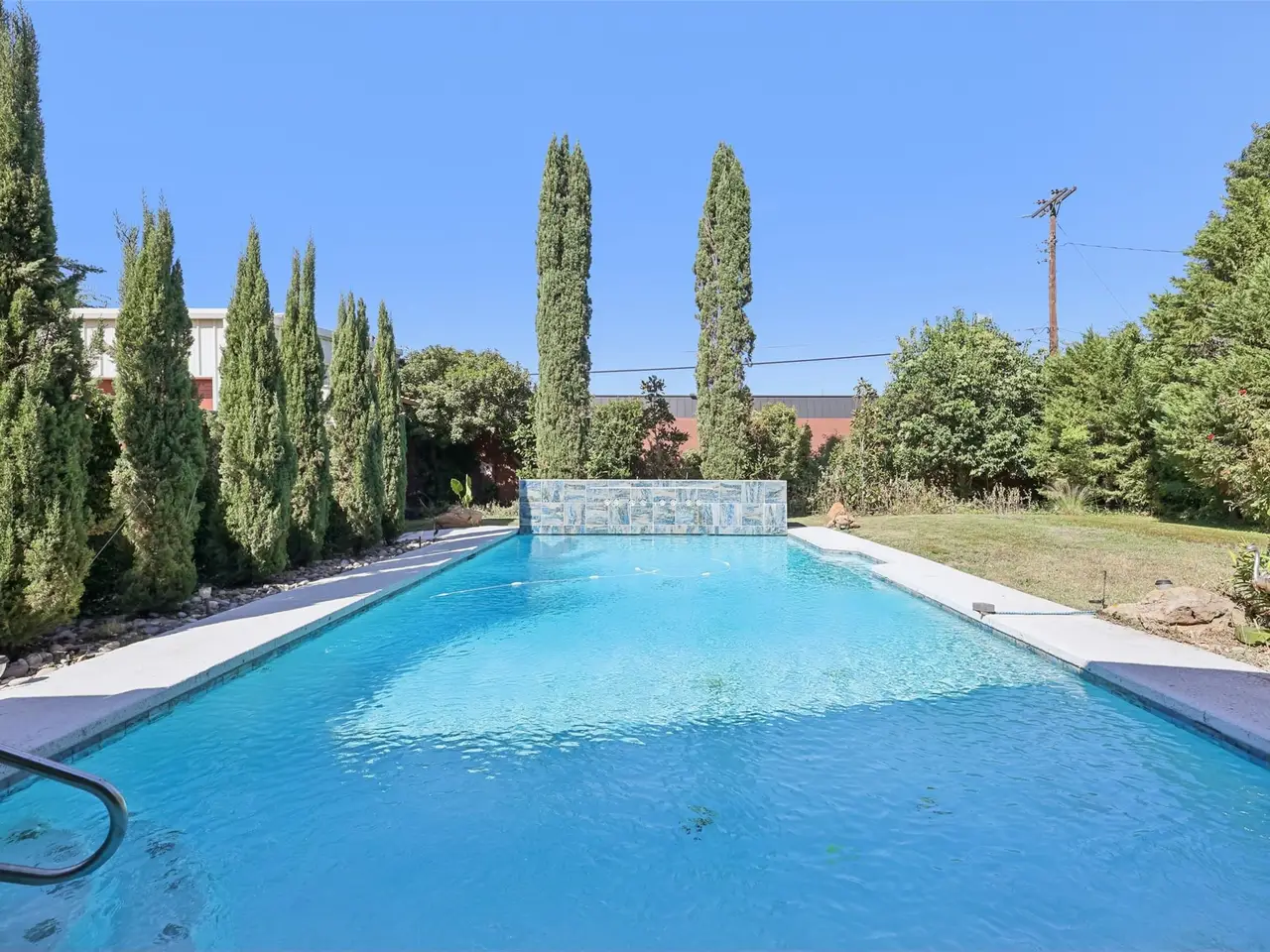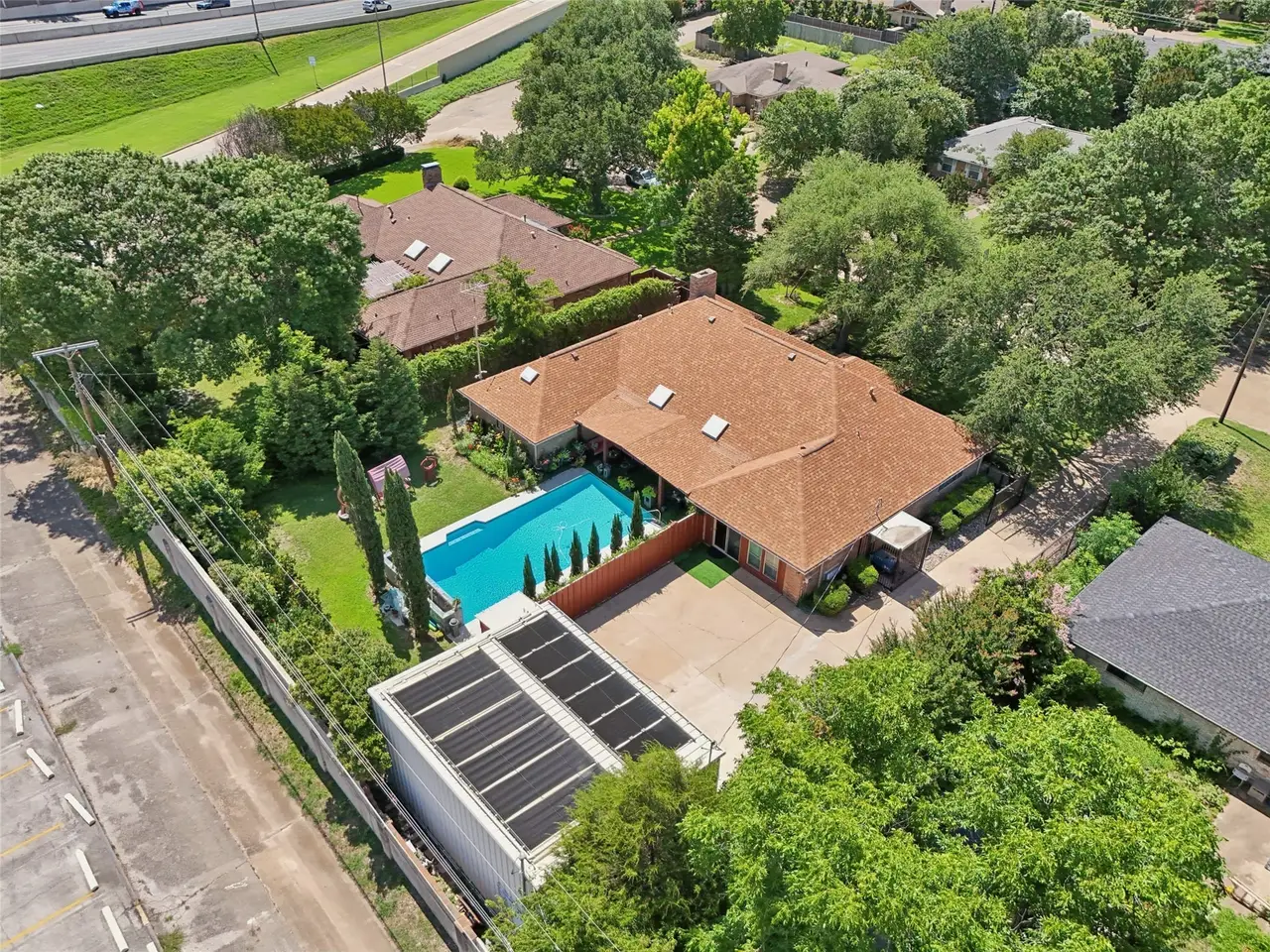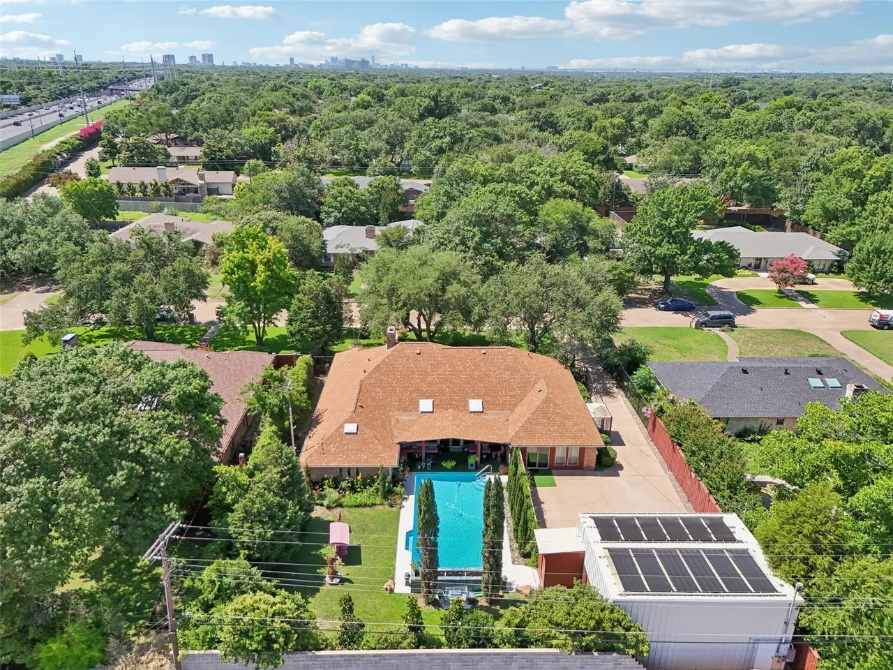 THIS IS A GREAT HOUSE located in one of the hottest areas of Dallas, and in a dynamic economic powerhouse area in the private school corridor, a beautifully maintained single-story home on a large lot with magnificent mature trees, where many happy memories were made. This residence features four bedrooms (or three bedrooms and a den), three bathrooms, three living areas, and two dining areas, blending timeless style with modern comfort. Features include gleaming wood floors, abundant natural light, and serene views from nearly every room. The renovated kitchen features a breakfast bar, a 6-burner gas cooktop, and a stainless-steel refrigerator. Adjacent breakfast nook with built-ins overlooks the sparkling pool. Enjoy multiple flexible living spaces, including a totally private, split red-painted guest room or den; an atrium that connects you to nature; and a covered patio for year-round outdoor living. The heated pool, powered by solar panels, invites swimming year-round. The formal living area features a vaulted ceiling, fireplace, and hidden wet bar. The primary suite features his-and-hers bathrooms, dual walk-in closets, a renovated bathroom with a walk-in shower, a spa tub, and a bidet toilette. Additional highlights: detached 26' x 20' 2-car garage with side entry and electric gate, large area for RV parking, French drains, cedar-lined closets throughout, roof replaced in 2021, and more. Seller offers a $5,000 allowance for the buyers choice of fixtures. This exceptional home combines elegance, comfort, and convenience in one of Dallas' most desirable areas!