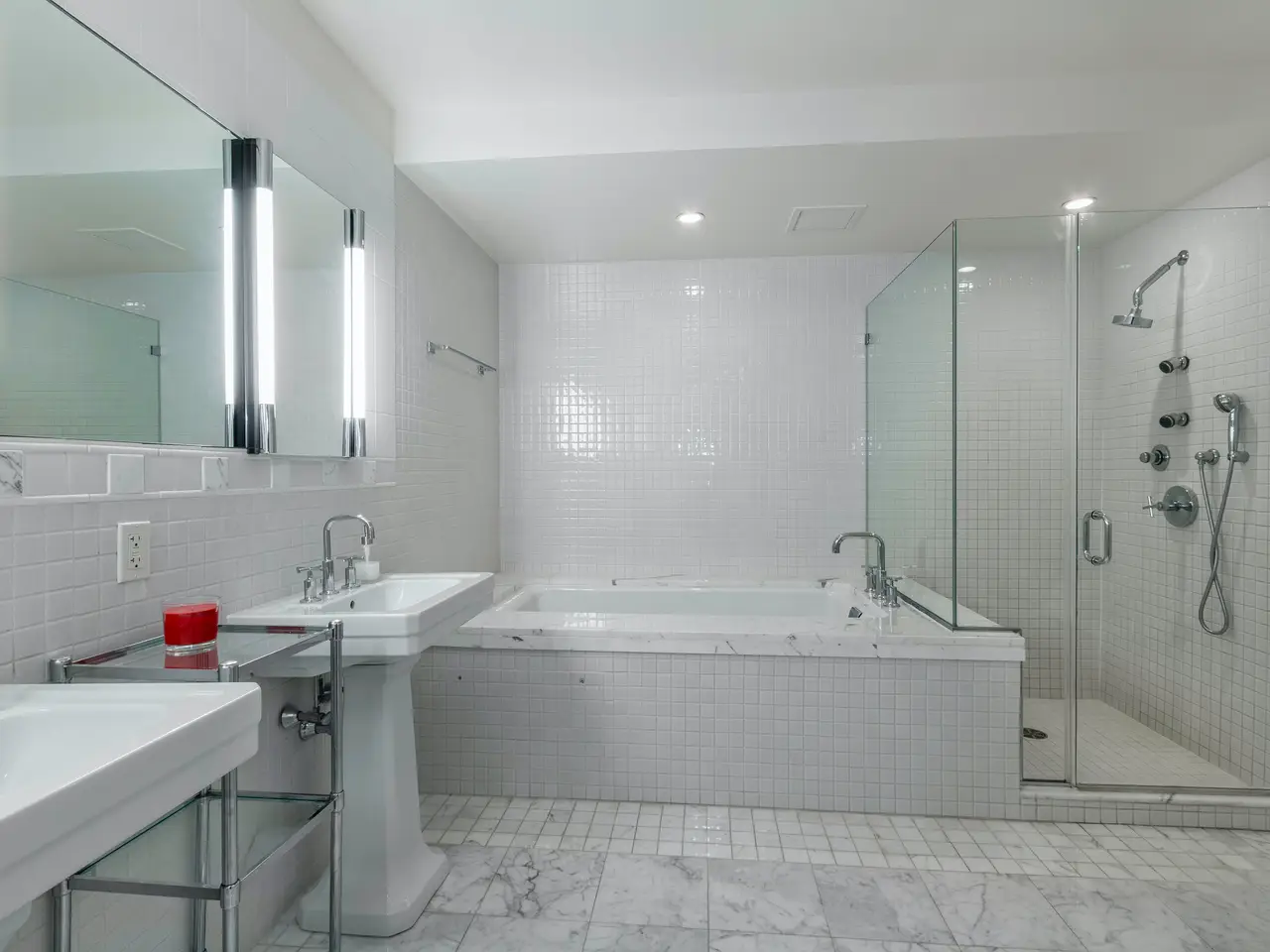 • Shared bath with double vanity, separate tub, and walk-in shower