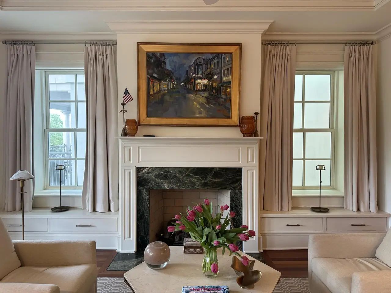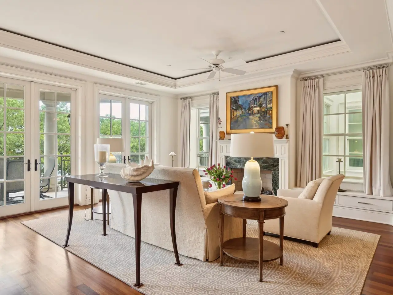 Factors Walk: the best there is in location, style, and maintenance-free luxury. Designed by Goff D'antonio Architects with historic Charleston as inspiration, this Classical Revival building has become a waterfront landmark. Distinguished by triple tiered columned porches overlooking the park, the Palladian style is continued in limestone-trimmed true stucco construction on a piano noble base. Apartment 3A is the largest of only 7 residences and runs the full depth of the building from the front piazza to a solarium at the rear. Parkside entry for guests with stone steps and gas lanterns. A coded elevator is accessed from secured garage parking, or from the gated garden entry. Grand rooms with floor to ceiling windows. Spectacular kitchen with fine cabinetry, three fireplaces, mahogany paneled elevator, piazza with columns and stone flooring, hurricane proof windows and doors, primary bedroom with fireplace and sitting room/office, building and residence security systems. Currently set up as a two bedroom, the library can easily be converted back to third bedroom.