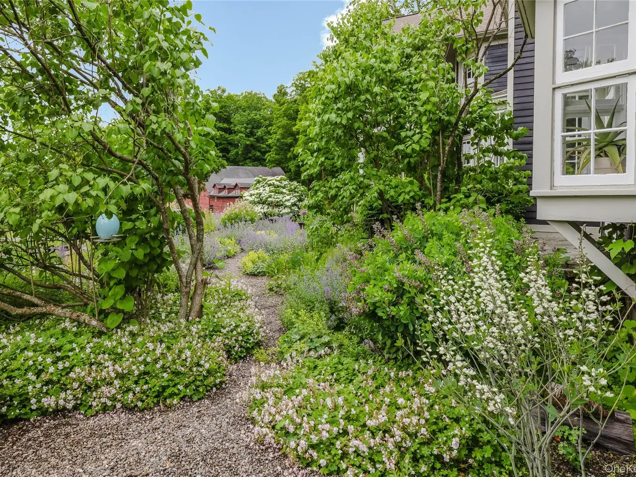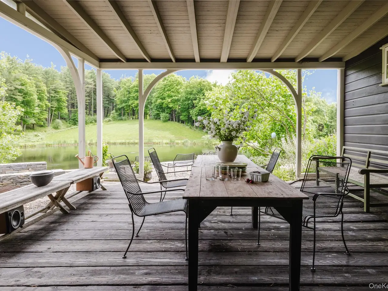 Welcome to Mac Brown Waterhouse, a storied 119-acre estate set within a hidden valley offering complete seclusion and timeless beauty. The original 1830s farmhouse is tucked away at the end of a private lane in Claverack, NY, where the road terminates in a round gravel driveway anchored by the property's original stone well. Two large ponds grace the land, one directly in front of the house that is aerated and swimmable. Sited among meadows and mature woodlands, the main house, upgraded barn, and charming studio shed are framed by terraced stonework, a network of trails, and thoughtfully designed gardens. The setting is peaceful, restorative, and deeply connected to the land, yet only a short drive to both Hudson and Great Barrington. The antique farmhouse offers four bedrooms and two bathrooms across 2,825 square feet, where original details like moldings, wood floors, and Dutch doors preserve its old-world charm. A generous double living room and an office nook outfitted with Vitsoe modular shelving, lead to a bright dining area, kitchen, and direct access to the patios and gardens. The layout encourages an easy indoor-outdoor rhythm, with covered porches, and multiple terraces for lounging, cooking, or gathering. Two staircases rise to the upper-level bedrooms, where the southern exposure fills each room with light, and the attic has been insulated to improve year-round comfort. Throughout the home an intentional color palette lends softness and cohesion. The overall design brings together European sensibility and Hudson Valley character, balancing utility with ease, warmth, and quiet sophistication. Across the garden sits a fully insulated, historic barn that has been transformed into a large-scale creative studio, complete with a bathroom with a clawfoot tub, kitchenette, updated electrical and HVAC. A detached potting shed offers another versatile space, ideal as a garden studio, writer's nook, or future guest cottage. Its connected to an outdoor bath deck that invites restorative soaks beneath the stars with its fireplace, clawfoot tub, and outdoor shower. Next to the house, a carport with EV charging and a full-property generator ensures comfort and continuity year-round. The primary pond is the centerpiece of the property - aerated, swimmable, and bordered by a pebble beach and firepit. It's ideal for swimming, birdwatching, or evening gatherings. Cranes, herons, and even bald eagle sightings make it a birdwatching paradise. Terraced gardens by The Secret Gardener surround the home with a cottage-style blend of flowering plants, herbs and vegetables. Rewilded fields and meadows lead to two miles of maintained trails through native grasses and towering trees. The land qualifies for a forestry exemption and includes multiple cleared areas, offering potential for a guest house, horses, or even a helipad. Whether hosting music on the lawn, harvesting from the garden, or watching the changing sky reflect in the pond, Mac Brown Waterhouse is a rare legacy estate and true sanctuary.
