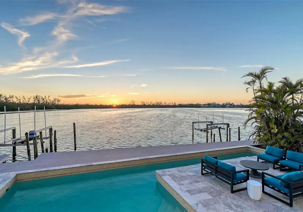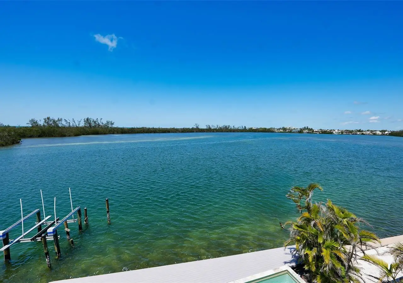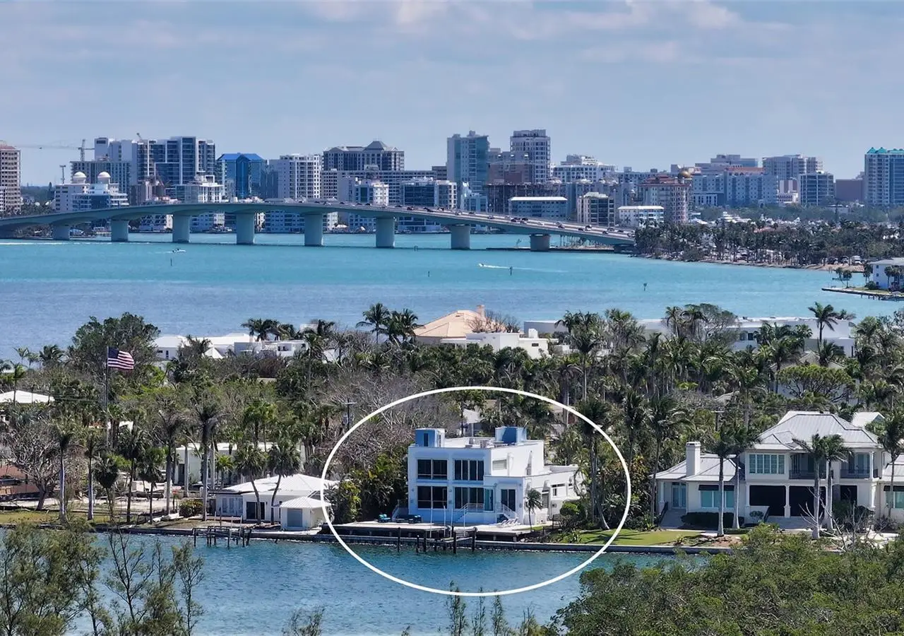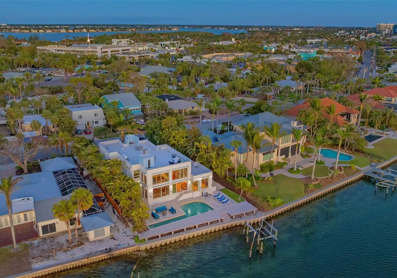 Owner has priced to sell this one-of-a-kind modern masterpiece, ideally positioned on premier boating water with sweeping, unobstructed views of the Bay and Gulf of Mexico. This exceptional residence offers a rare blend of architectural elegance and coastal sophistication, all within walking distance to the fine dining, boutiques, and cultural charm of St. Armands Circle. Floor-to-ceiling windows and soaring ceilings flood the home with natural light, while framing the mesmerizing water vistas from nearly every room. Designed for the discerning buyer, the gourmet kitchen features top-of-the-line Thermador appliances, including a newer refrigerator, wine cooler, and a professional-grade 6-burner gas range. The expansive floor plan includes four bedrooms and four bathrooms, highlighted by a serene upstairs primary suite with a private enclosed sunroom - currently serving as a tranquil home office. Meticulously maintained, the home boasts a brand-new roof (2024), a recently replaced seawall (2017), and dual-zoned Rheem AC systems. Additional features include electric hurricane shutters on most major windows, a whole-home speaker system, and lush, mature landscaping complemented by a secure gated entrance that enhances both privacy and curb appeal. The rooftop terrace offers a breathtaking vantage point for sunset views over the Gulf, completing this unparalleled offering. A true sanctuary for those seeking refined waterfront living.