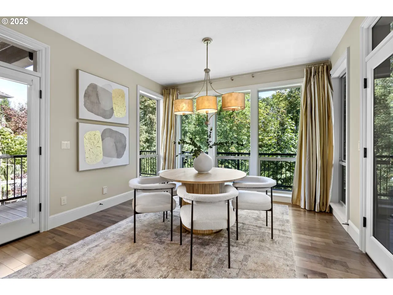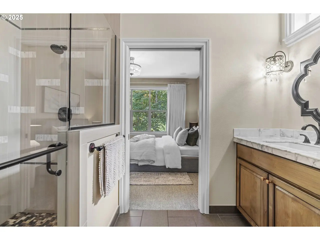 Nestled on a quiet cul-de-sac and backing to a peaceful, tree-lined greenbelt, this exceptional home offers 3,135 square feet of refined living on nearly half an acre. The home is the proud Clark County Parade of Homes recipient of "Best in Show," "Best Livable Floor Plan," and "Best Landscaping." The expansive open-concept great room is anchored by vaulted ceilings, a dramatic floor-to-ceiling tiled fireplace, and custom built-ins, with massive windows that flood the space with natural light. A state-of-the-art Control4 system offers fully integrated smart home technology, including lighting, climate, audio, security, and intercom controls. The designer kitchen features a quartz and butcher block island, Italian Dolomite marble backsplash, glass cabinet handles, premium Dacor appliances, over-range pot filler, LED under-cabinet lighting and dual pantries. The adjoining dining area flows seamlessly to the outdoor living space, making entertaining effortless year-round. Two main-level ensuite bedrooms offer spa-inspired bathrooms with zero-entry showers, marble countertops, radiant heated floors, and direct access to the outdoors. Upstairs, you'll find a third bedroom, full bath with skylight, and a vaulted-ceiling fourth bedroom or bonus room/flex space. The dedicated office features custom built-in desks and cabinetry. Out back is a wraparound deck and a vaulted covered outdoor kitchen complete with built-in BBQ, beverage fridge, wine cooler, gas space heater, ceiling speakers, and TV hookup--ideal for outdoor gatherings. The professionally landscaped yard is illuminated with programmable LED lighting. Additional features include hot/cold water hookup in garage, central vacuum system, tankless H20 heater, and triple-pane windows. Blending timeless craftsmanship with 21st-century modern luxury, here is your rare opportunity to own one of Felida's finest homes.