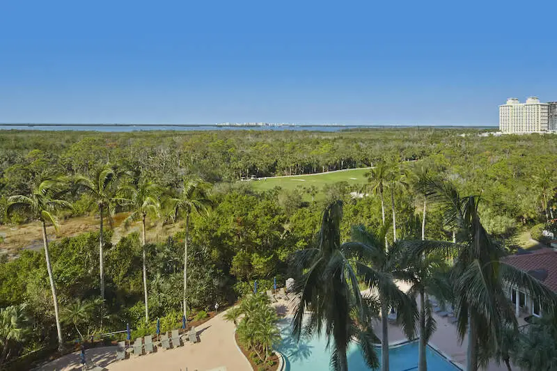 Great views of the Colony golf course as well as the Bay, come see this "sky home" offering two bedrooms a den and three full baths. Private elevator entry. Immaculate condition. Ten foot ceilings throughout and a "thru view" brings plentiful natural light throughout the residence and balconies to enjoy both sunrise and sunset. Enjoy the light and bright kitchen which is open to the main living space. Two spaces in the garage. Treviso offers lots of activities, rain or shine, with a lovely theatre, vast social spaces including a billiards room, a newly updated fitness facility, complete with sauna. And then outdoors, enjoy a generous lagoon-style swimming pool, hot tub and indoor-outdoor pavilion with gas grills. Three guest suites and one offering a full kitchen with two bedrooms and two baths. Privacy officer to greet you, your guests and manage packages and vendors. Treviso, located inside The Colony at Pelican Landing, offers all residents a private beach park accessed by water taxi on the half hour, private waterfront dining at The Bay Club, two canoe and kayak parks, immense tennis program, pickle ball, bocce, sailing and many social events to join. Perfectly located just a mile from fine dining and shopping and a swift trip to airport.