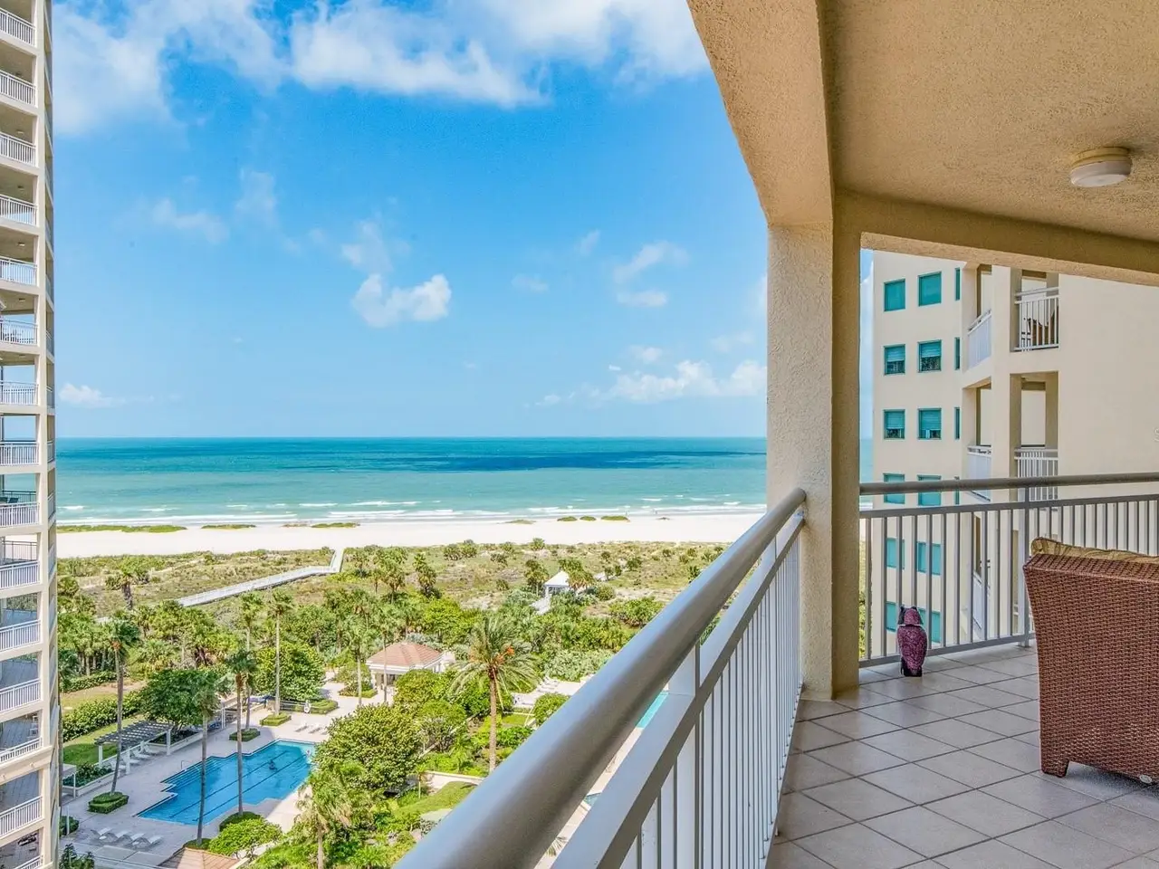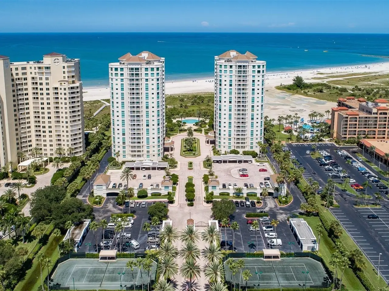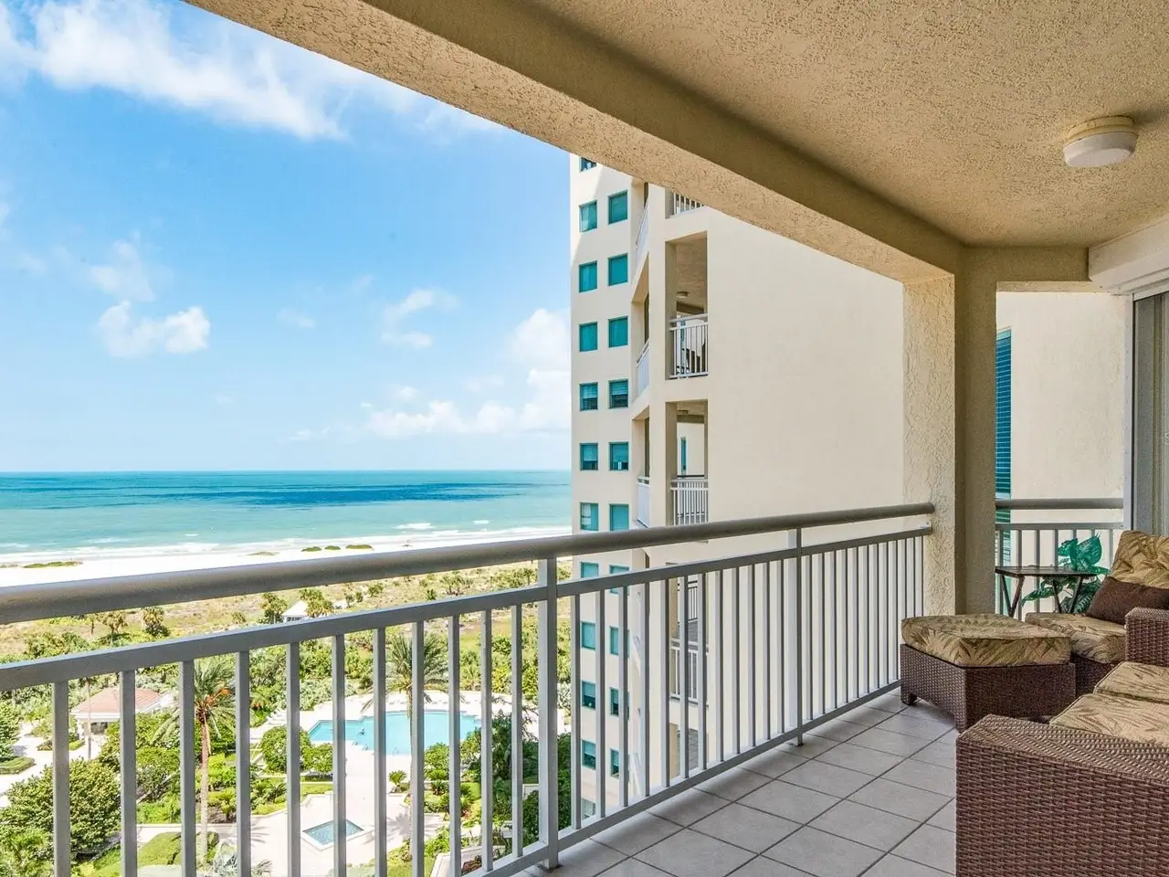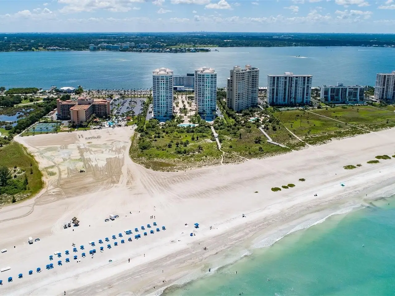 WELCOME to one of the most prestigious BEACHFRONT developments located in all of Tampa Bay / Clearwater / St. Pete, The GRANDE on SANDKEY. This beautiful, well maintained southeast corner residence has been recently updated featuring: neutral ceramic tile throughout, solid stone kitchen countertops, solid wood cabinetry, back flow unit installed in kitchen sink, hurricane storm shutters, murphy bed in bonus den room, new air conditioning unit, new water heater, new washer & dryer, and duct work cleaned and disinfected in 2024. Balcony views from the primary bedroom view North Eastward to the intracoastal waterways, Sand Key bridge, Memorial Causeway, and Clearwater / Belleair inland. The wraparound balcony (kitchen, living room, bonus room) views span across the intracoastal waterways, main inland, overlooking the pool grounds and out to the open Gulf of Mexico. The Grande's superb amenities include: two swimming pools, large outdoor spa, cabanas, outdoor pavilion for your grilling pleasure, fitness center, tennis courts, spacious social room for gatherings or events, billiard room, concierge services, and 24-hour security. In addition, the Sand Key Plaza (directly across the street) houses small boutiques, several restaurants, and Sand Key Realty. Take a tranquil stroll on Sand Key beach, or travel 1 mile North to visit North Americas #1 beach. As the day comes to a conclusion, you will witness the most serene and majestic sunsets while relaxing by the pool side or your wrapped around balcony. Paradise awaits you at The Grande on Sand Key...