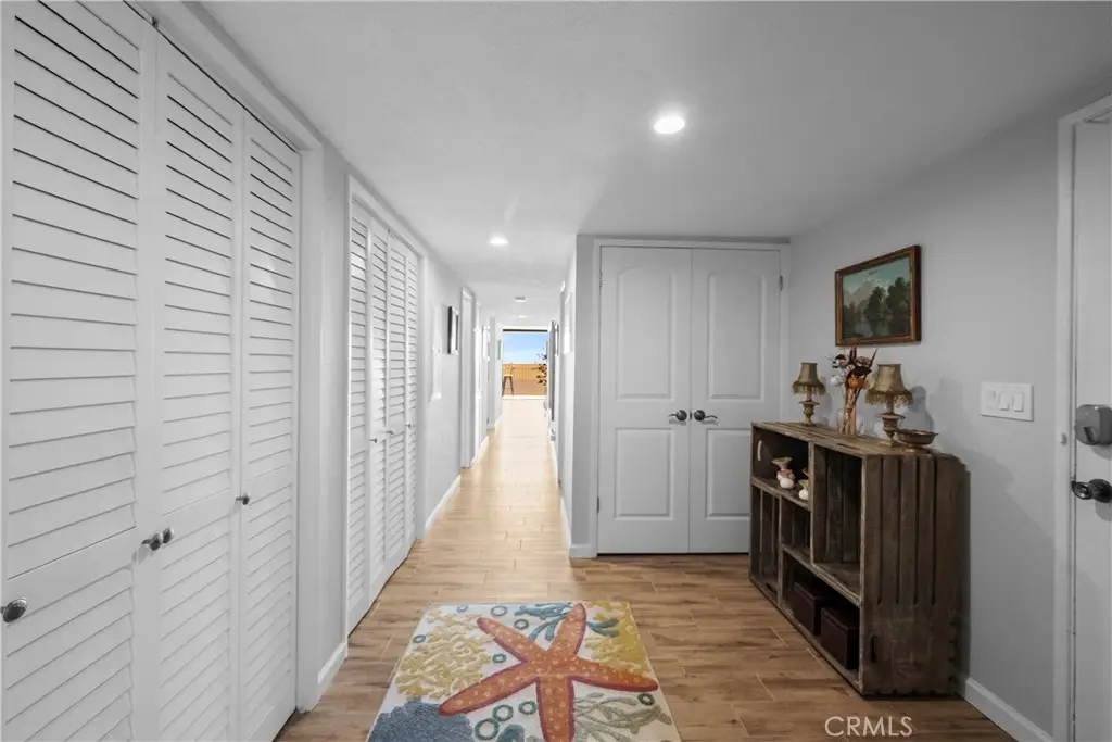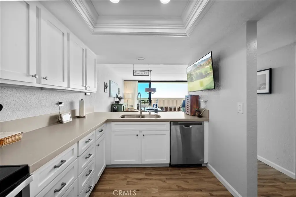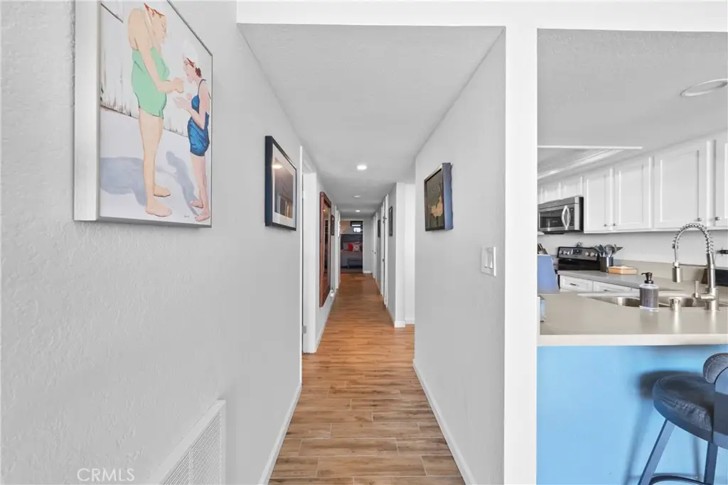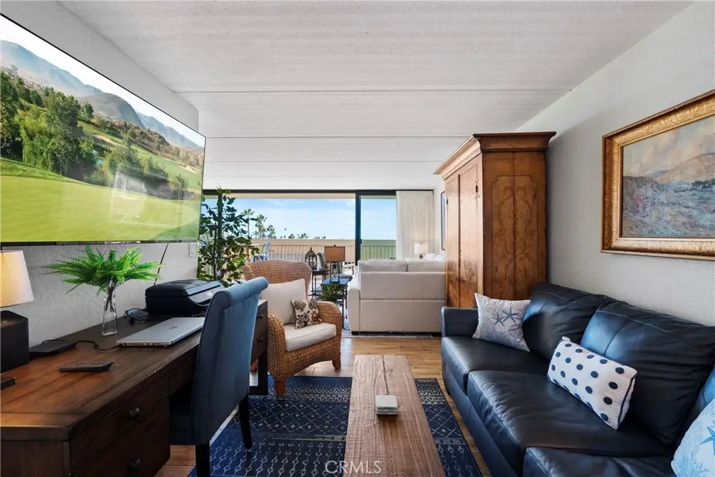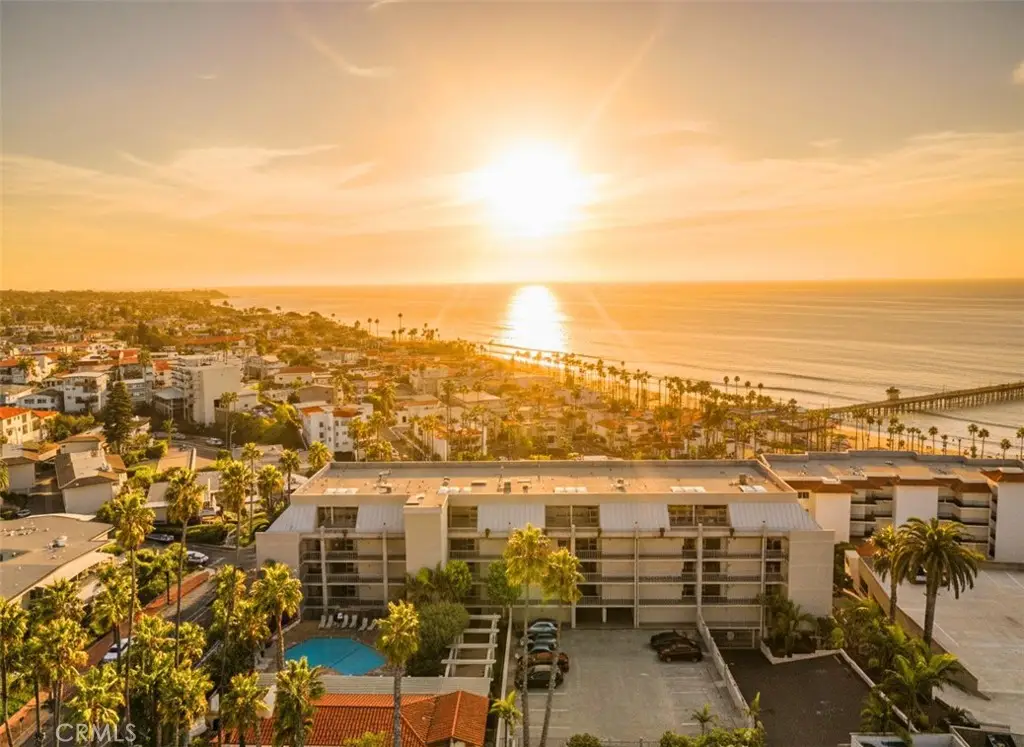 Step into this beautifully refreshed beachside condo where open design and ocean breezes define the lifestyle. The expansive layout connects the kitchen, dining, living, and office areas, all flowing to full-height sliding glass doors that span wall to wall. Natural cross-ventilation brings in fresh coastal air year-round, enhanced by one of the most temperate climates anywhere. The kitchen shines with updated countertops, crisp interior paint, and modern closet doors in a clean gray, white, and blue palette that echoes the sea just outside. A full-width deck makes dining indoors or out equally inviting, while abundant storage is found throughout--four hallway closets, a full wall of storage in the primary suite, and generous kitchen cabinetry. The primary suite includes a private en-suite bath, while the second bedroom is served by a hall bath nearby. Originally a three-bedroom floor plan, the third room has been opened to create a flexible office off the living area--its closet remains intact for extra storage or workspace. Convenience continues with an in-unit washer/dryer tucked into one of the hall closets. Two reserved garage spaces make beach trips effortless, while community amenities include a pool, clubhouse, full elevator access, and a trash room on every floor. Just steps away you'll find world-renowned surfing, calm swimming beaches, pier-front dining, downtown attractions, and a trolley system to explore the coast.