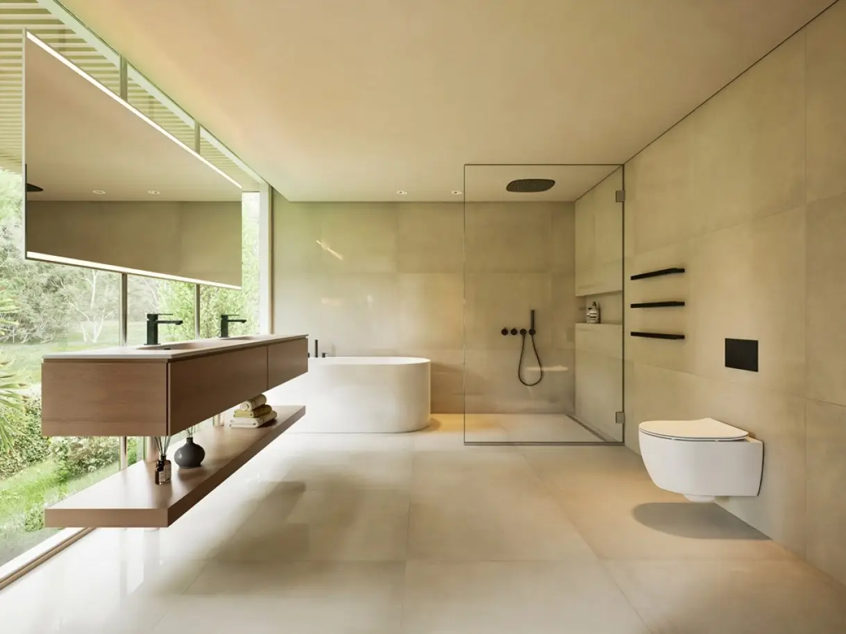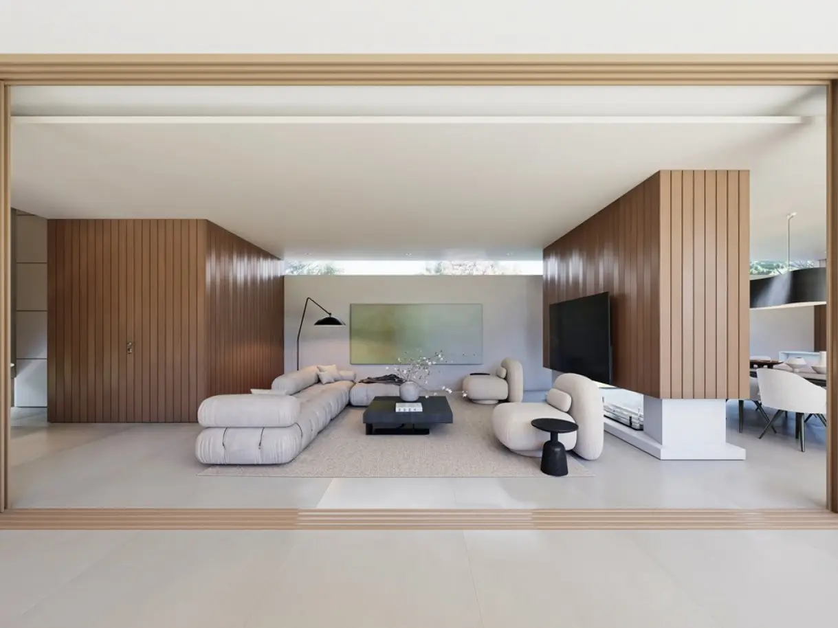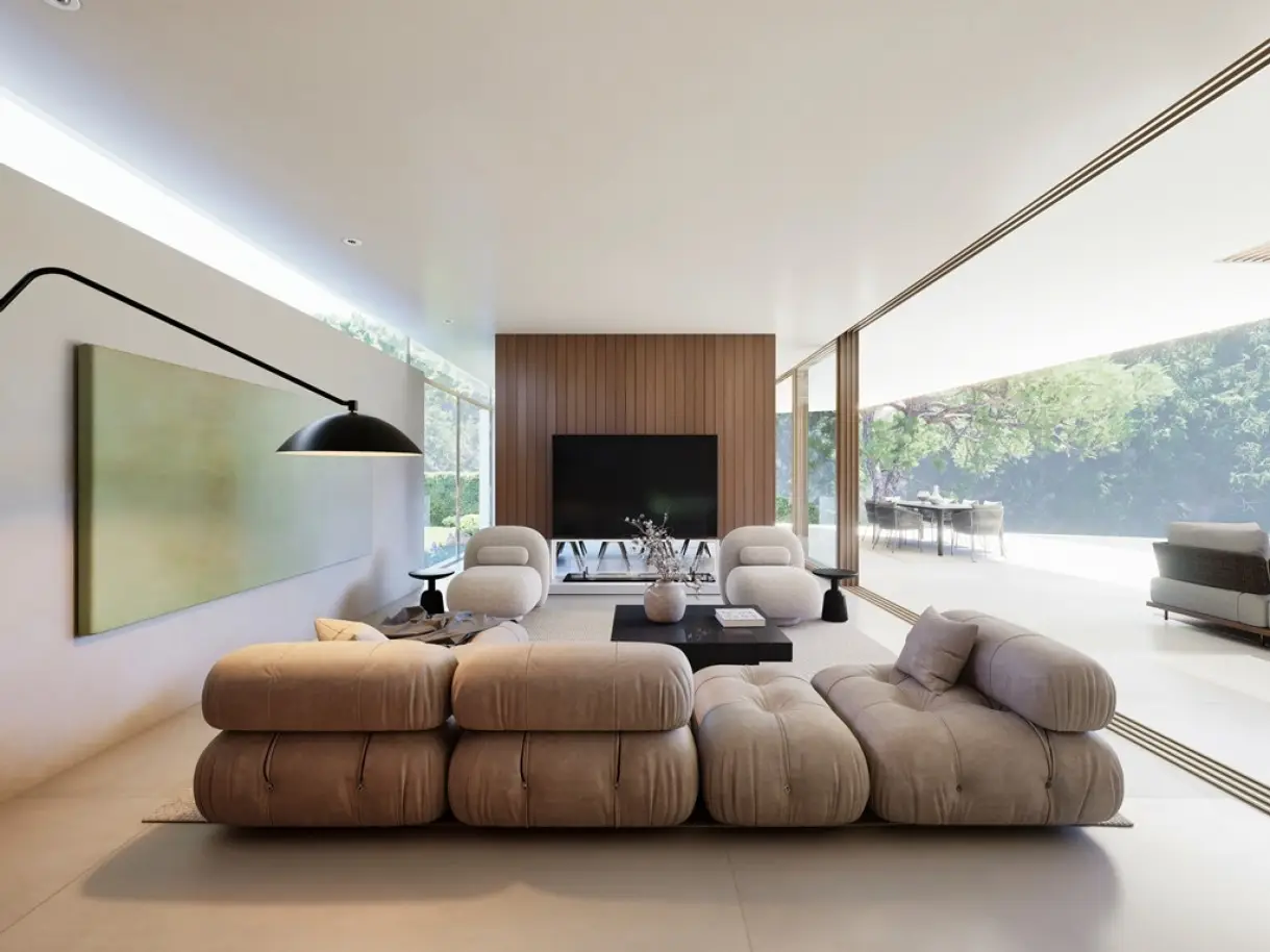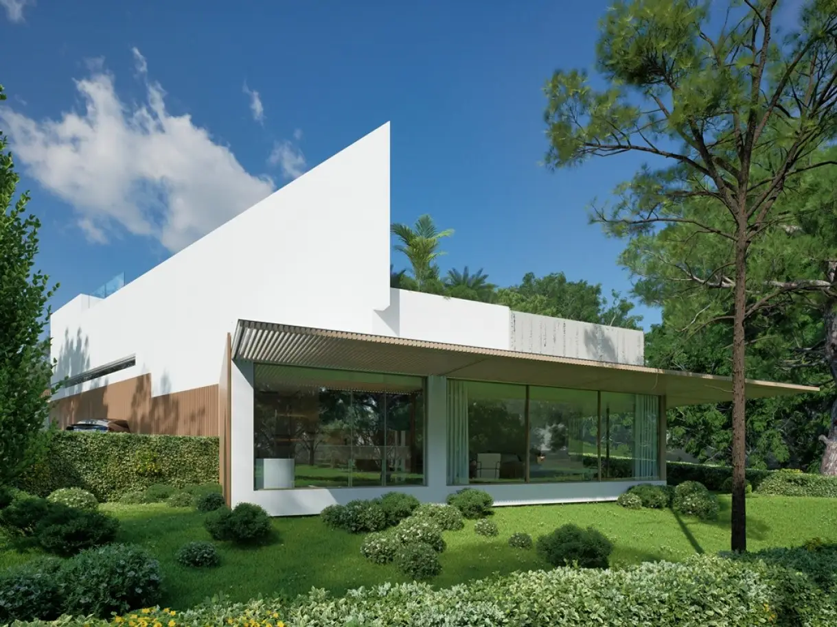 • Modern architecture with large windows and natural light
