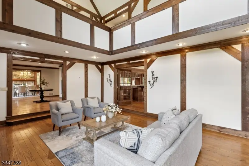 This exceptional 5-bedroom, 5.1-bath estate is a rare find, blending architectural interest with inspired design and functionality. Nestled on a quiet cul-de-sac in one of Scotch Plains' most desirable neighborhoods, it sits on 1.34 park-like acres with amenities for entertaining and everyday living. A striking stone exterior opens to expansive rooms, hardwood floors, five fireplaces, and a dramatic two-story living room with a spiral staircase to a wrap-around library. The chef's kitchen, renovated in 2019, features a 60" Lacanche range imported from France, dual Sub-Zero refrigerators, two dishwashers, and custom cherry cabinetry. The luxurious primary suite offers dual walk-in dressing closets, a spacious sitting area retreat with fireplace, and a private spiral staircase to a loft, creating a true spa-like escape. Multiple formal and informal living spaces make gathering easy. The third floor and finished lower level provide additional retreats, including two bedrooms, a full kitchen, wet bar, full bathroom, entertainment areas, game rooms, exercise room, and separate garage entrance. Outdoors, enjoy a heated in-ground pool and spa, three patios, a gazebo with lighting and integrated sound system, professional landscaping, and privacy on all sides. Two garages accommodate five cars, with the detached garage offering a workshop and additional storage.