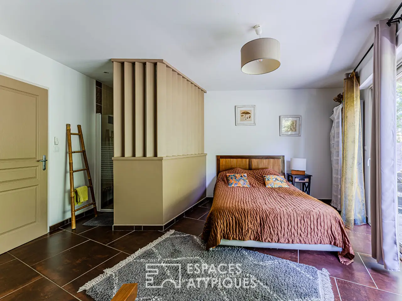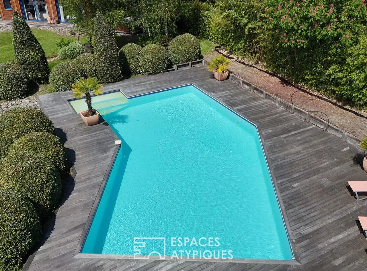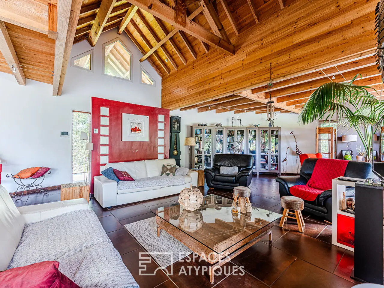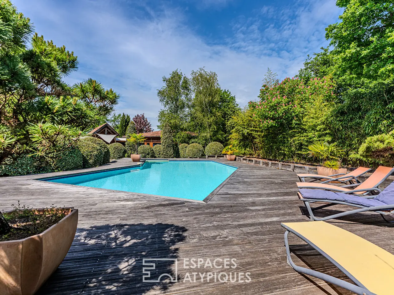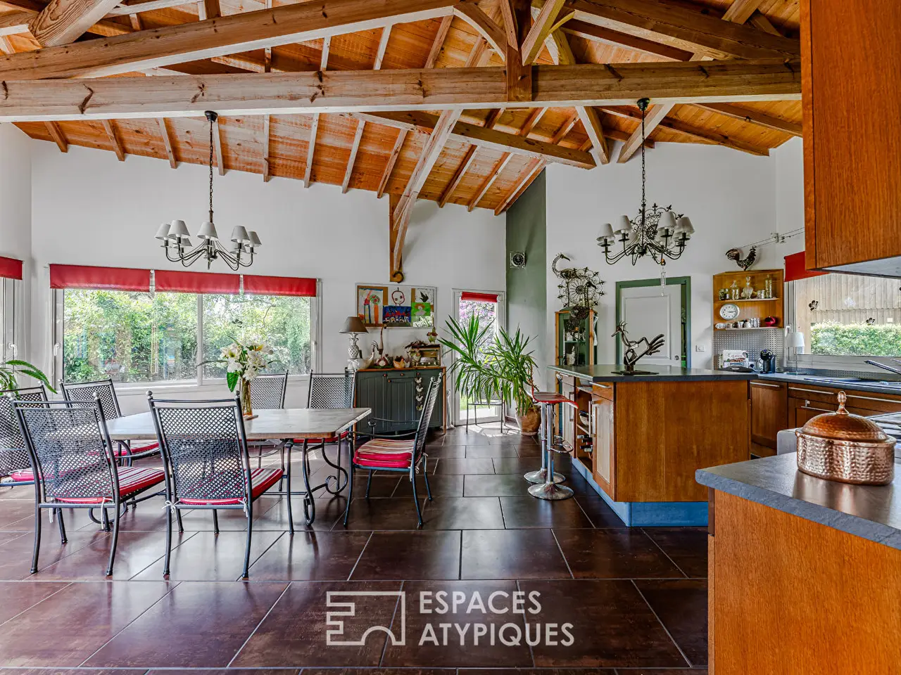 Nestled in a quiet, green setting in Biscarrosse, this architect-designed timber-frame house offers 243 sqm of living space on a landscaped plot of 2,800 sqm.Entirely designed to offer exceptional living comfort, it stands out for its generous volumes, contemporary lines, and large swimming pool, in a permanent dialogue between interior and exterior.This unique living space blends harmoniously into its natural environment. The interior spaces are organized around a vast cathedral-style living room bathed in light, thanks to the numerous openings that offer unobstructed views of the garden.The kitchen, open to the dining room, also connects to an outdoor terrace, naturally extending the living spaces. The house offers four bedrooms, including a master suite, as well as two bathrooms.The fluid layout of the spaces creates a soothing atmosphere, conducive to relaxation and conviviality. The park, designed by a landscaper, creates a natural setting of great beauty : local vegetation, a romantic pond, and a variety of species invite serenity.The space formed by the swimming pool and its pool house evokes an oasis surrounded by greenery.A house with a strong architecture, it seduces with the rare harmony between nature, design, and comfort. This atypical property offers high-end services, ideal for a primary or secondary residence.The residential environment is sought after for its tranquility and its proximity to beaches, shops, schools, and all the amenities of Biscarrosse.REF. 10873EALDAdditional information* 7 rooms* 4 bedrooms* 1 bathroom* 2 shower rooms* Outdoor space : 2800 SQM* Parking : 6 parking spaces* Property tax : 2 183 €Energy Performance CertificatePrimary energy consumptionc : 179 kWh/m2.yearHigh performance housing*A*B*179kWh/m2.year5*kg CO2/m2.yearC*D*E*F*GExtremely poor housing performance* Of which greenhouse gas emissionsa : 5 kg CO2/m2.yearLow CO2 emissions*5kg CO2/m2.yearA*B*C*D*E*F*GVery high CO2 emissionsEstimated average annual energy costs for standard use, indexed to specific years 2021, 2022, 2023 : between 2980 € and 4080 € Subscription IncludedAgency feesThe fees include VAT and are payable by the vendorMediatorMediation Franchise-Consommateurswww.mediation-franchise.com29 Boulevard de Courcelles 75008 ParisInformation on the risks to which this property is exposed is available on the Geohazards website : www.georisques.gouv.fr