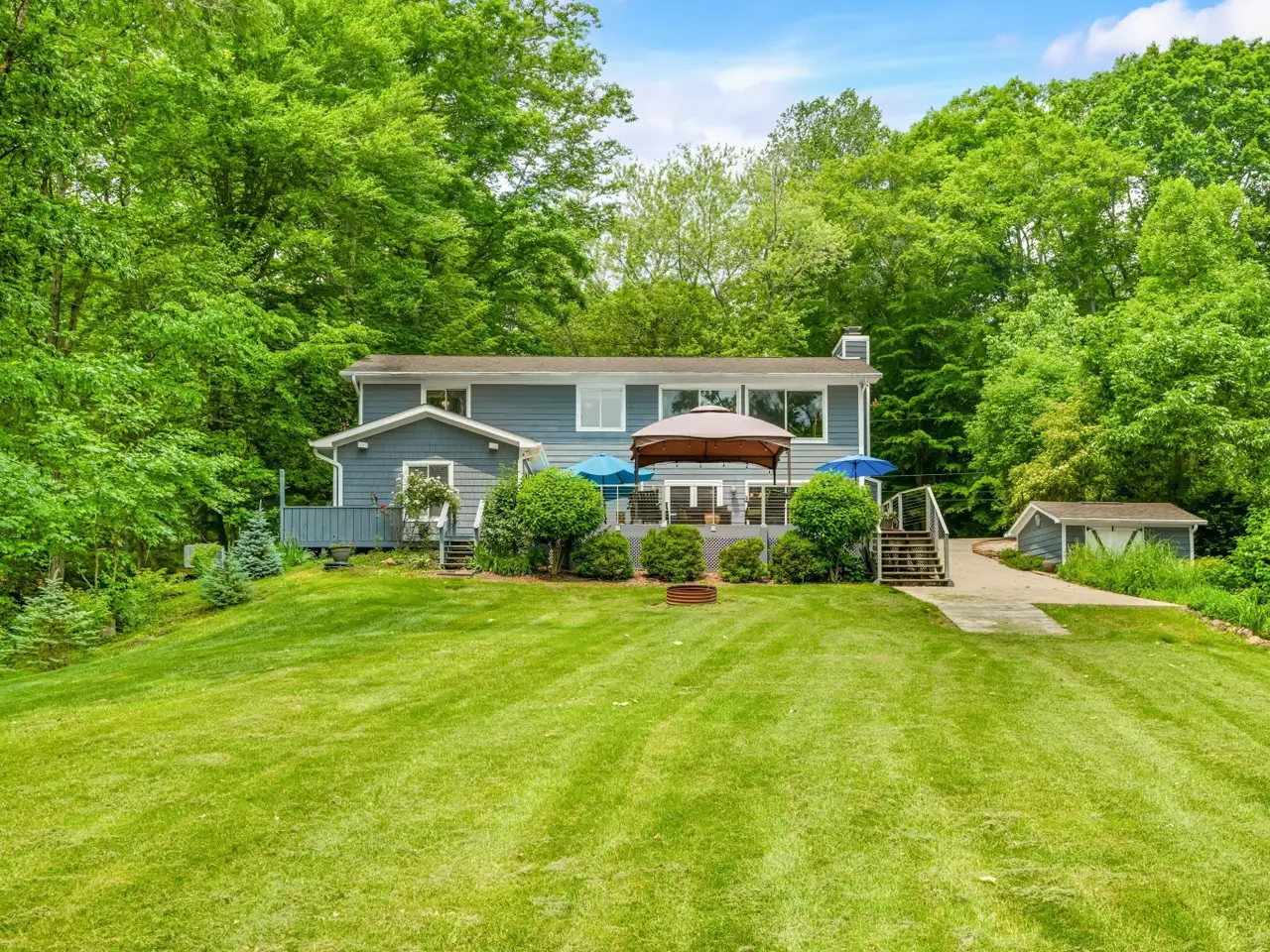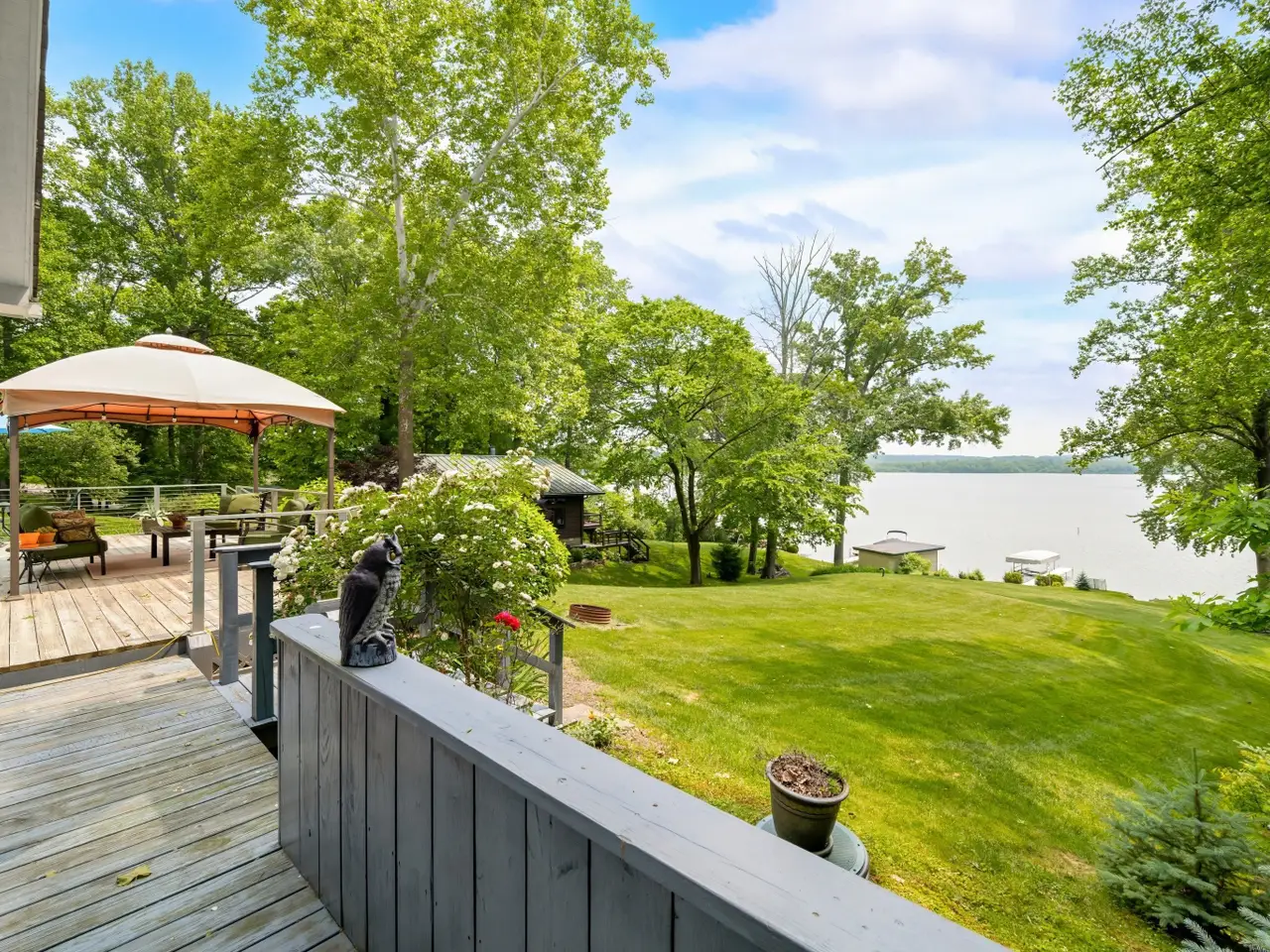 Nestled in a neighborhood of mature trees on an estate sized lot, this well kept Lake Lemon home presents a unique opportunity to embrace waterfront living. Step into the living room, where a limestone masonry fireplace creates a warm and inviting atmosphere, complemented by a striking wood walls that add character and texture, flooding you with memories of a cottage or cabin on a lake you once visited. The large panoramic windows show of one of Indiana's most sought after lakes: Lake Lemon. The remodeled kitchen offers a combined entertaining spot for guests to chat, grab a bite, play cards and look out at the amazing water view. Complete with a backsplash that adds a touch of elegance, a kitchen bar perfect for casual dining, a large kitchen island offering ample workspace, wood painted cabinets that exude timeless charm, and stone countertops that provide a durable and luxurious surface. There are patio doors that walk directly out to the back deck. This 4-bedroom, 2-bathroom home, built originally in 1955 has had substantial updates throughout the years. Please check the upgrades list uploaded to this listing, including a whole house generator. There is high speed internet for those wanting to work remotely with a view. Do not miss the chance to own this waterfront home, complete with all the features you need to live comfortably whether second home or primary. This property offers the chance to enjoy the beauty of nature with its waterfront location and views of the water and woods. Spend time outdoors on the deck or take advantage of the outdoor living space. There is a one car garage with carport and additional parking spaces allowing for 10+ cars to visit and enjoy the lake house. An outdoor shed provides storage, and the dock offers access to the water. There is electric ran to the dock and includes a boat lift.