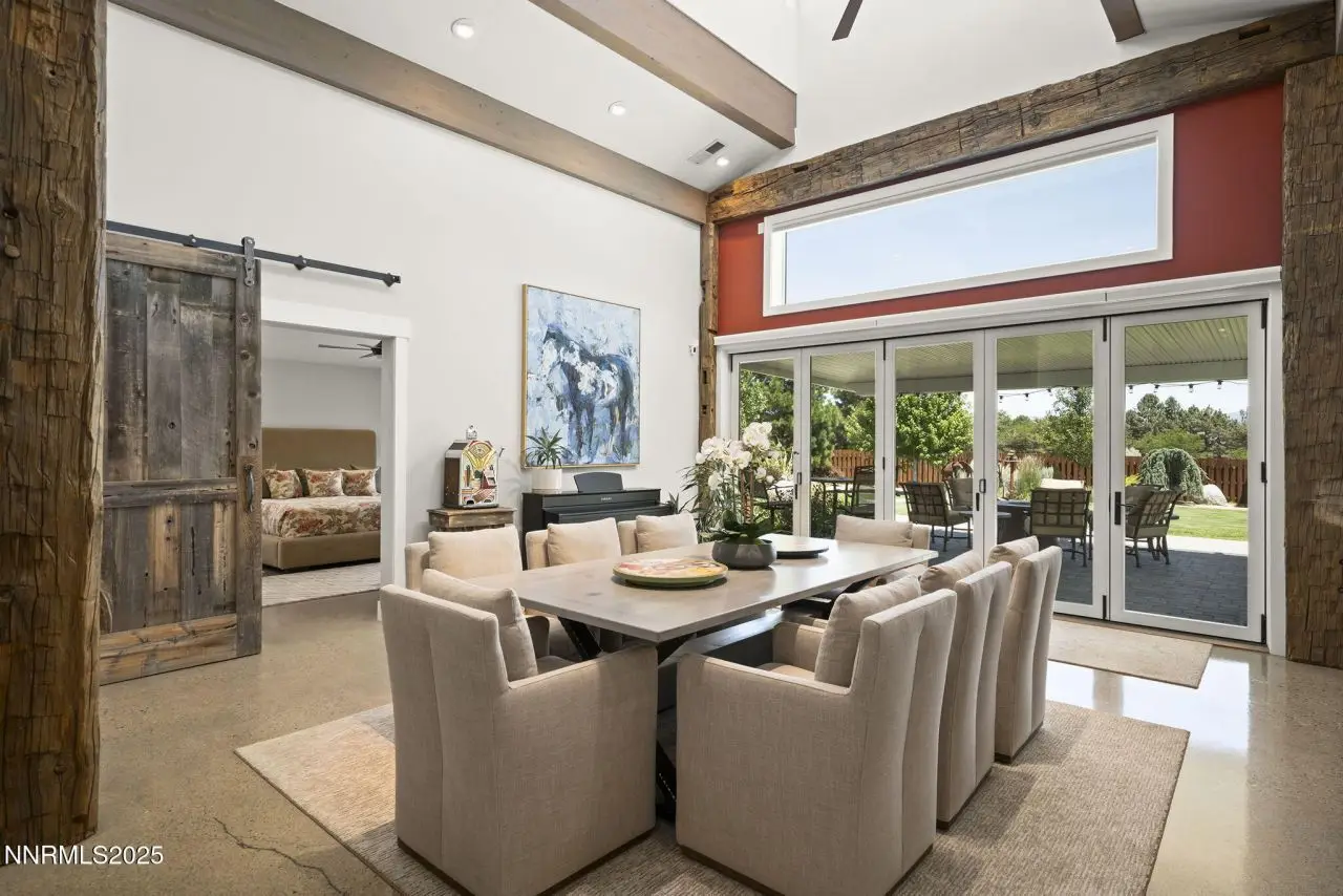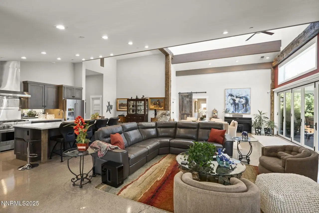 An extraordinary estate gracing 3.1 gated, level acres in the prestigious westside of Carson City. This property offers privacy, freedom, and flexibility with stunning Sierra and valley views and no HOA. This one-of-a-kind 6,000 square foot barn conversion seamlessly blends western character with modern luxury in an artfully reimagined space. Bathed in natural light, the open-concept great room creates a sense of volume and ease, with soaring ceilings, exposed beams, and a seamless flow perfect for relaxed living or refined entertaining. Impeccable finishes, bespoke details, and designer touches elevate every inch from the gourmet kitchen to the expansive custom wall-to-wall glass door framing the back patio and landscaped grounds. The private primary suite is a sanctuary, featuring a spacious walk-in closet, spa-inspired bath, and direct access to the serene backyard. An extraordinary blend of art and architecture, this home is as much a gallery as it is a home. Set amidst meticulously maintained grounds, the property features thoughtfully curated landscaping that doubles as a living canvas, where sculptural elements and botanical design create moments of beauty at every turn. Pathways wind through lush greenery and hand-selected art installations, offering a tranquil and inspiring retreat. Every outdoor space has been designed with intention, framing the home with a sense of serenity and timeless sophistication. Perfect for the collector, the gardener, or anyone seeking elevated, artful living. Ideal for RV, car, or horse enthusiasts, and those seeking peace, space, and Nevada's tax advantages, the property includes a 6-car garage plus dedicated motorcoach and RV parking with hookups. A private gated driveway leads to the beautifully landscaped grounds with walking paths, 50 mature trees, and wide-open areas perfect for dogs and outdoor enjoyment. Just minutes from shopping, golf, top-rated medical facilities, and Lake Tahoe, this rare opportunity offers the ultimate in quiet, elevated living-where your lifestyle sets the rules.