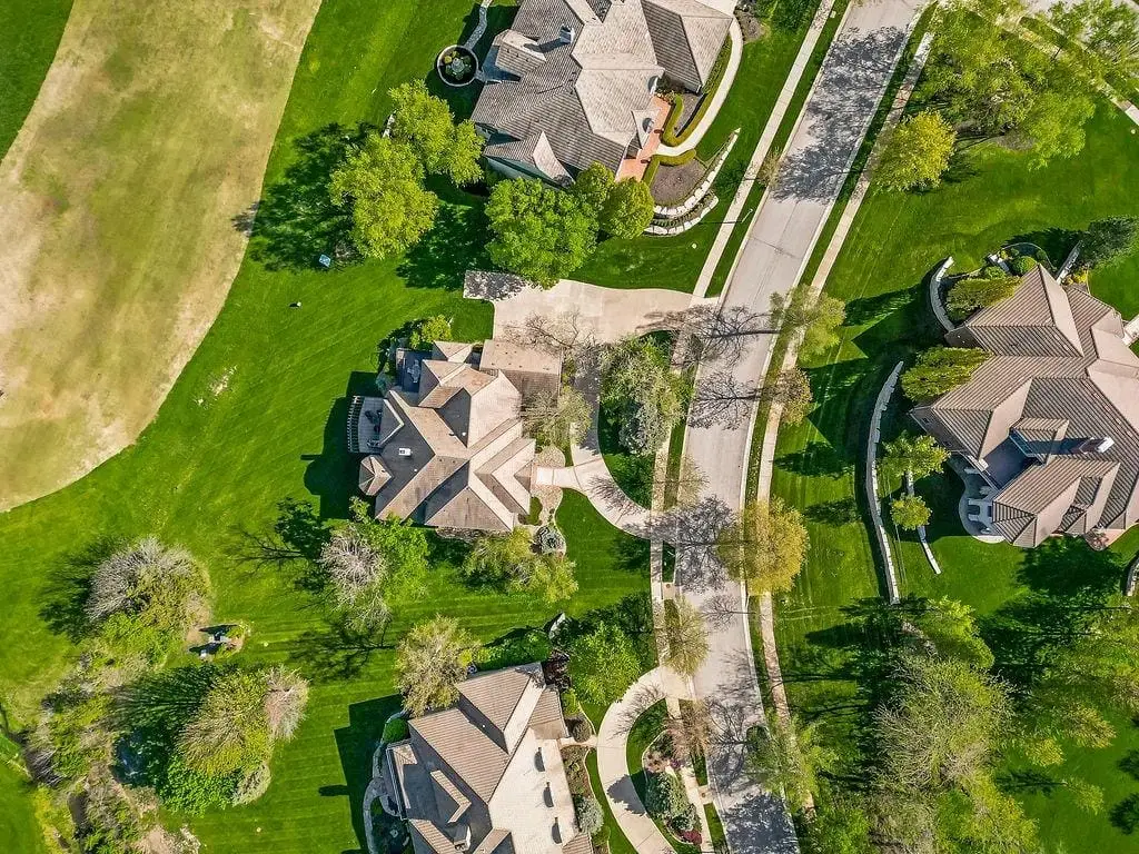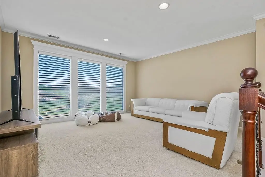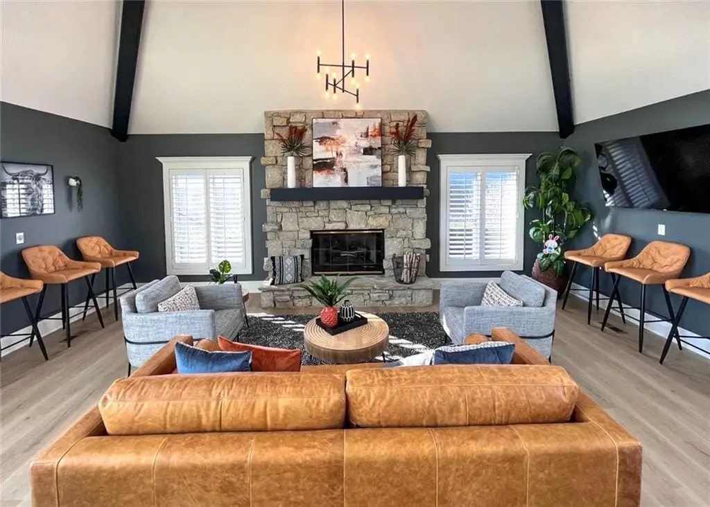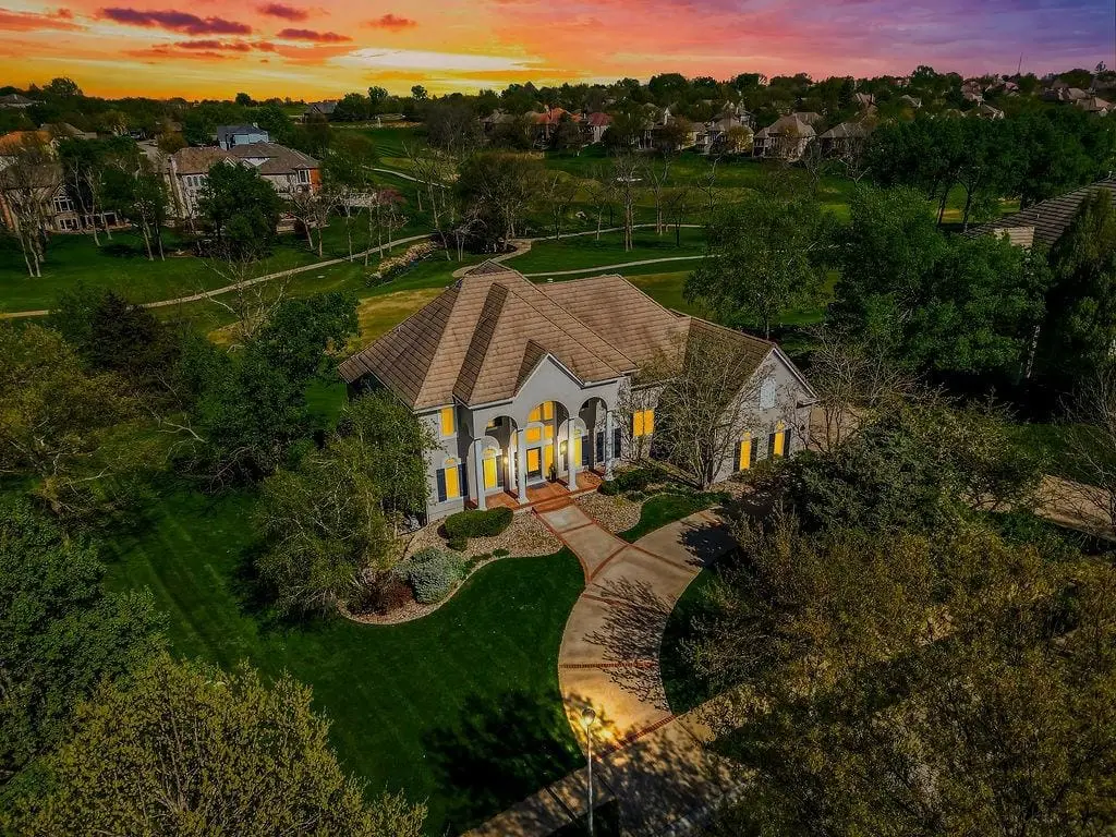 Fabulous 1.5 story Estate Home on the golf course in sought after Falcon Ridge Estates community boasting over 7200sqft with 5 bedrooms and 5 1/2 bathrooms! Circle driveway and side entry garage! Walk into the grand 2 story entrance with curved staircase, iron spindles, modern marble entry tile, new stair carpet & gorgeous chandelier. Main floor den/office with pocket doors and large formal dining. Fantastic main floor primary suite has a sitting area and see thru gas fireplace. Primary bathroom feels like a spa oasis with jacuzzi tub and fireplace, double vanities with new quartz countertops, plethora of cabinet space, separate shower & piazza de resistance is 2 LG WALK-IN CLOSETS! The spacious chef's kitchen has 2 ovens, a 6 burner Dacor gas cooktop with a retractable downdraft vent, beverage refrigerator in the island, tons of counter space, & walk-in pantry are sure to delight. New refinished hardwoods & open floor plan to the great room & breakfast nook. Great room has spectacular golf course views via floor to ceiling windows plus stone fireplace w/built-in cabinets. Also on the main floor are deck access, office area w/built-in desk spaces/shelvingw/French doors, laundry room & back staircase w/new stair carpet. Upstairs are 3 large bedrooms all w/private baths, new Quartz counters & walk-in closets PLUS large loft area & built-in desk area. Large open finished space in the walkout LL perfect for entertaining w/LG bar w/mini-fridge, microwave & sink along. Billiards & media areas as well. 5thbedroom & full bath in LL. Tons of unfinished storage! Perfect space that would make a great gym. Plantation shutters cover the front windows & custom window treatments throughout. Tankless hot water heater, newer HVACs, tile roof! Amenities include 2 pools, pickleball & tennis courts, party room, sand volleyball. Close to Lake Lenexa, trails & parks. Golf membership optional.