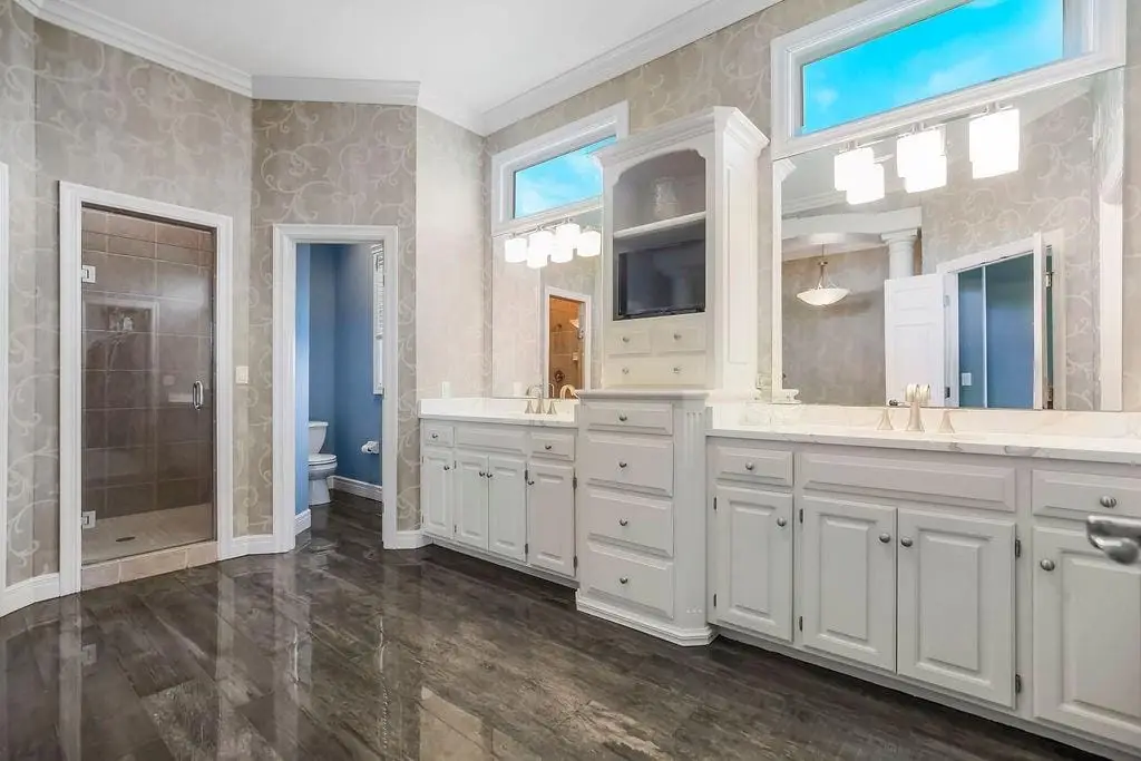 Spa-like primary bathroom with jacuzzi tub & fireplace