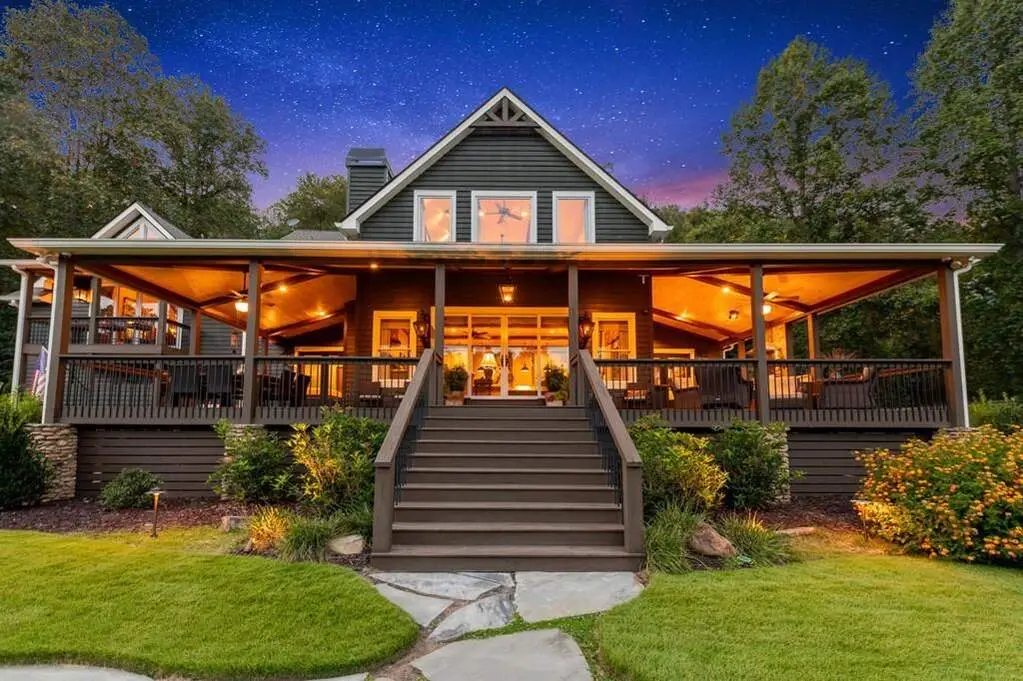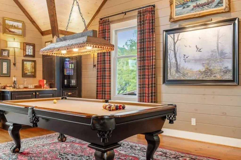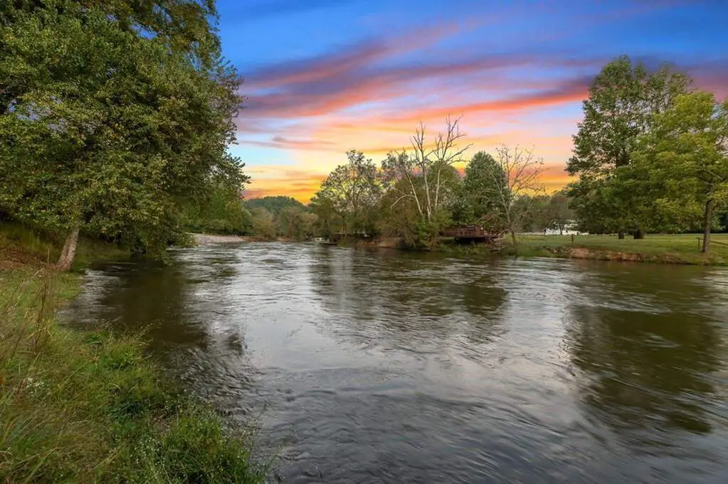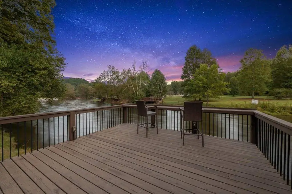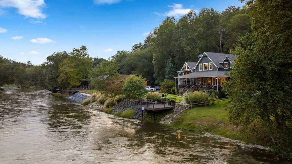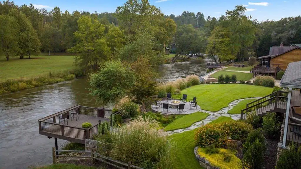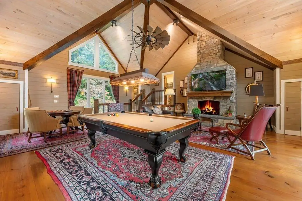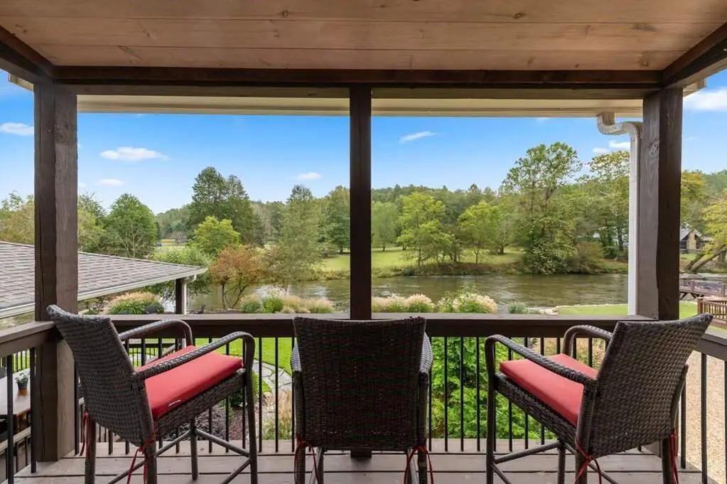 River's Edge is a 6-bedroom, 5-bathroom, fully furnished home with 114' of Toccoa River frontage. It underwent a complete remodel and landscape transformation in 2020, interior designed by Cindy Trimble of Studio Trimble Design of Blue Ridge, GA. The home has 5643 (+/-) heated and cooled sq. ft., 1,400 sq. ft. of front porch, 1,600 sq. ft. of porch facing the river, 16x16 deck extending over the river, a hot tub, and rock firepit with two sets of rock steps leading to the river. The kitchen, living, and dining areas are all open with lots of counter space for cooking and entertaining. Beautiful wide-plank eastern pine floors are featured throughout, with Persian rugs and tasteful dcor that provide a sophisticated lodge feel. The home has three master suites, two on the main floor and one on the second floor. The second-floor master suite features three closets, double vanity sinks, large walk-in shower with separate soaker tub, and heated floors. The second floor also has a bedroom with three single beds and one double bed, plus a full bathroom. The basement has a large living area; two bedrooms, one with a queen bed, and one with four full beds; a full bathroom with double sinks, and walk-in shower. There are four Tennessee fieldstone fireplaces in the home. Located above the garage is a bonus/billiards room with vaulted ceiling, bar, and private balcony. The back porch overlooking the river features a cooking area with a built-in grill and bar fridge along with a sitting area and custom-made dining table that seats eight. The professionally landscaped yard features Zeon Zosia grass, underground drainage, irrigation system, outdoor accent lighting, and camera system. With access to two fish weirs, and a fish feeder that feeds trout daily, it offers some of the best fishing on the tailwater! The attention to detail in this home is something to see and appreciate.