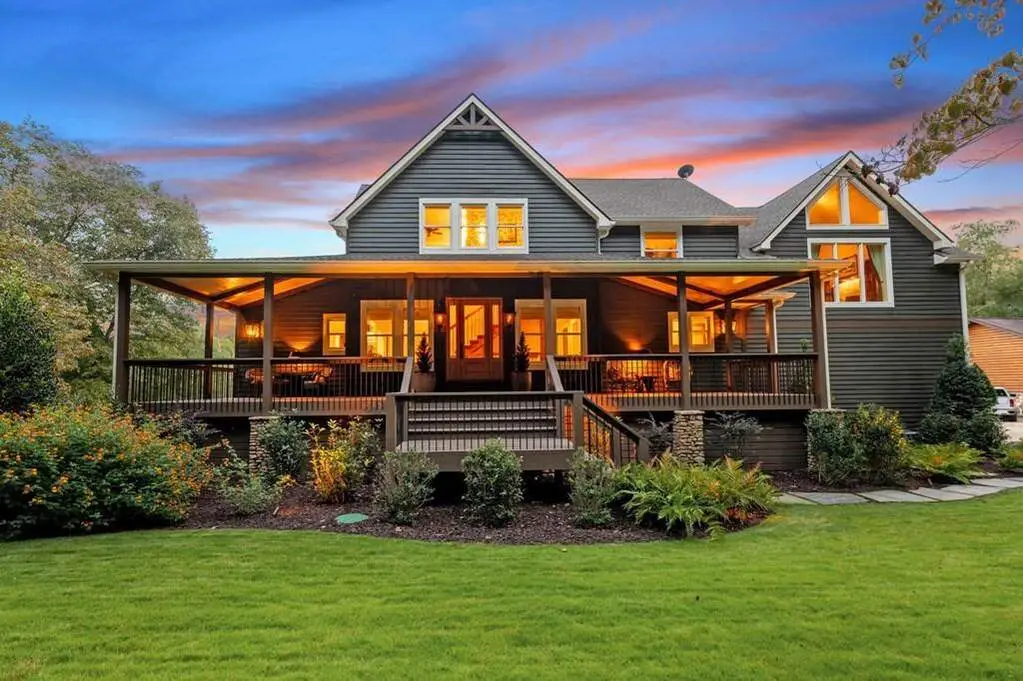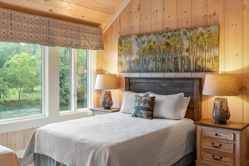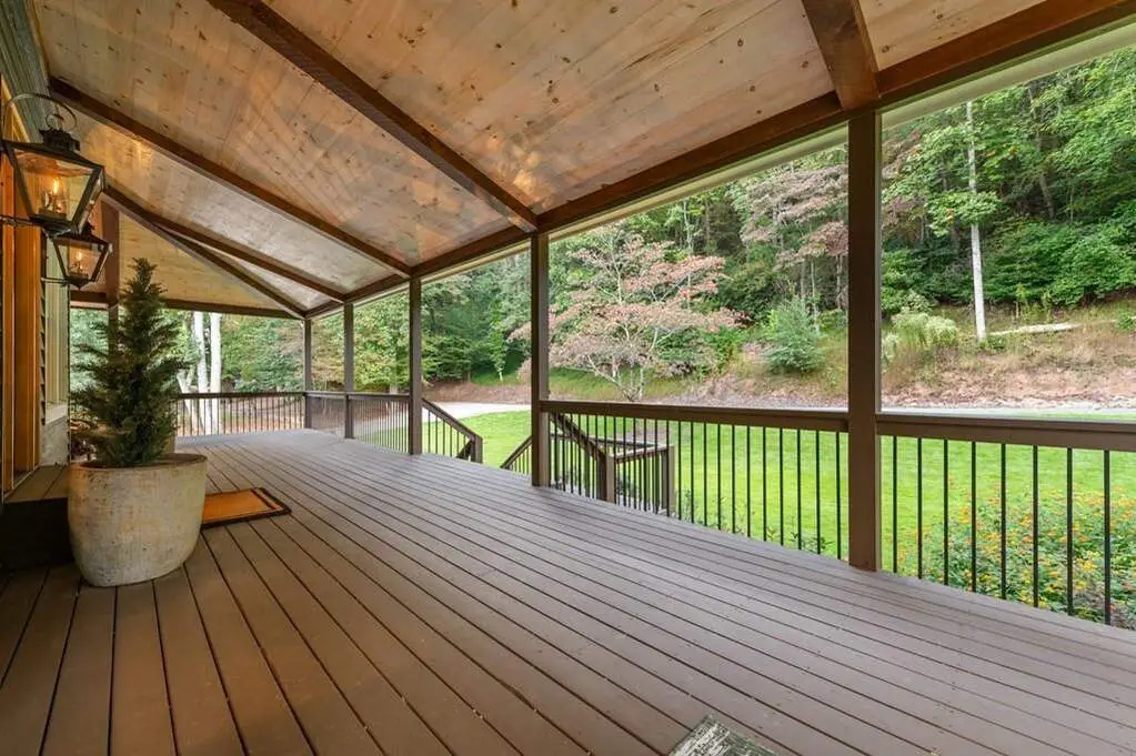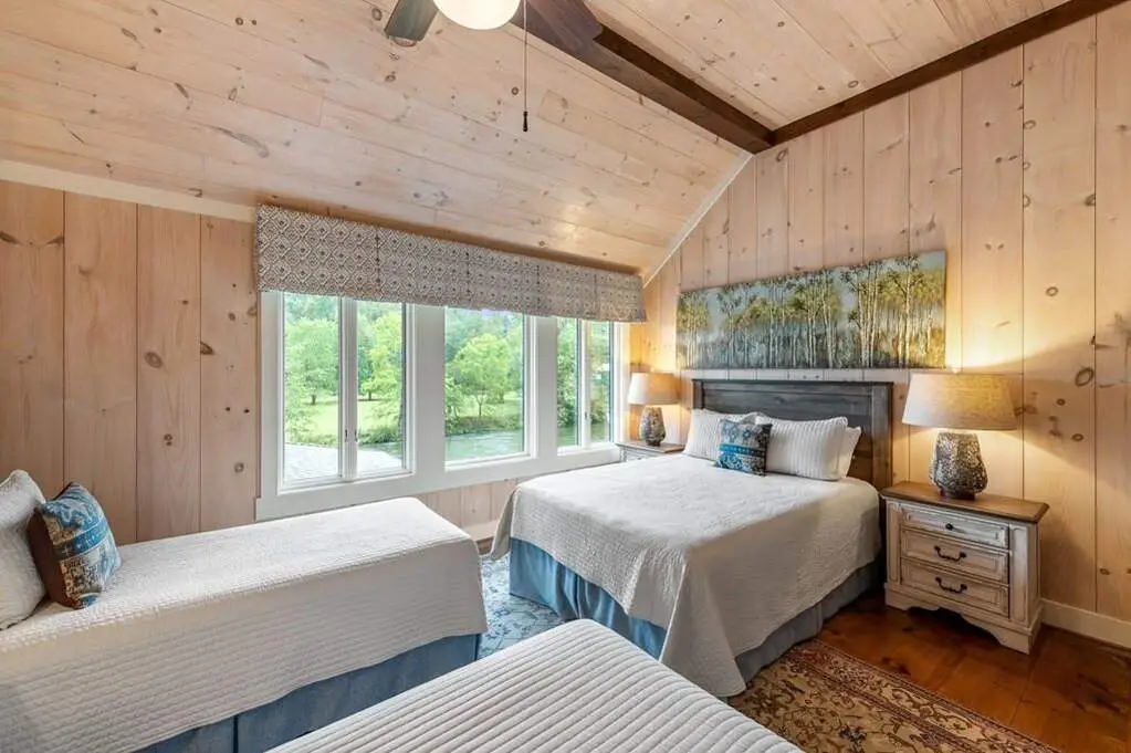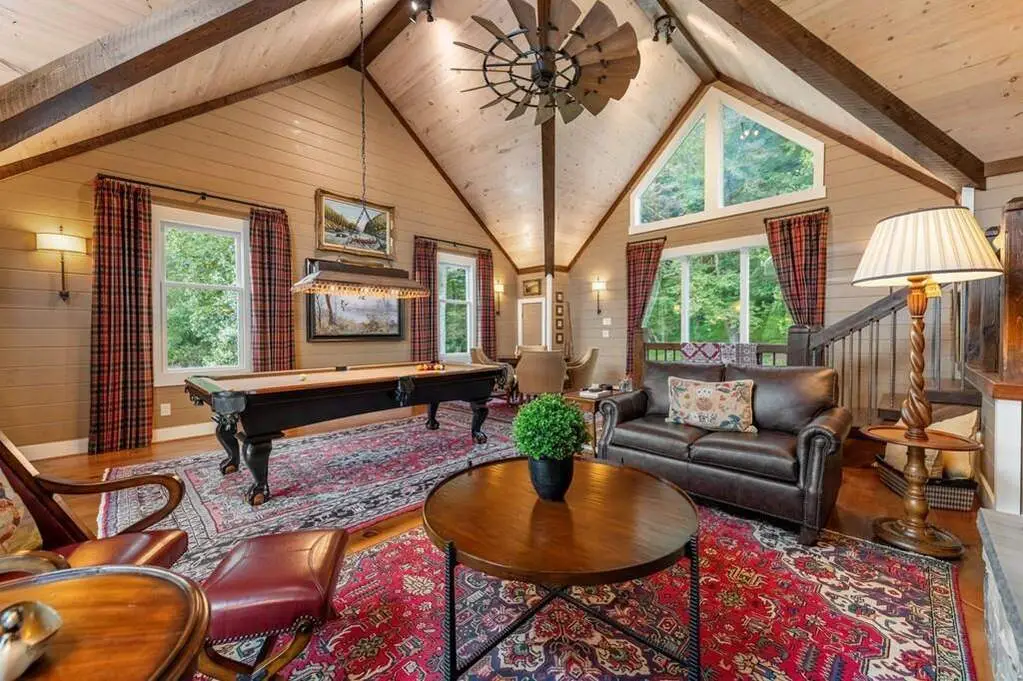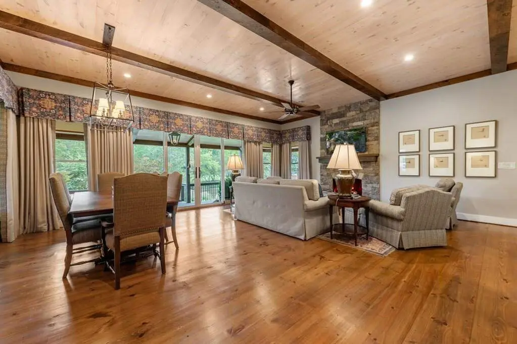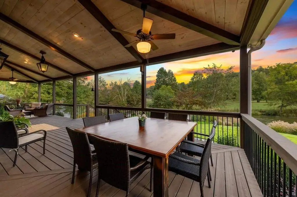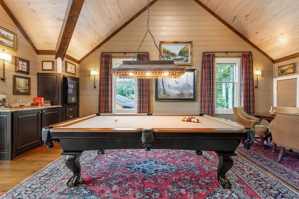 River's Edge is a 6-bedroom, 5-bathroom, fully furnished home with 114' of Toccoa River frontage. It underwent a complete remodel and landscape transformation in 2020, interior designed by Cindy Trimble of Studio Trimble Design of Blue Ridge, GA. The home has 5643 (+/-) heated and cooled sq. ft., 1,400 sq. ft. of front porch, 1,600 sq. ft. of porch facing the river, 16x16 deck extending over the river, a hot tub, and rock firepit with two sets of rock steps leading to the river. The kitchen, living, and dining areas are all open with lots of counter space for cooking and entertaining. Beautiful wide-plank eastern pine floors are featured throughout, with Persian rugs and tasteful dcor that provide a sophisticated lodge feel. The home has three master suites, two on the main floor and one on the second floor. The second-floor master suite features three closets, double vanity sinks, large walk-in shower with separate soaker tub, and heated floors. The second floor also has a bedroom with three single beds and one double bed, plus a full bathroom. The basement has a large living area; two bedrooms, one with a queen bed, and one with four full beds; a full bathroom with double sinks, and walk-in shower. There are four Tennessee fieldstone fireplaces in the home. Located above the garage is a bonus/billiards room with vaulted ceiling, bar, and private balcony. The back porch overlooking the river features a cooking area with a built-in grill and bar fridge along with a sitting area and custom-made dining table that seats eight. The professionally landscaped yard features Zeon Zosia grass, underground drainage, irrigation system, outdoor accent lighting, and camera system. With access to two fish weirs, and a fish feeder that feeds trout daily, it offers some of the best fishing on the tailwater! The attention to detail in this home is something to see and appreciate.