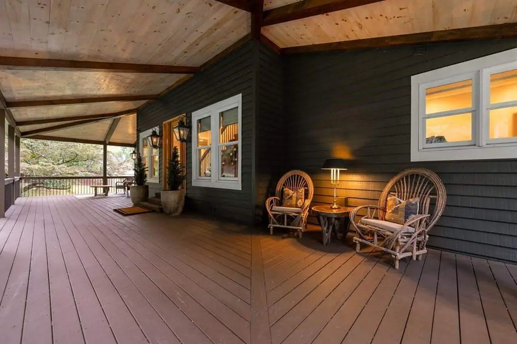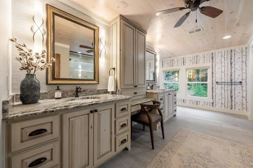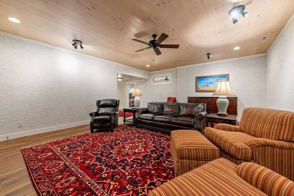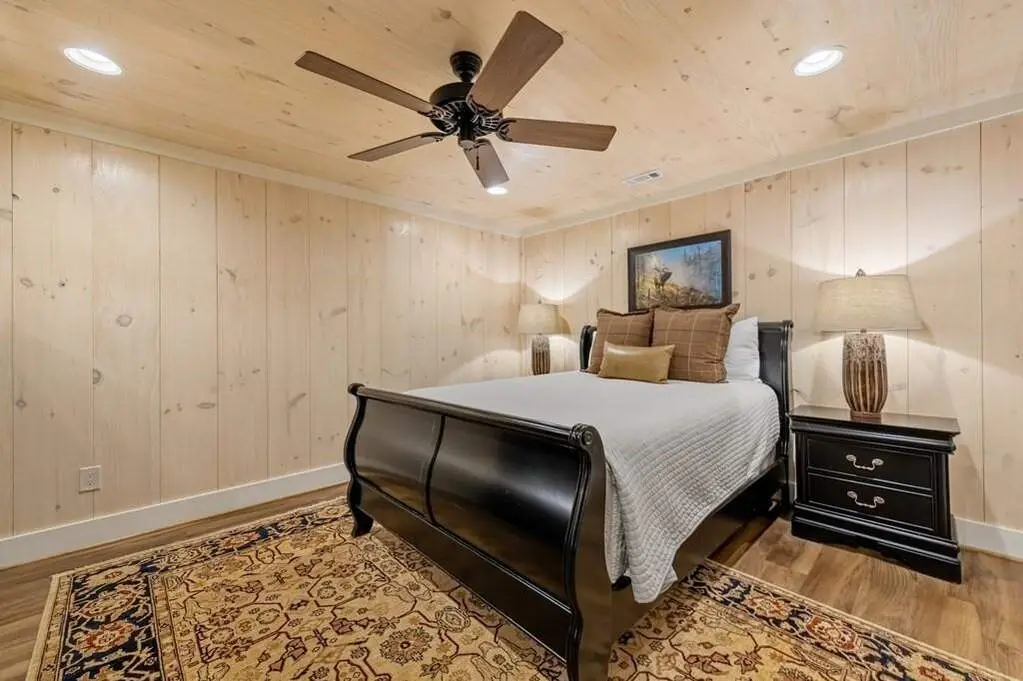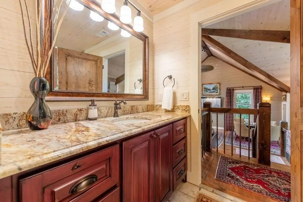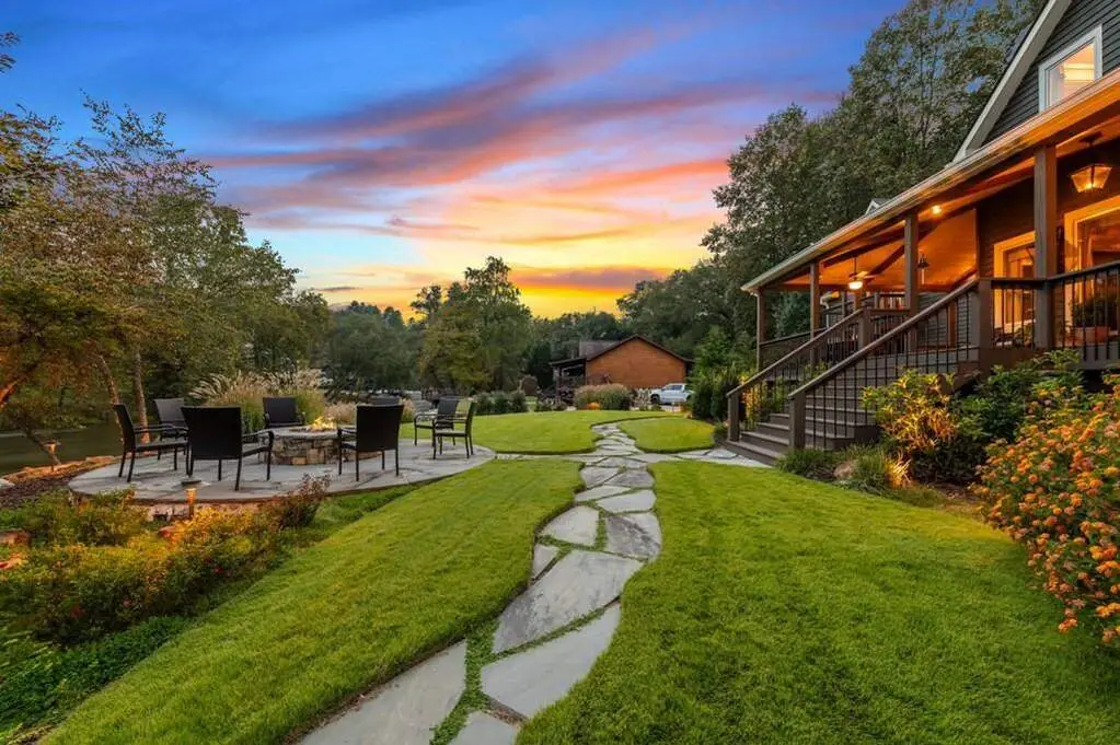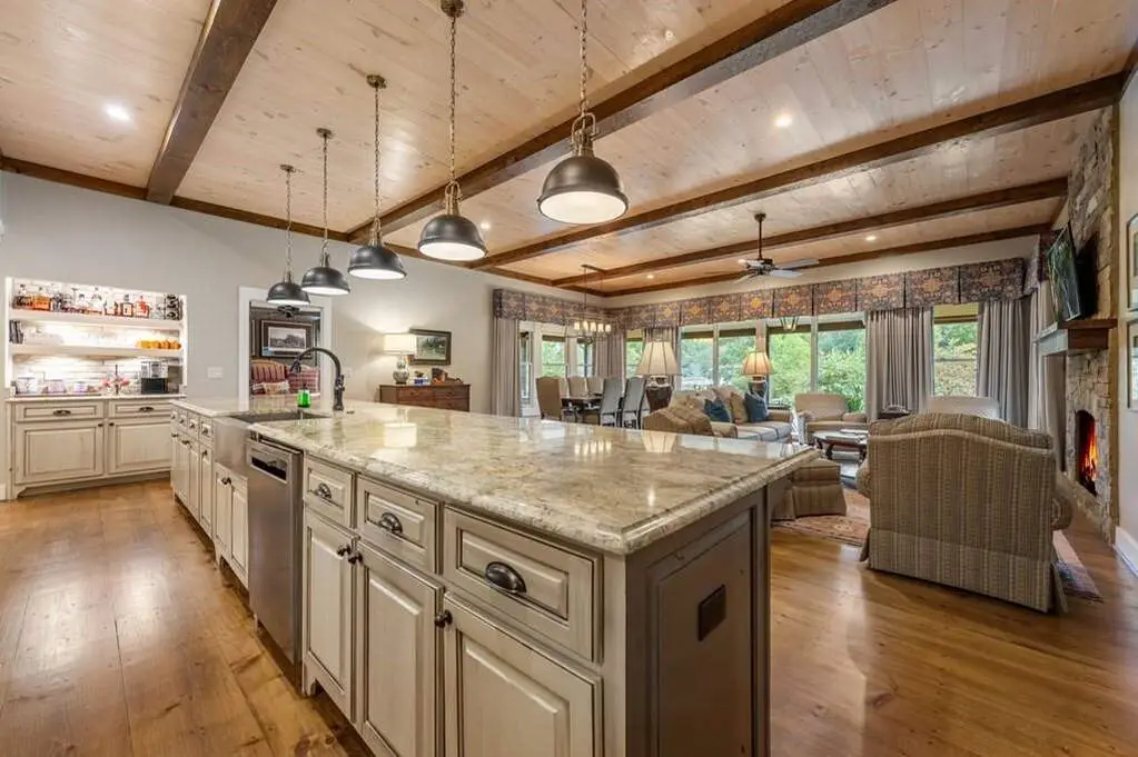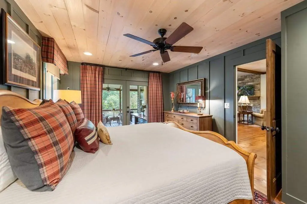 River's Edge is a 6-bedroom, 5-bathroom, fully furnished home with 114' of Toccoa River frontage. It underwent a complete remodel and landscape transformation in 2020, interior designed by Cindy Trimble of Studio Trimble Design of Blue Ridge, GA. The home has 5643 (+/-) heated and cooled sq. ft., 1,400 sq. ft. of front porch, 1,600 sq. ft. of porch facing the river, 16x16 deck extending over the river, a hot tub, and rock firepit with two sets of rock steps leading to the river. The kitchen, living, and dining areas are all open with lots of counter space for cooking and entertaining. Beautiful wide-plank eastern pine floors are featured throughout, with Persian rugs and tasteful dcor that provide a sophisticated lodge feel. The home has three master suites, two on the main floor and one on the second floor. The second-floor master suite features three closets, double vanity sinks, large walk-in shower with separate soaker tub, and heated floors. The second floor also has a bedroom with three single beds and one double bed, plus a full bathroom. The basement has a large living area; two bedrooms, one with a queen bed, and one with four full beds; a full bathroom with double sinks, and walk-in shower. There are four Tennessee fieldstone fireplaces in the home. Located above the garage is a bonus/billiards room with vaulted ceiling, bar, and private balcony. The back porch overlooking the river features a cooking area with a built-in grill and bar fridge along with a sitting area and custom-made dining table that seats eight. The professionally landscaped yard features Zeon Zosia grass, underground drainage, irrigation system, outdoor accent lighting, and camera system. With access to two fish weirs, and a fish feeder that feeds trout daily, it offers some of the best fishing on the tailwater! The attention to detail in this home is something to see and appreciate.