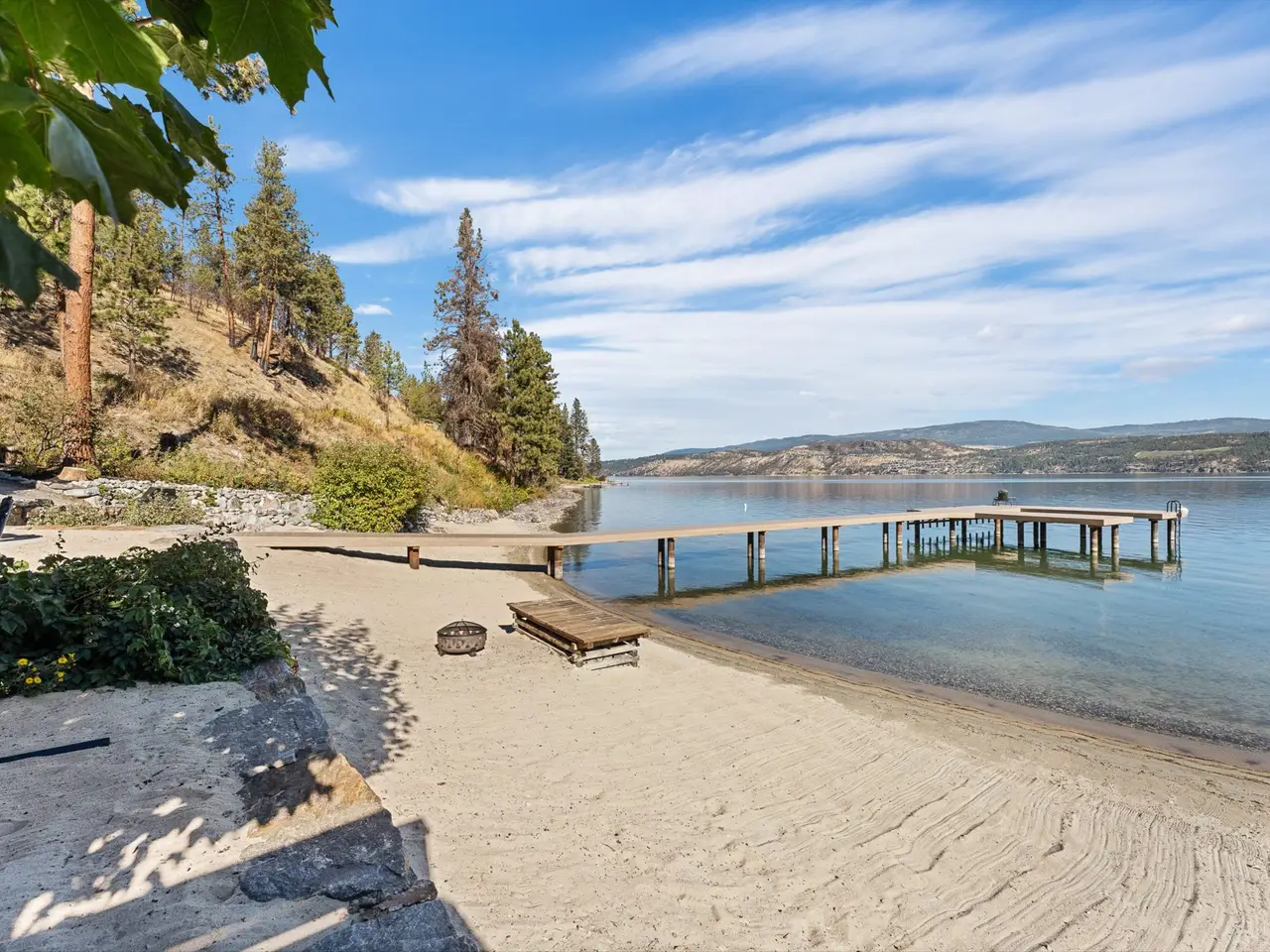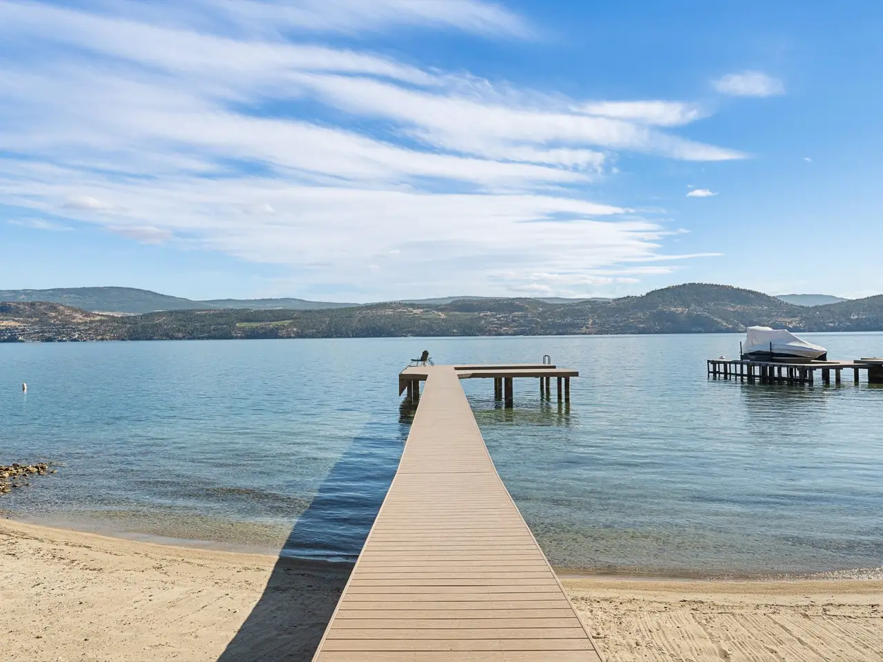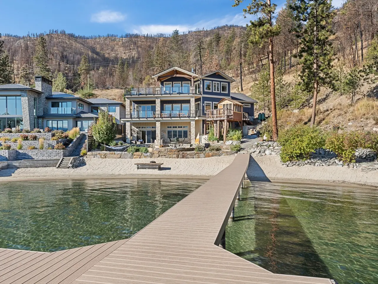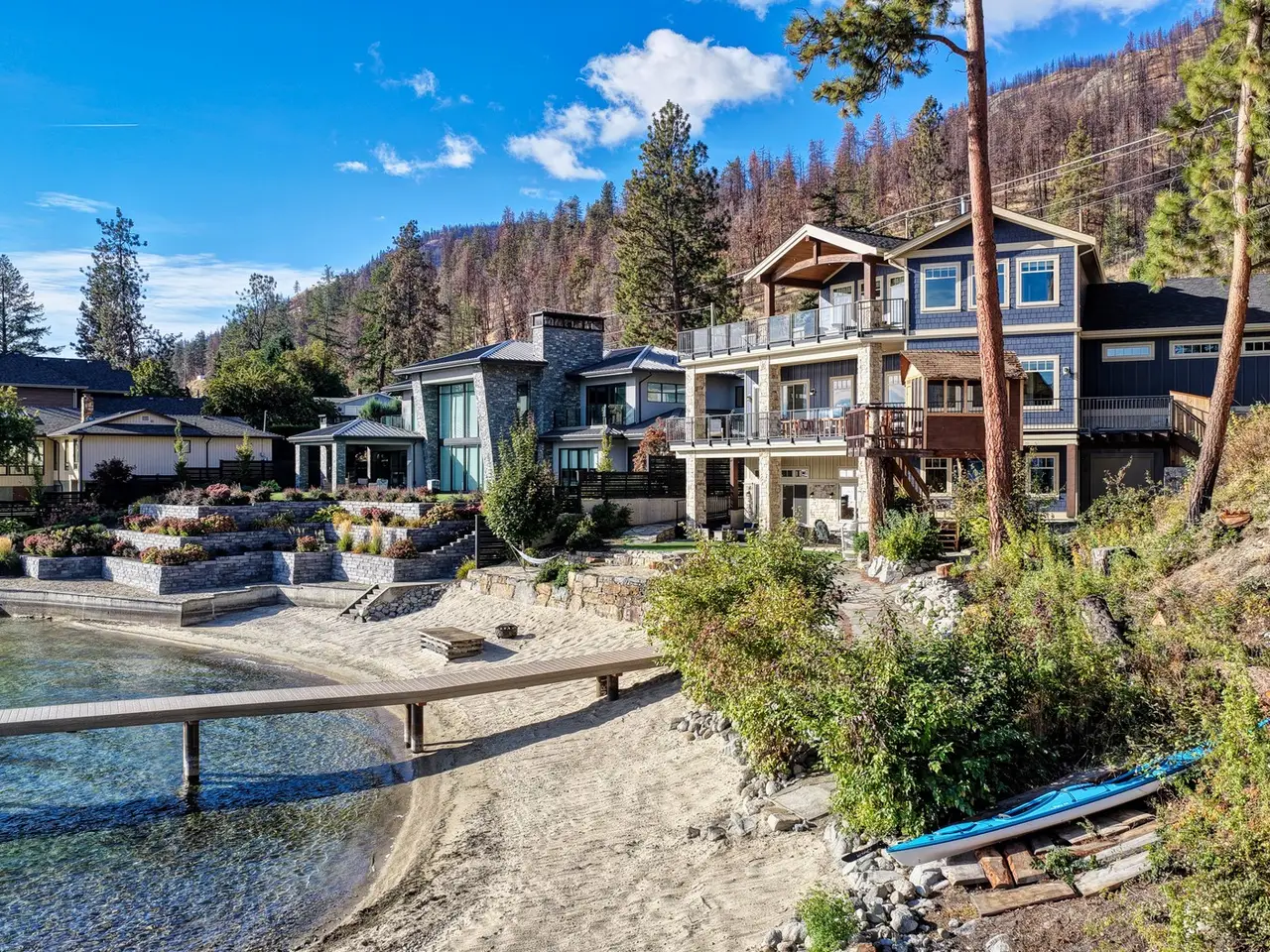 Listed by Unison Jane Hoffman Realty | Experience one of the Okanagan’s most desirable waterfront settings with a serene, sandy bay, 120 ft. of pristine shoreline and some of the best sand in the valley, both on shore and beneath the water. This exquisite, turn-key home captures the essence of lakeside luxury, offering panoramic views, timeless architecture, and a relaxed sophisticated style throughout. Inside, the open-concept main level showcases soaring vaulted ceilings, exposed beams, and a stunning limestone fireplace that anchors the great room. The gourmet kitchen features granite countertops, a large central island with seating for six, and premium KitchenAid appliances, flowing seamlessly to the dining area and lakeview deck. A secondary primary suite on this level includes a spa-inspired ensuite and walkout access to the covered patio. Upstairs, the primary retreat impresses with vaulted ceilings, a private deck, a freestanding tub framed by lake views, and a spacious walk-in closet. The family room and wet bar extend to a partially covered terrace with a two-person spa — ideal for sunset evenings. The lower level is designed for entertaining, featuring a theatre with leather recliners, a full kitchenette, and walk-out access to multiple tiered patios that lead to the beach, new private dock, and charming treehouse lounge. Complete with solar panels, two-car garage with expoxy finish, and resort-style outdoor spaces, this residence defines refined Okanagan lakefront living.