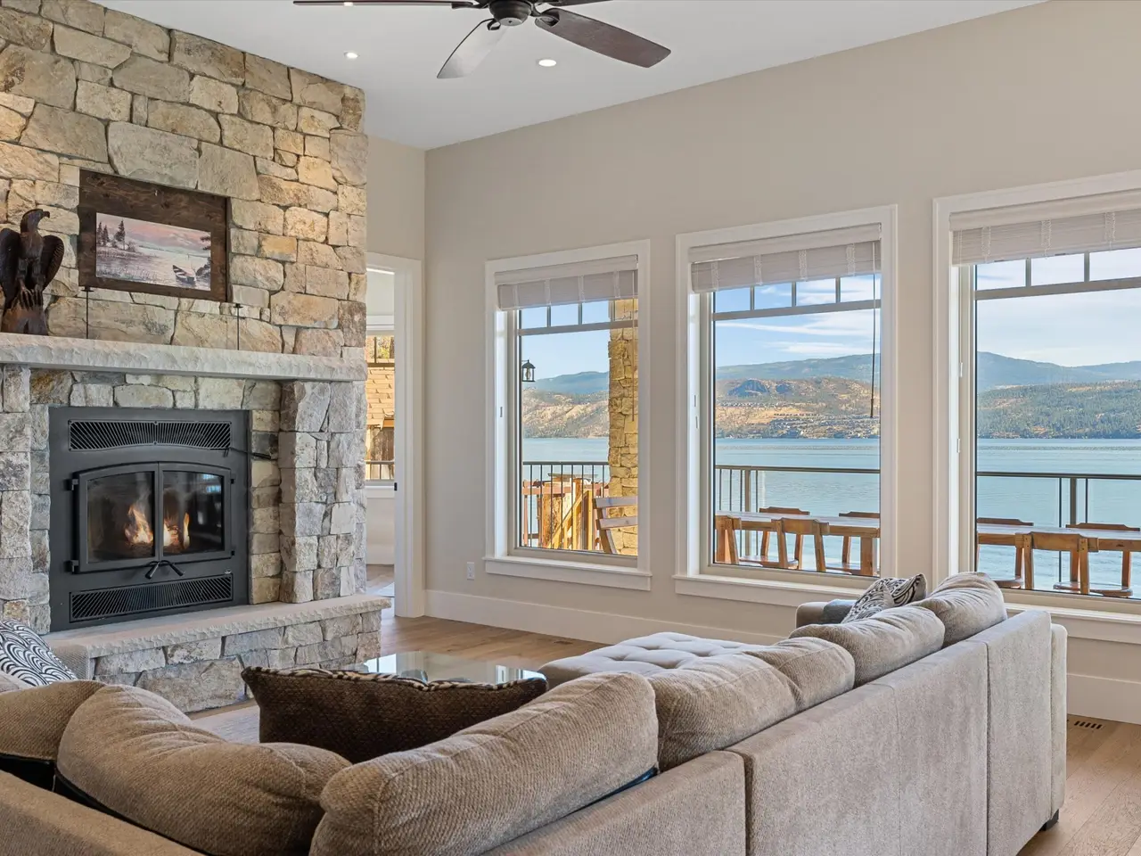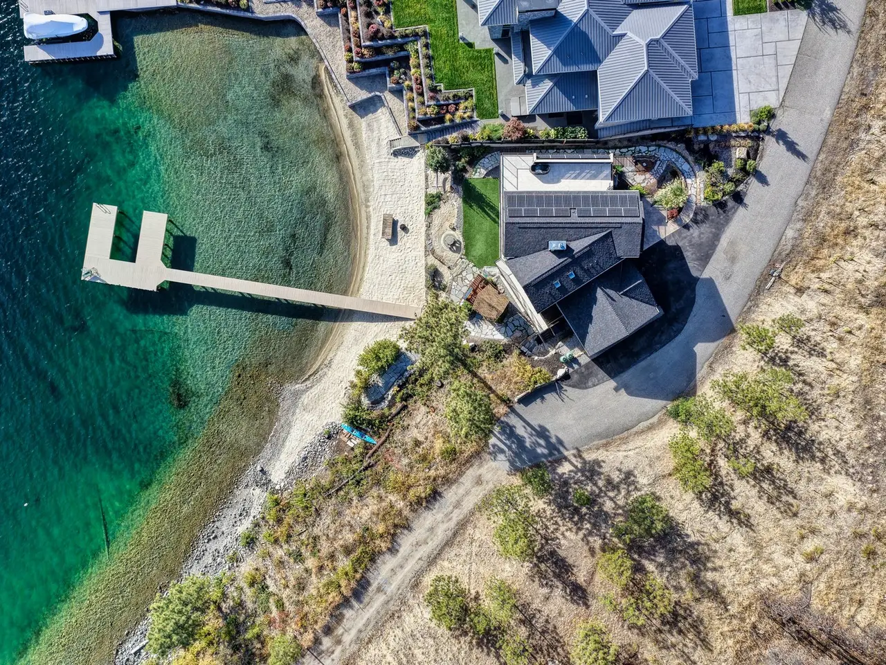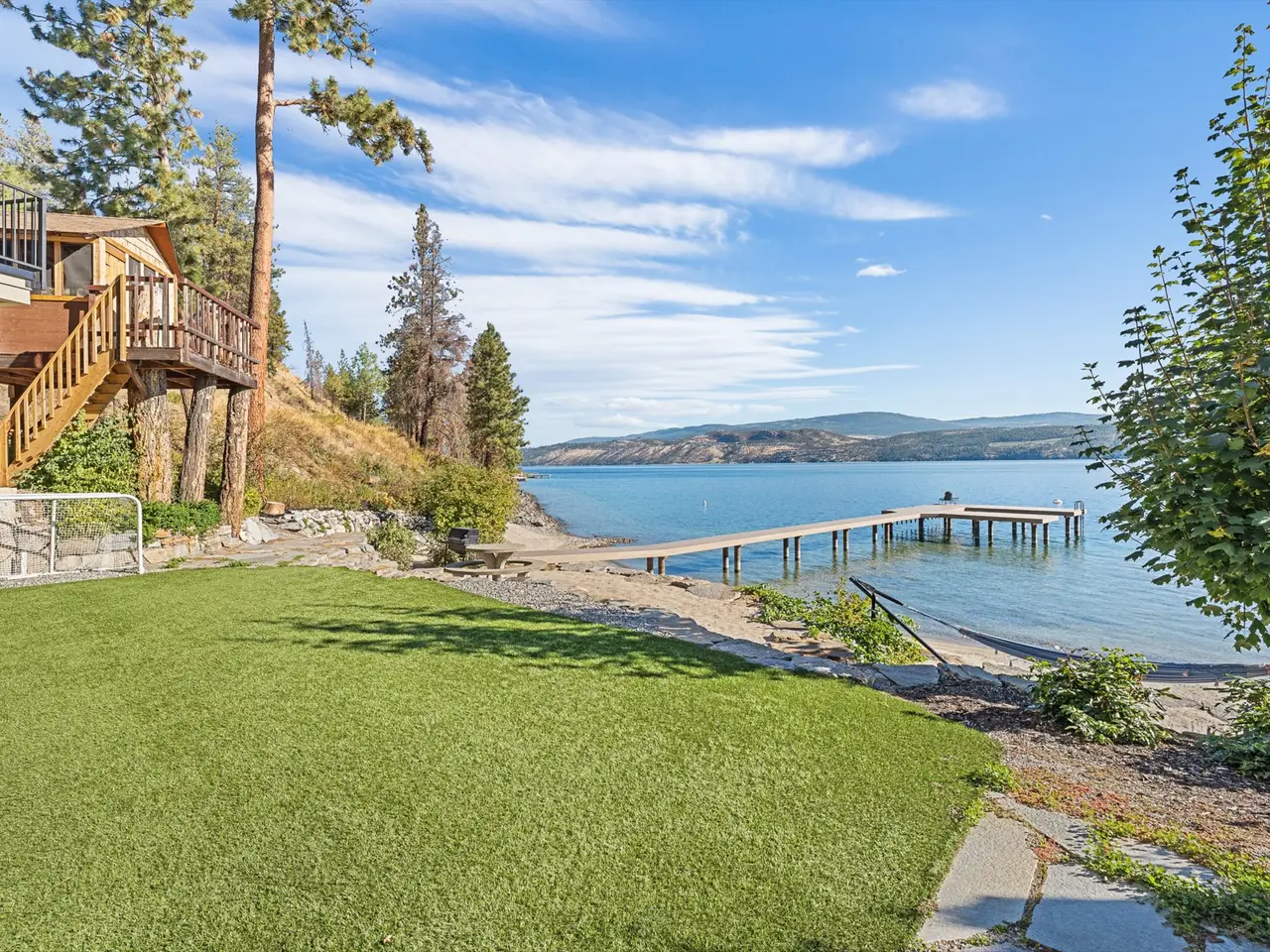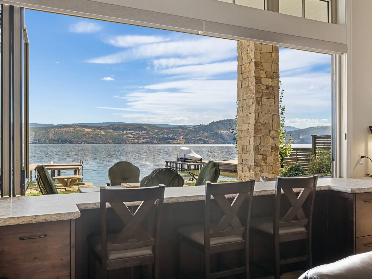 Listed by Unison Jane Hoffman Realty | Experience one of the Okanagan’s most desirable waterfront settings with a serene, sandy bay, 120 ft. of pristine shoreline and some of the best sand in the valley, both on shore and beneath the water. This exquisite, turn-key home captures the essence of lakeside luxury, offering panoramic views, timeless architecture, and a relaxed sophisticated style throughout. Inside, the open-concept main level showcases soaring vaulted ceilings, exposed beams, and a stunning limestone fireplace that anchors the great room. The gourmet kitchen features granite countertops, a large central island with seating for six, and premium KitchenAid appliances, flowing seamlessly to the dining area and lakeview deck. A secondary primary suite on this level includes a spa-inspired ensuite and walkout access to the covered patio. Upstairs, the primary retreat impresses with vaulted ceilings, a private deck, a freestanding tub framed by lake views, and a spacious walk-in closet. The family room and wet bar extend to a partially covered terrace with a two-person spa — ideal for sunset evenings. The lower level is designed for entertaining, featuring a theatre with leather recliners, a full kitchenette, and walk-out access to multiple tiered patios that lead to the beach, new private dock, and charming treehouse lounge. Complete with solar panels, two-car garage with expoxy finish, and resort-style outdoor spaces, this residence defines refined Okanagan lakefront living.