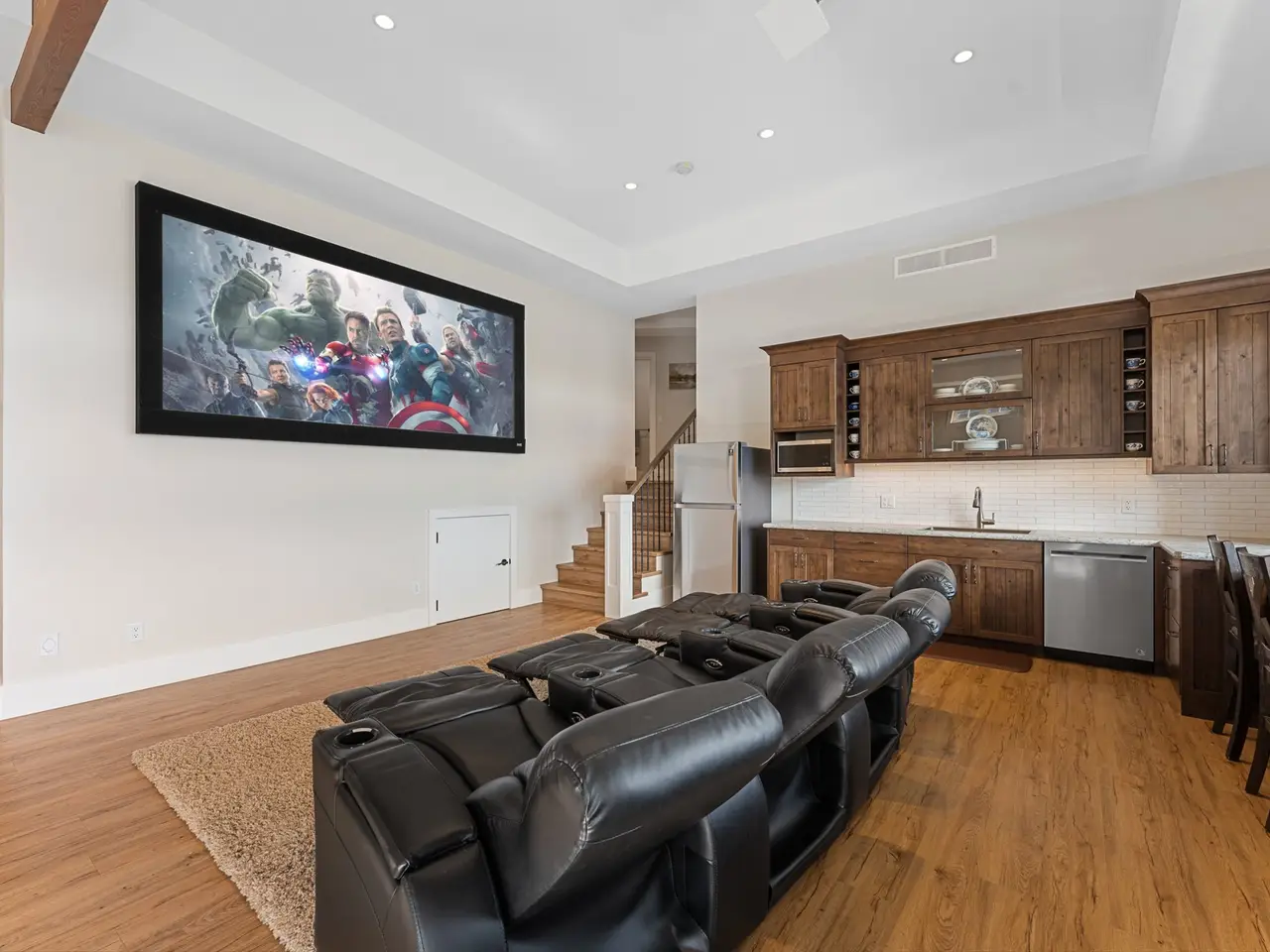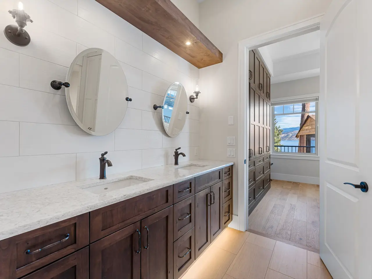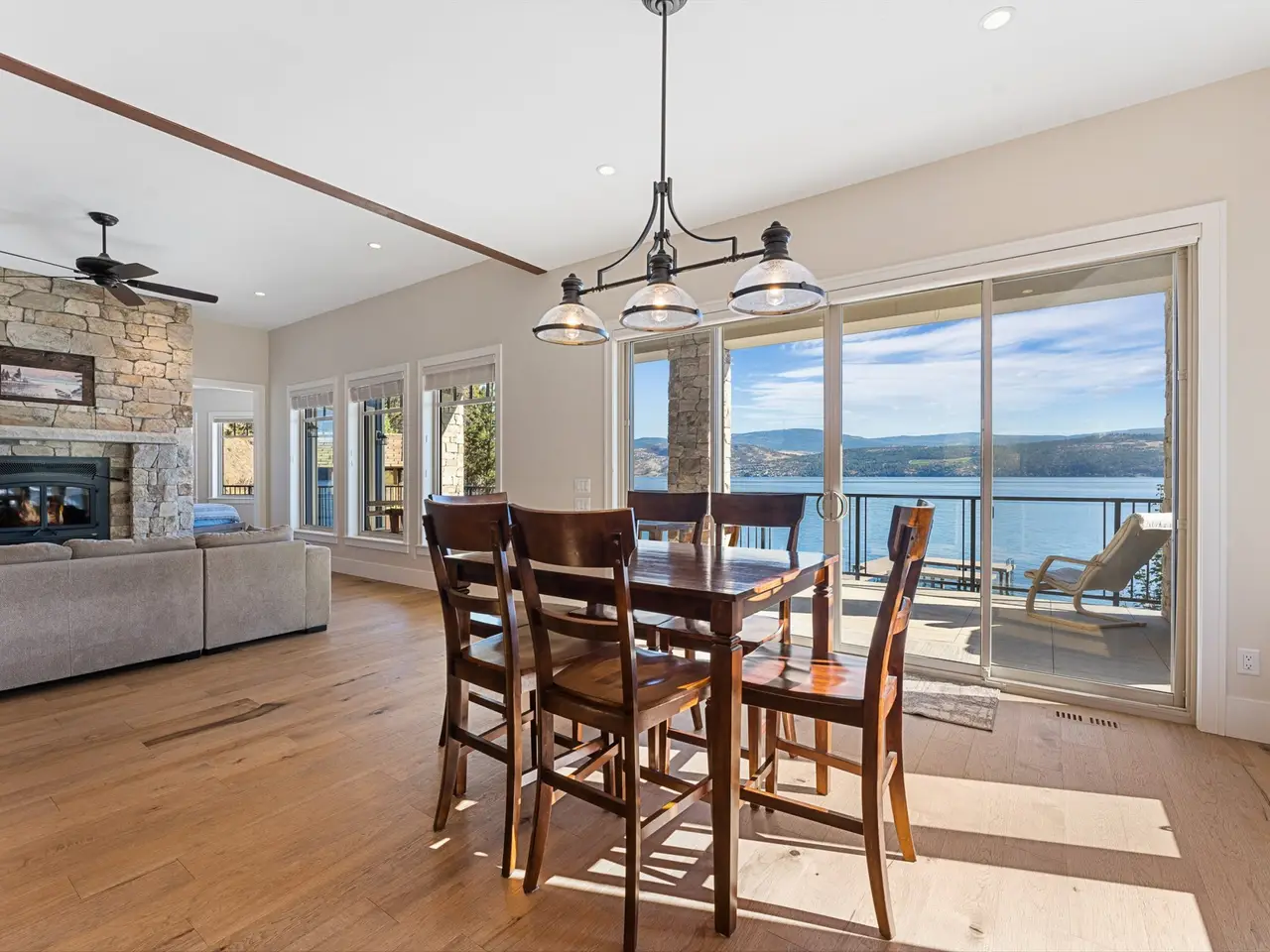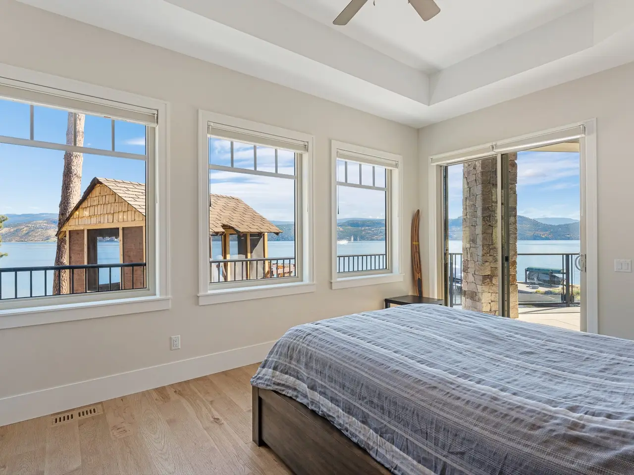 Listed by Unison Jane Hoffman Realty | Experience one of the Okanagan’s most desirable waterfront settings with a serene, sandy bay, 120 ft. of pristine shoreline and some of the best sand in the valley, both on shore and beneath the water. This exquisite, turn-key home captures the essence of lakeside luxury, offering panoramic views, timeless architecture, and a relaxed sophisticated style throughout. Inside, the open-concept main level showcases soaring vaulted ceilings, exposed beams, and a stunning limestone fireplace that anchors the great room. The gourmet kitchen features granite countertops, a large central island with seating for six, and premium KitchenAid appliances, flowing seamlessly to the dining area and lakeview deck. A secondary primary suite on this level includes a spa-inspired ensuite and walkout access to the covered patio. Upstairs, the primary retreat impresses with vaulted ceilings, a private deck, a freestanding tub framed by lake views, and a spacious walk-in closet. The family room and wet bar extend to a partially covered terrace with a two-person spa — ideal for sunset evenings. The lower level is designed for entertaining, featuring a theatre with leather recliners, a full kitchenette, and walk-out access to multiple tiered patios that lead to the beach, new private dock, and charming treehouse lounge. Complete with solar panels, two-car garage with expoxy finish, and resort-style outdoor spaces, this residence defines refined Okanagan lakefront living.