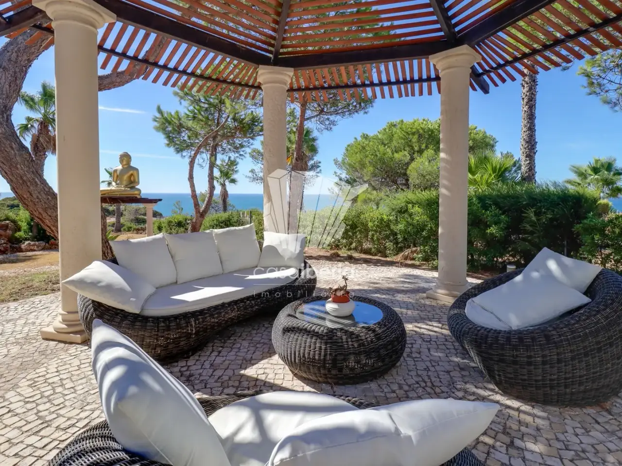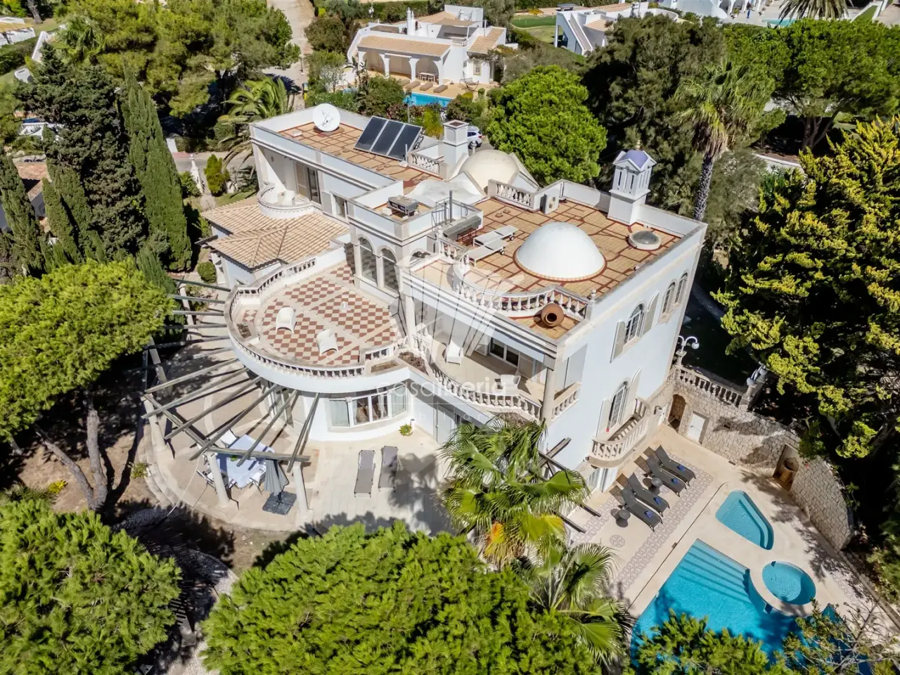 A True Oasis of Luxury on the Frontline of the Sea, A Palatial Residence Offering Harmony, Endless Views and Exclusivity in Carvoeiro. Set in a prestigious clifftop development in Carvoeiro, with the Atlantic Ocean stretching out in front and offering absolutely breathtaking views, this luxurious frontline property, designed in the style of a small palace , stands out as one of the most exclusive and rare offerings on the Portuguese real estate market. Crafted to provide not only comfort and elegance but also wellness and harmony, the residence was designed according to Feng Shui principles. Each room has been strategically placed to ensure the smooth flow of energy, creating a balanced and welcoming atmosphere, ideal for those who value a life of serenity. The residence is spread across three floors. Ground Floor: A spacious hall with soaring ceilings and a beautiful staircase leading to the upper level. A large, harmonious living room with fireplace and sea views opens directly onto the terrace and garden. The south-facing dining room offers a refined, light-filled setting. The fully equipped kitchen includes a pantry and separate laundry room . This floor also includes two bedrooms en-suite. For added convenience, there is a private garage with direct access to the house. First Floor: The spacious master suite serves as a perfect private retreat, accompanied by another en-suite bedroom. A south-facing balcony between them reveals uninterrupted ocean views, while a second, north-facing balcony adds further outdoor space to this level. Rooftop Terrace: At the very top, a breathtaking panoramic roof terrace. Lower Floor: Designed for leisure, this level features a large living area with fire place, a cosy bar, and a guest bathroom with directly acess to the garden and pool area, an ideal space for entertaining . The beautifull landscaped garden incorporates calming water features, a pond fountains, that enhance the tranquil ambiance. Seaside seating areas are perfect for relaxing or socializing with family and friends. The swimming pool includes a separate children's area, an outdoor shower, support bathroom, and storage. The leisure area also offers a barbecue space and a pergola with lounge seating , the perfect spot to relax and soak up the stunning sea views. Walking paths elegantly connect the different corners of the garden. More than a Home , a lifestyle, this is a unique opportunity to acquire a frontline luxury residence, Everything is within easy reach, restaurants, cafes, a supermarket, and the beach, while the Nobel International School is just about 10 minutes away by car. For those seeking more than just a home, a true sanctuary of luxury and harmony, this is your moment. Don't wait, contact us today.
