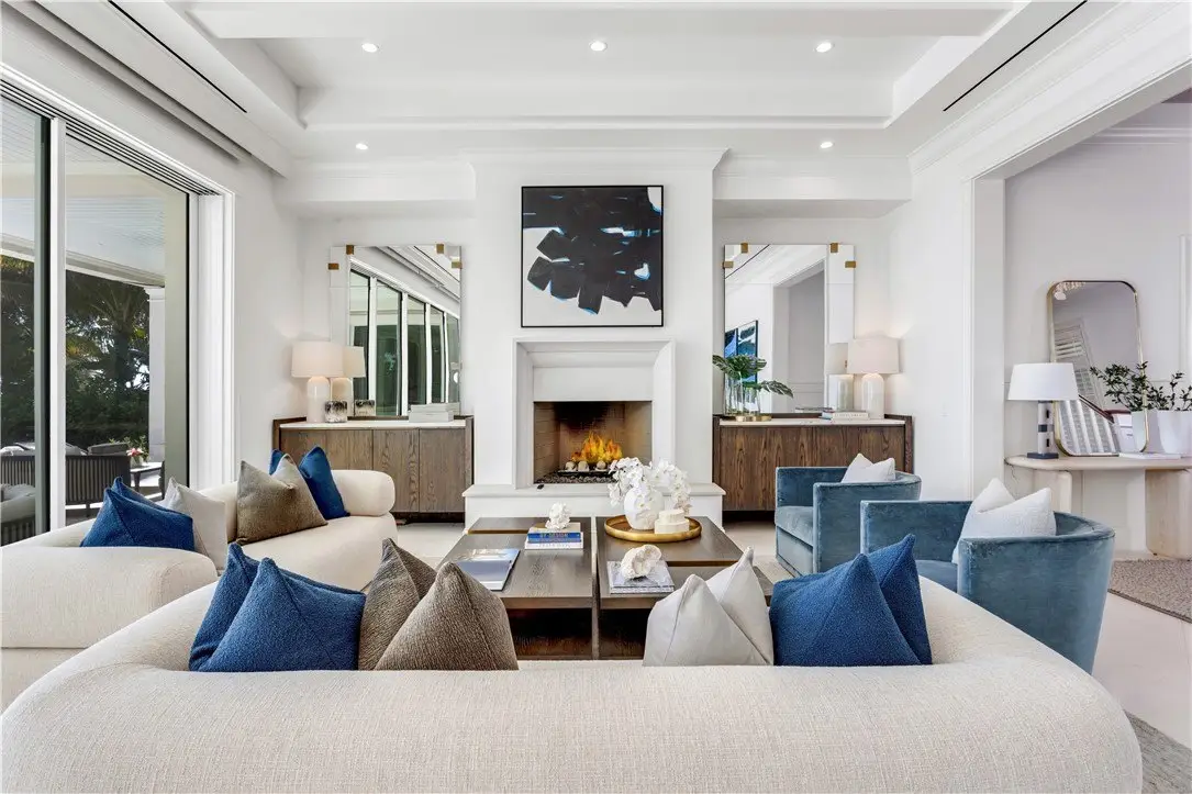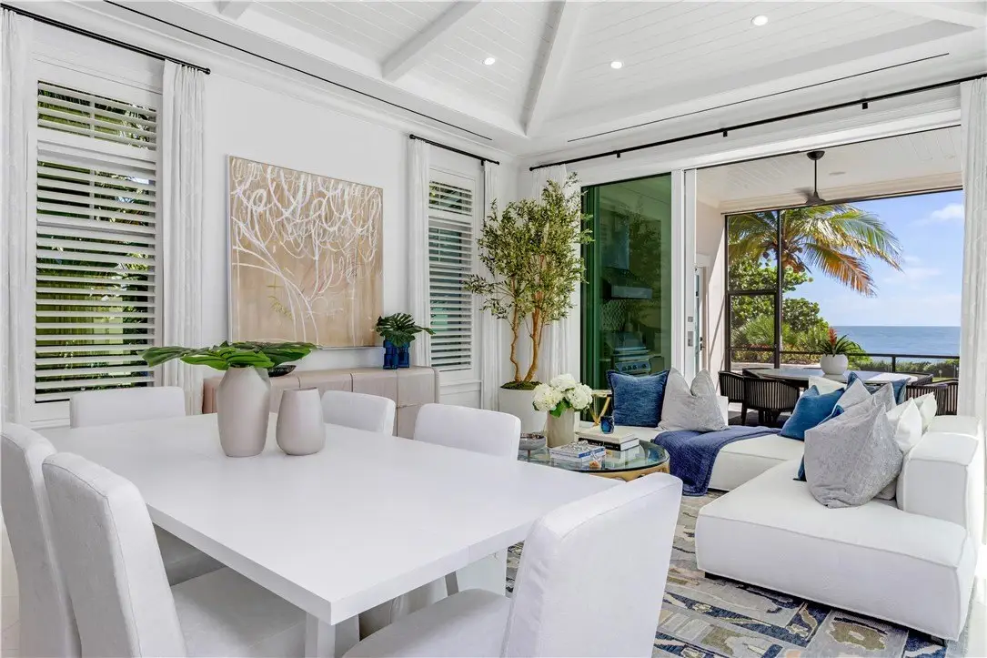 Discover luxury oceanfront living on 1.09 elevated and secluded acres with 104' of beach frontage. Built in 2016, this 5BR/5.4BA coastal estate has dual primary suites, private guest suite, gourmet kitchen, custom office, SAVANT system, custom bar, elevator and laundry rooms on both floors. Effortless outdoor living from breezy terraces, resort-style pool/spa, summer kitchen, putting green, meticulous landscaping, 4 car garage, gated drive and seawall. Near Moorings Yacht Country Club, marina. Miles from public beach access. Partial staging by Vesta Homes-furniture available for purchase.