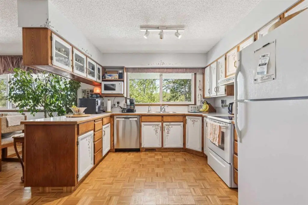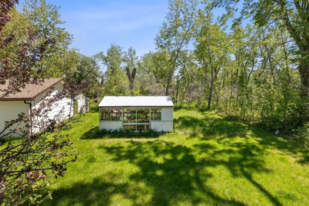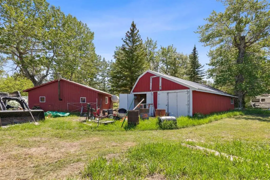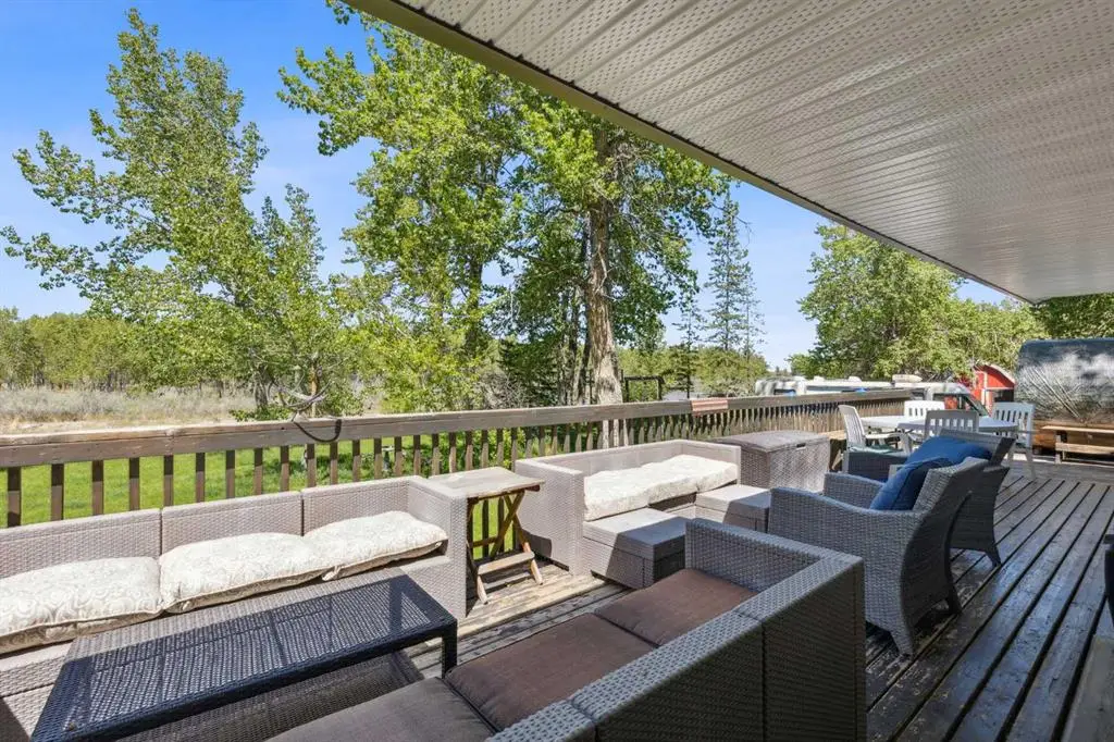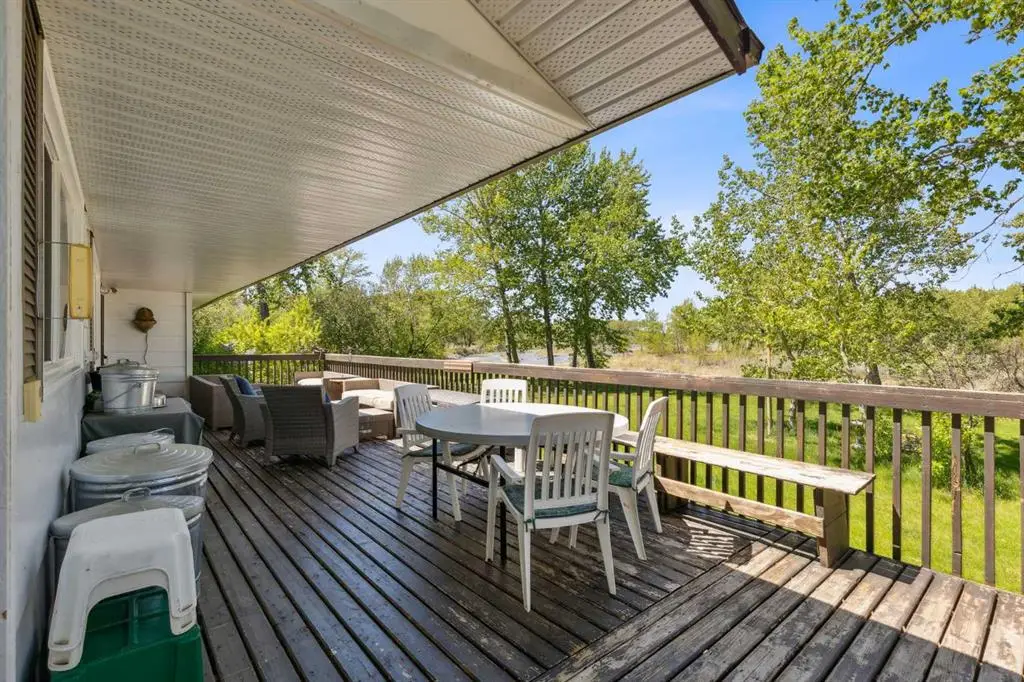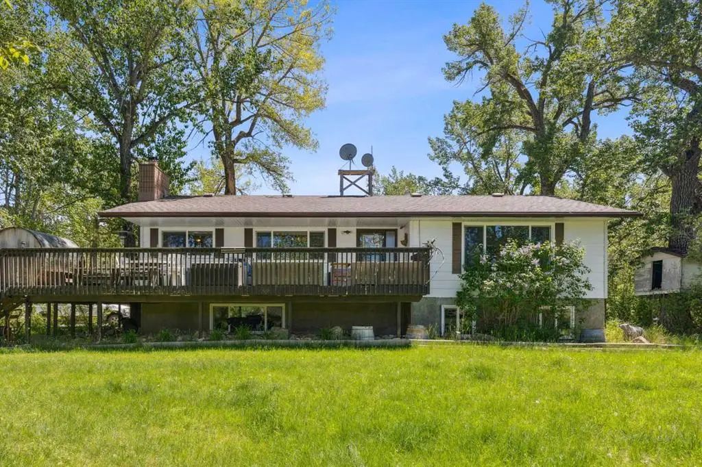 Discover the perfect blend of tranquility and recreation just outside of town with this exceptional property, set on 10 beautifully landscaped acres with 1,200 feet of private riverbank. This unique retreat offers year-round serenity and a wealth of outdoor activities, including swimming, snorkeling, tubing, and canoeing in the summer, as well as snowshoeing in the winter. The property sits 18 feet above the flood barrier berm in SW High River, ensuring safety and peace of mind. The basement experienced about 3 feet of water and river mud in 2013, but it has been fully remediated, making it ready for your personal touch. The main house is a charming raised bungalow featuring 1,385 sq ft of comfortable living space, including 3 bedrooms and 1.5 bathrooms. It boasts an original kitchen with updated appliances, new windows and a spacious living area. Step through the dining room access door onto a massive 1,300 sq ft deck, designed for relaxation while you listen to the soothing sounds of the river and the gentle rustle of trees. Unwind in the inviting cedar sauna, perfect for enjoying after a long day. Recent updates include new soffits and eavestroughs, replaced in 2022. Embrace the bounty of nature with chokecherry trees, saskatoon berries, raspberry bushes, a pear tree, an apple tree, ornamental cherries, and rhubarb flourishing on the property. The greenhouse, complete with blueberries, strawberries and edible cherries, and the garden is currently thriving with potatoes, chives, and asparagus. Additional features include a detached double garage next to the house, a small workshop behind the garage, and a larger 22.11'x22.11' shop with electricity. The owner has taken tremendous care and maintenance to riprap the riverbank to create stability and security. He planted willows as well to further stabilize the soil. This property is truly one-of-a-kind! Although you sit on the outskirts of town within 5-10 minutes you have access to the hospital, grocery stores, banking and anything else you need. Schedule a showing today to experience the beauty and potential for yourself!