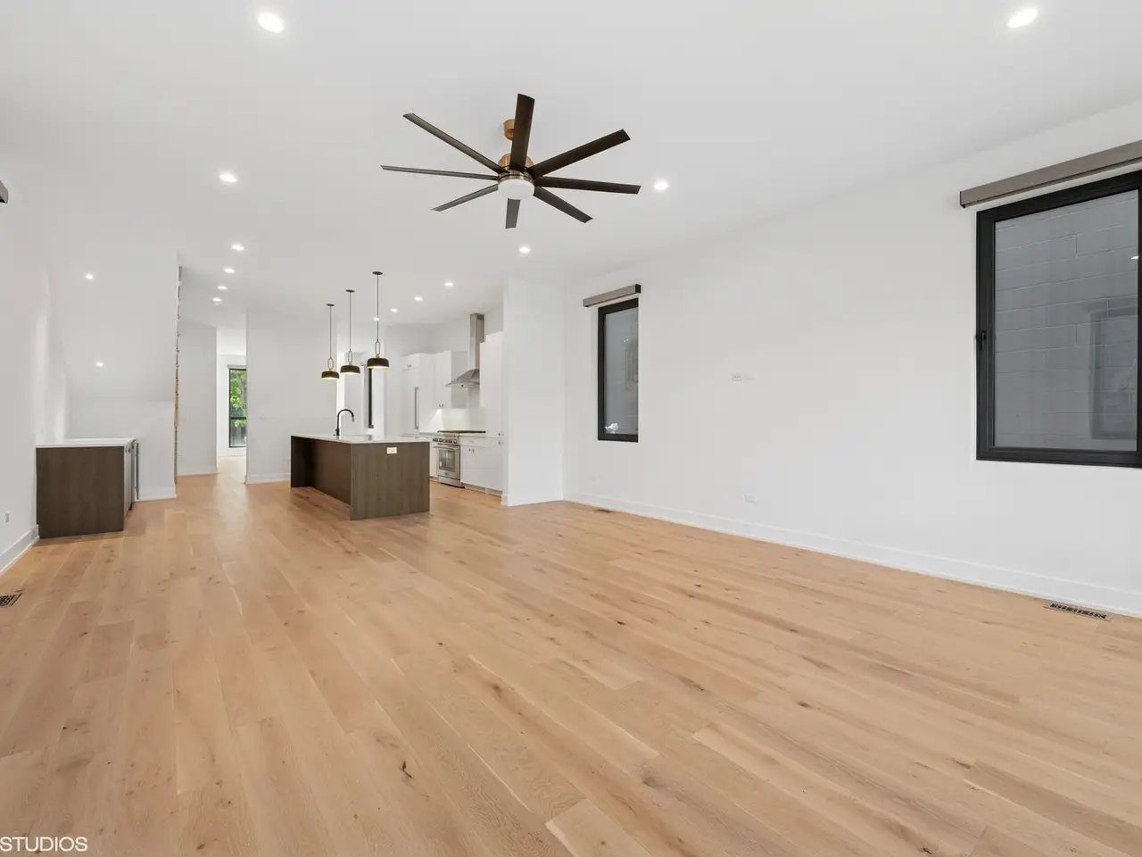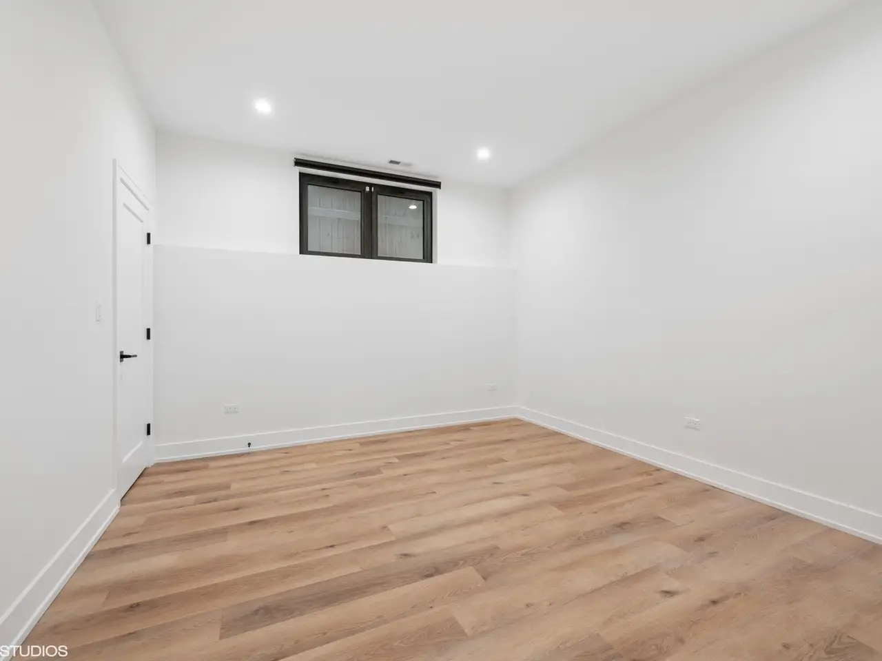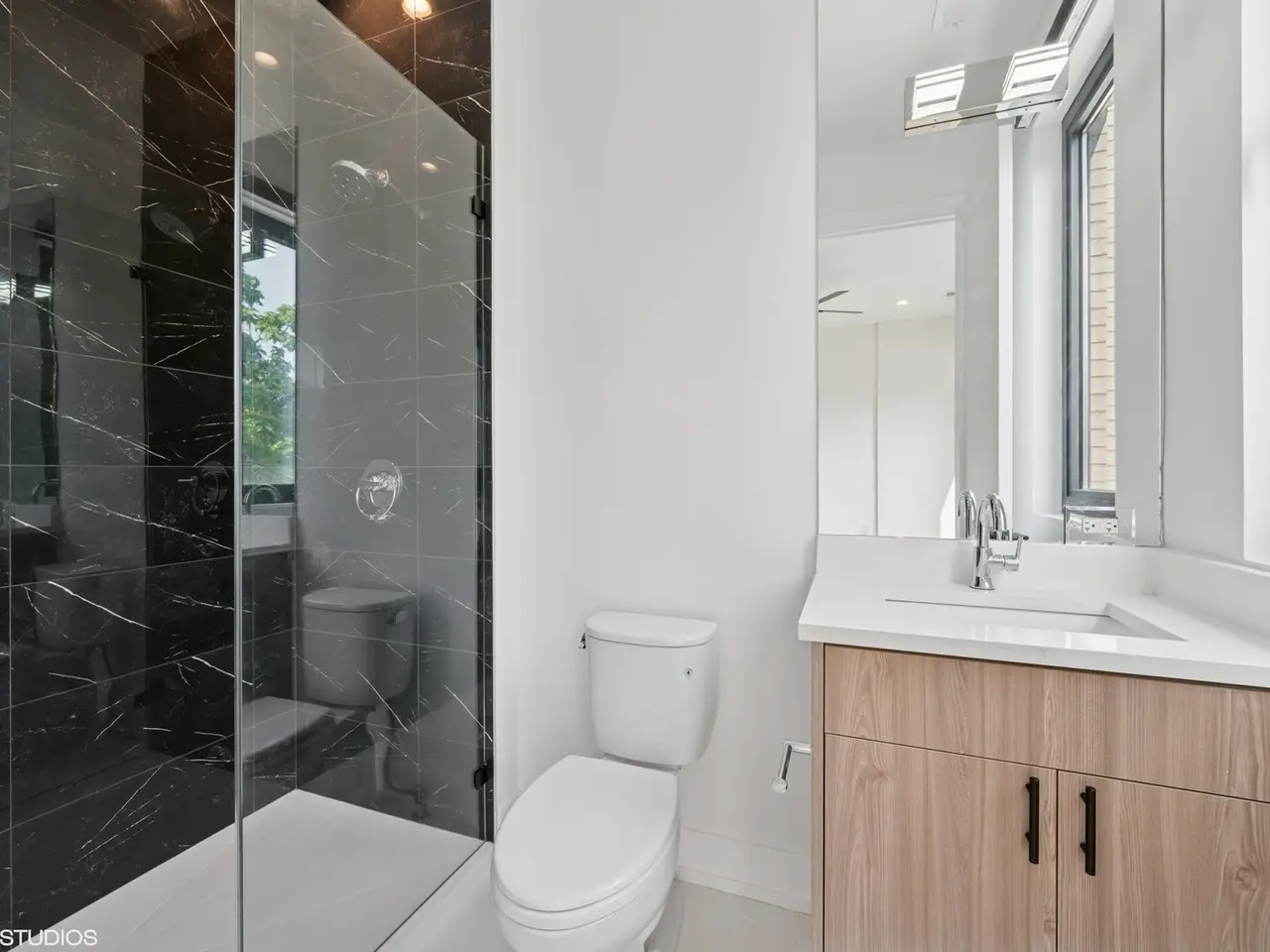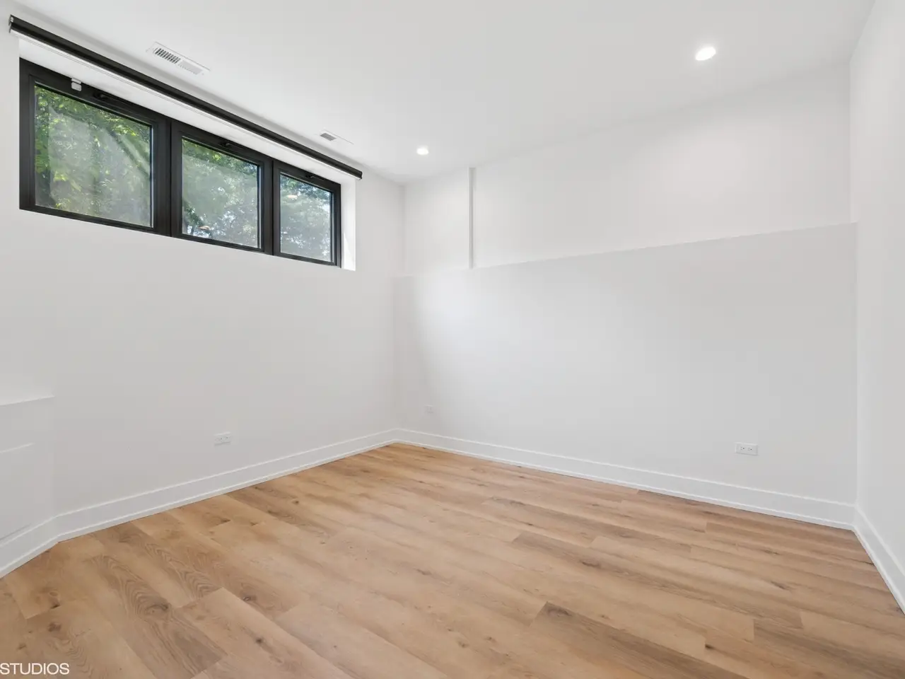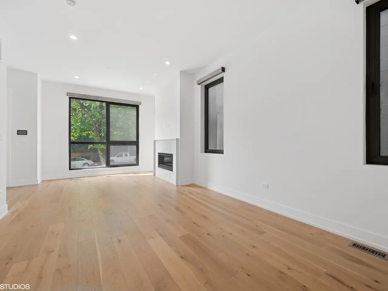Newly constructed in 2023, this elegant single-family home in West Town seamlessly blends modern luxury with functional design. This 5-bedroom, 4.5-bathroom residence features a full rooftop deck, a garage deck, and a spacious grass front yard and backyard. Lumini windows and 6.5-inch wide-plank hardwood floors enhance the interior's sophistication. The open floor plan showcases a bright, south-facing living and dining area with a quartz-surround fireplace. The gourmet kitchen boasts high-end Thermador appliances, Brizo fixtures, and a large quartz island. Post-construction upgrades include high-end motorized window shades, custom closets, and dual HVAC systems for year-round comfort. The second floor offers three bedrooms, each with en-suite bathrooms, and a convenient side-by-side laundry closet with a countertop. The primary suite features two spacious closets and a spa-like bathroom with an extended double vanity, heated floors, a freestanding soaking tub, and a multi-jet glass shower. The lower level includes two large bedrooms, a recreation room with a den and wet bar, a full bathroom, extra storage, and an additional laundry hookup. The recreation room's den, enclosed by barn doors, provides versatile space for an office, gym, or guest room. Ideal for entertaining, the home features a stunning rooftop deck with skyline views and a backyard perfect for grassy turf or a paved patio. A two-car garage with an additional deck expands outdoor living options. Located in vibrant West Town, steps from West Loop, this home is surrounded by top-tier restaurants and boutique shops.