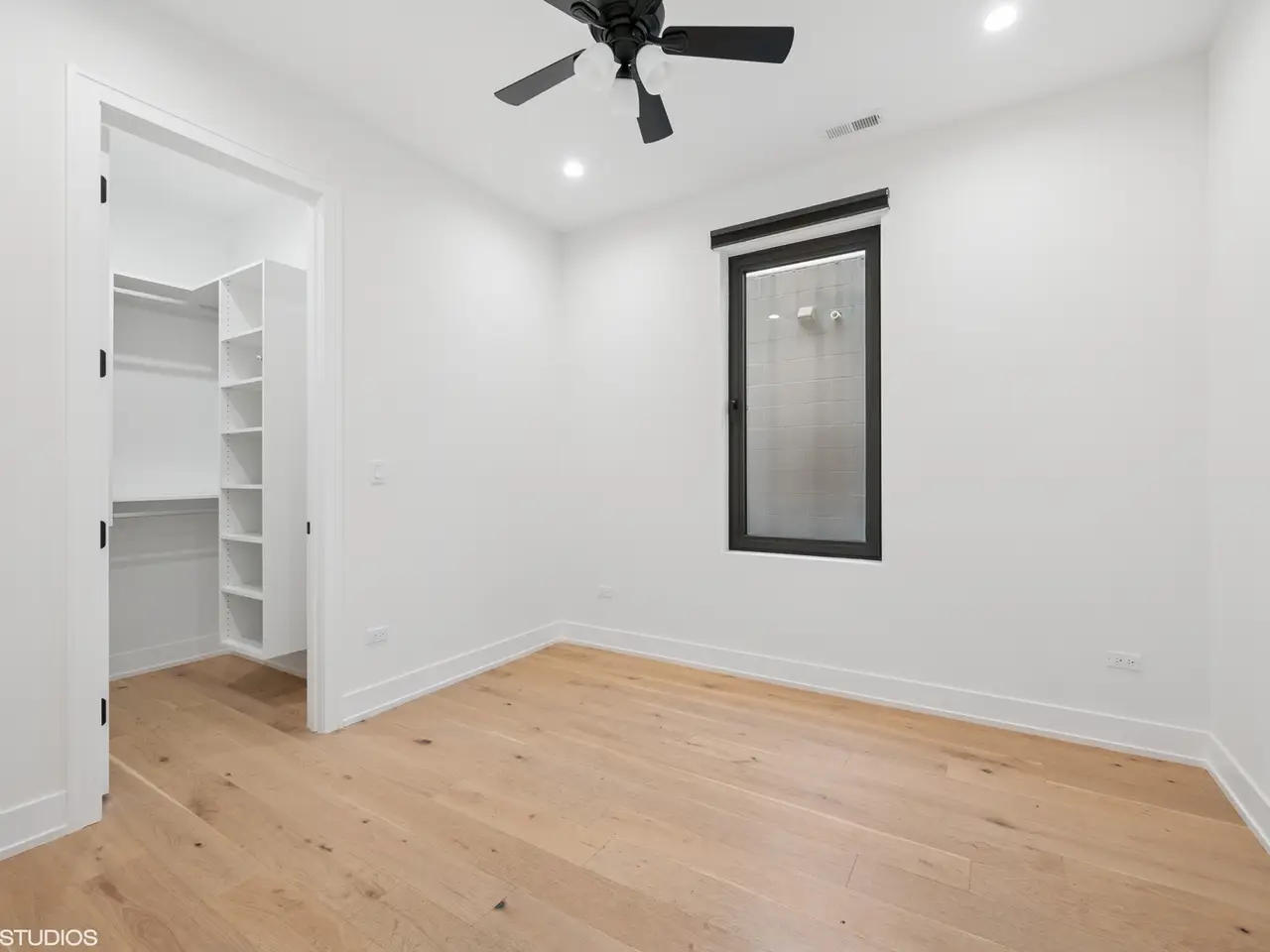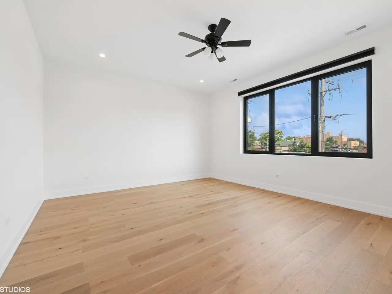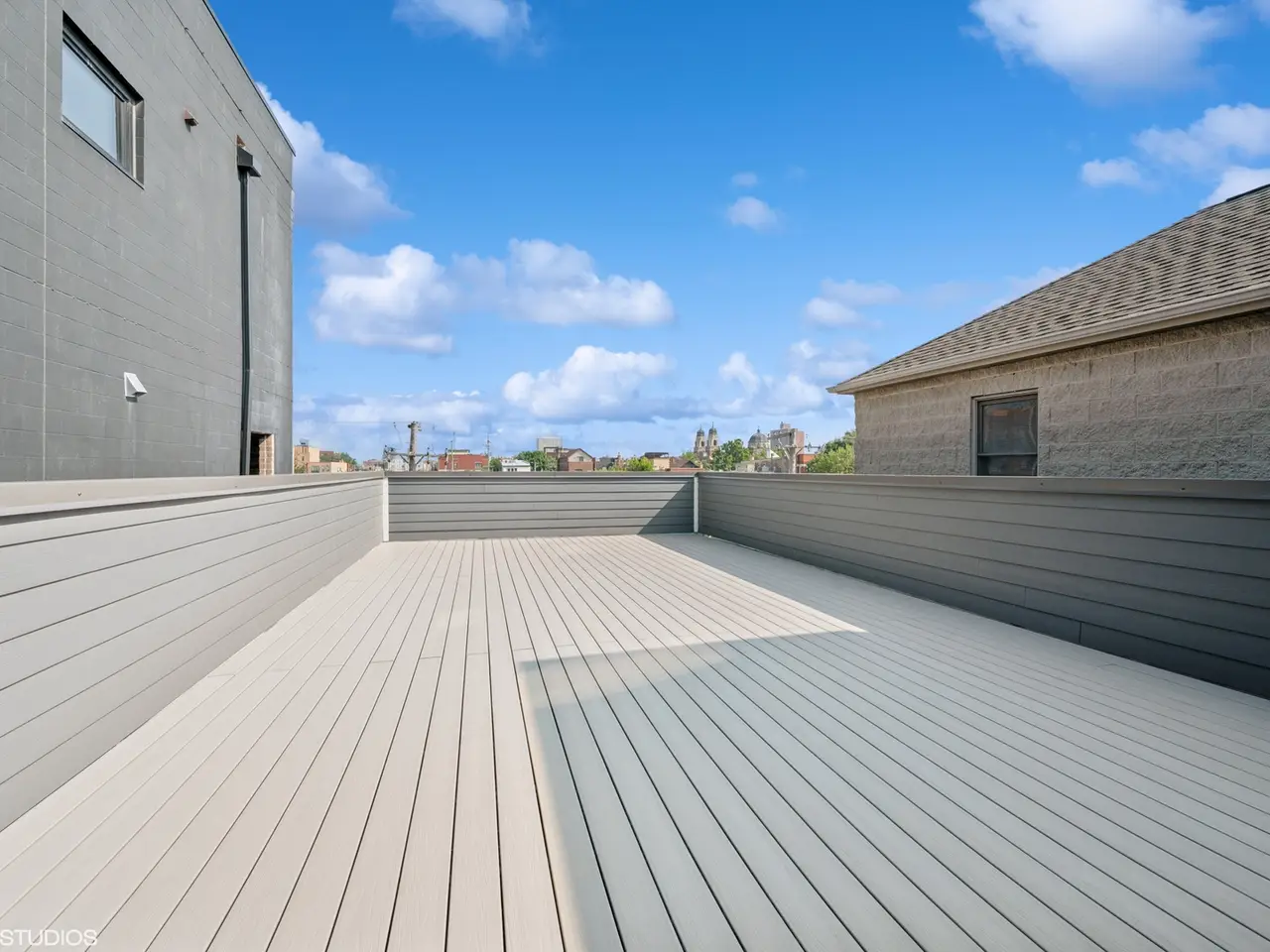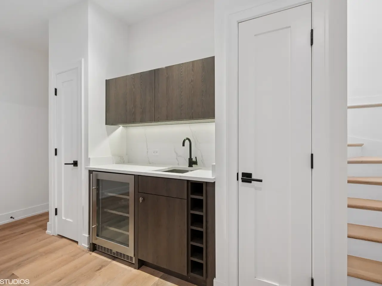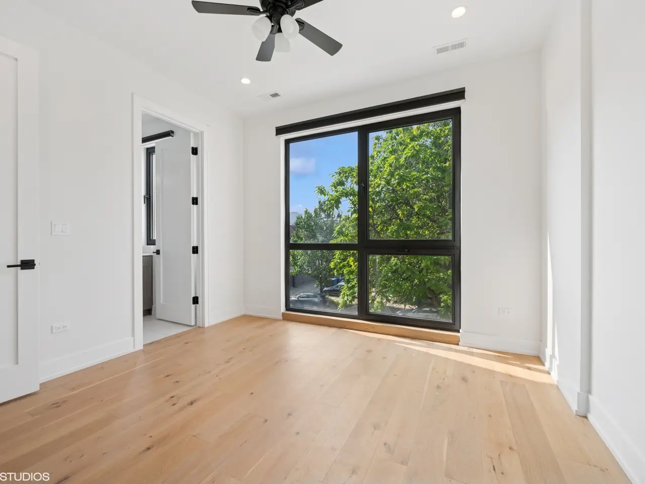 Newly constructed in 2023, this elegant single-family home in West Town seamlessly blends modern luxury with functional design. This 5-bedroom, 4.5-bathroom residence features a full rooftop deck, a garage deck, and a spacious grass front yard and backyard. Lumini windows and 6.5-inch wide-plank hardwood floors enhance the interior's sophistication. The open floor plan showcases a bright, south-facing living and dining area with a quartz-surround fireplace. The gourmet kitchen boasts high-end Thermador appliances, Brizo fixtures, and a large quartz island. Post-construction upgrades include high-end motorized window shades, custom closets, and dual HVAC systems for year-round comfort. The second floor offers three bedrooms, each with en-suite bathrooms, and a convenient side-by-side laundry closet with a countertop. The primary suite features two spacious closets and a spa-like bathroom with an extended double vanity, heated floors, a freestanding soaking tub, and a multi-jet glass shower. The lower level includes two large bedrooms, a recreation room with a den and wet bar, a full bathroom, extra storage, and an additional laundry hookup. The recreation room's den, enclosed by barn doors, provides versatile space for an office, gym, or guest room. Ideal for entertaining, the home features a stunning rooftop deck with skyline views and a backyard perfect for grassy turf or a paved patio. A two-car garage with an additional deck expands outdoor living options. Located in vibrant West Town, steps from West Loop, this home is surrounded by top-tier restaurants and boutique shops.