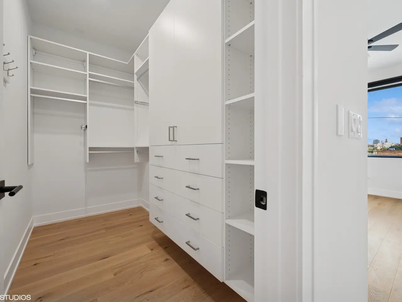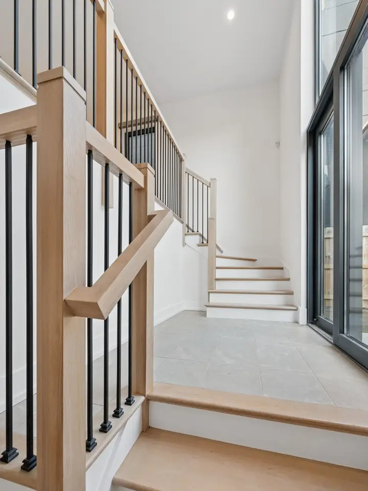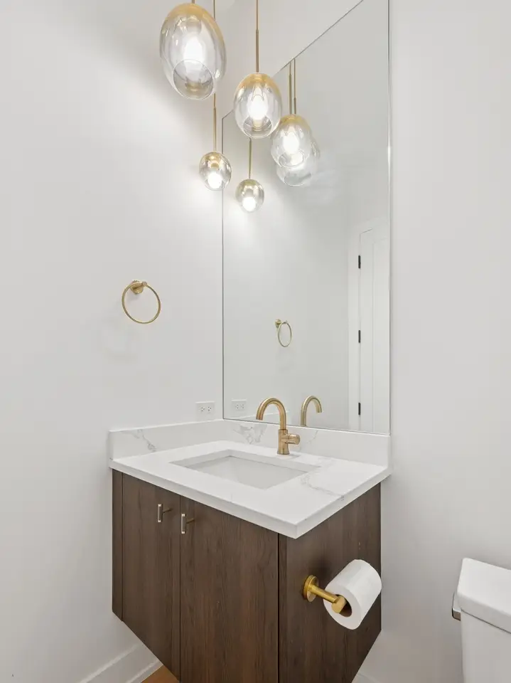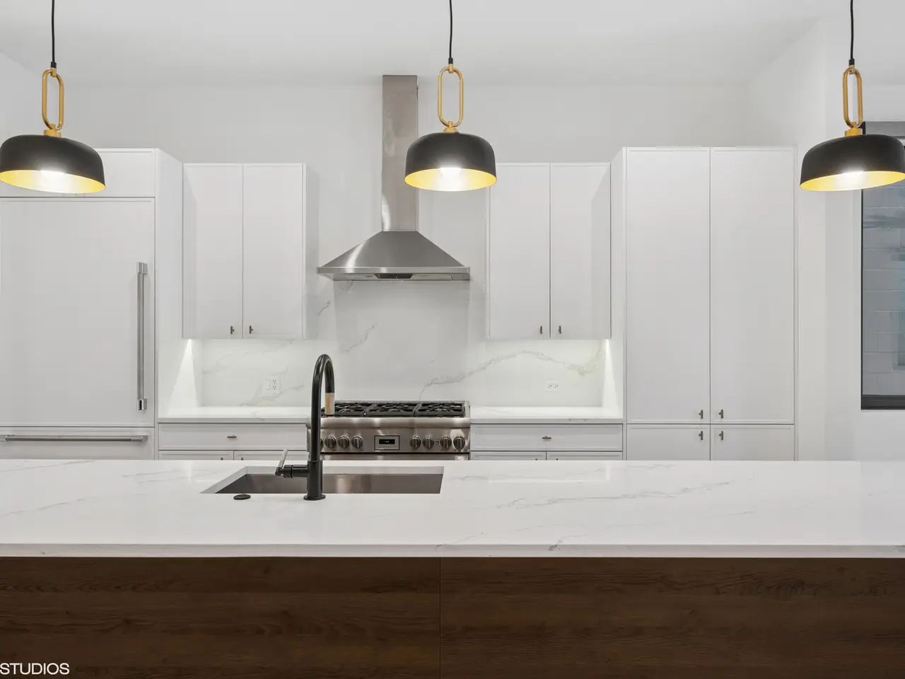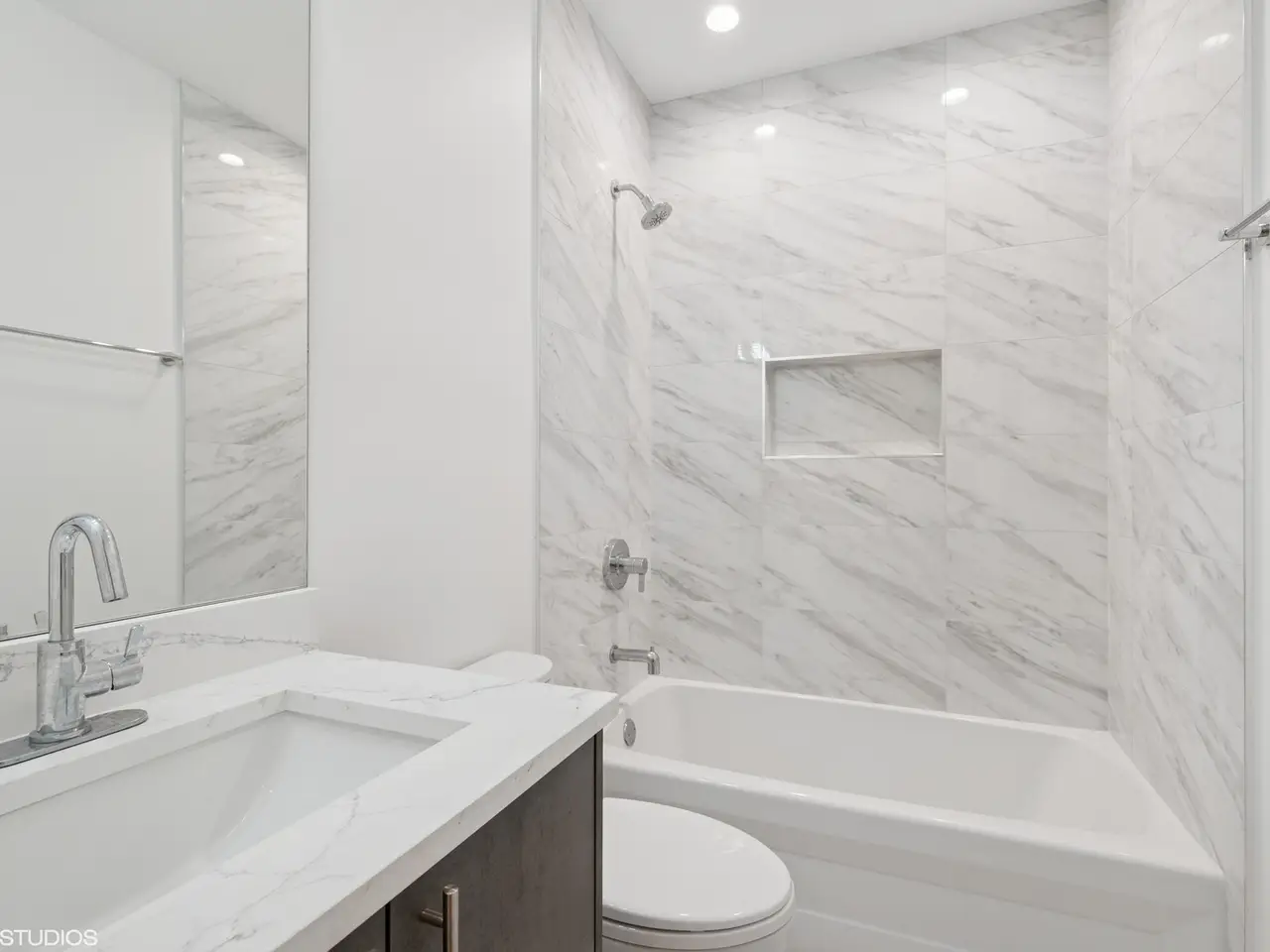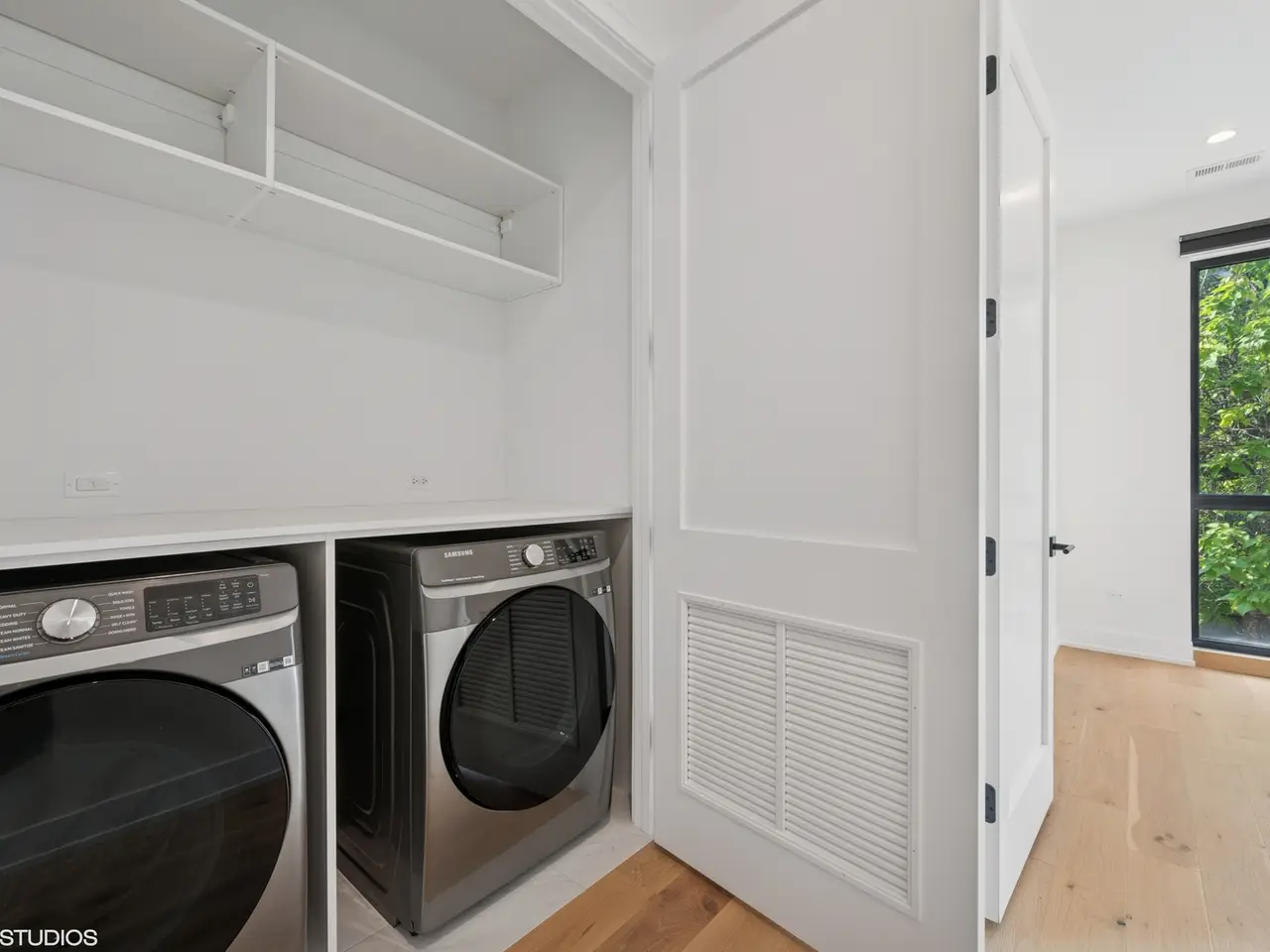 Newly constructed in 2023, this elegant single-family home in West Town seamlessly blends modern luxury with functional design. This 5-bedroom, 4.5-bathroom residence features a full rooftop deck, a garage deck, and a spacious grass front yard and backyard. Lumini windows and 6.5-inch wide-plank hardwood floors enhance the interior's sophistication. The open floor plan showcases a bright, south-facing living and dining area with a quartz-surround fireplace. The gourmet kitchen boasts high-end Thermador appliances, Brizo fixtures, and a large quartz island. Post-construction upgrades include high-end motorized window shades, custom closets, and dual HVAC systems for year-round comfort. The second floor offers three bedrooms, each with en-suite bathrooms, and a convenient side-by-side laundry closet with a countertop. The primary suite features two spacious closets and a spa-like bathroom with an extended double vanity, heated floors, a freestanding soaking tub, and a multi-jet glass shower. The lower level includes two large bedrooms, a recreation room with a den and wet bar, a full bathroom, extra storage, and an additional laundry hookup. The recreation room's den, enclosed by barn doors, provides versatile space for an office, gym, or guest room. Ideal for entertaining, the home features a stunning rooftop deck with skyline views and a backyard perfect for grassy turf or a paved patio. A two-car garage with an additional deck expands outdoor living options. Located in vibrant West Town, steps from West Loop, this home is surrounded by top-tier restaurants and boutique shops.