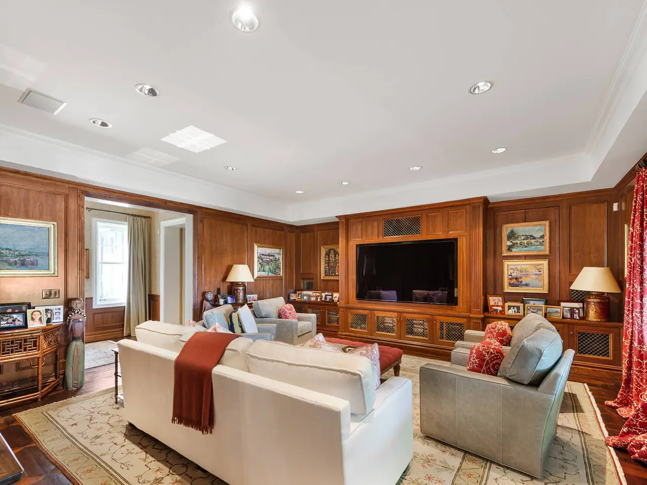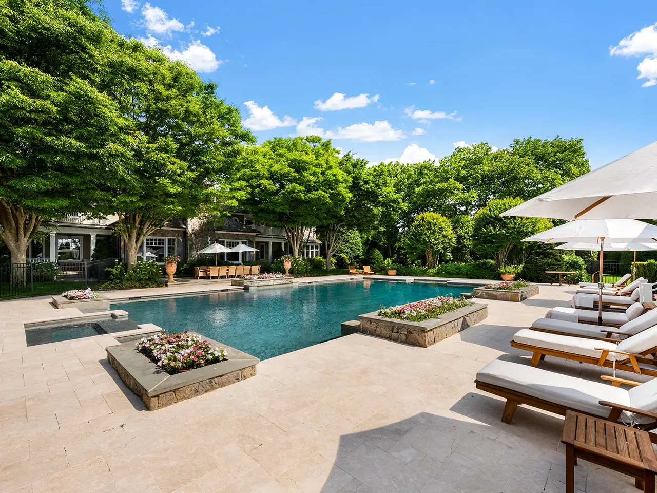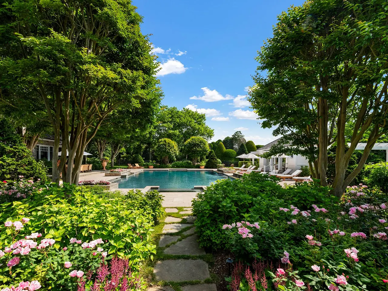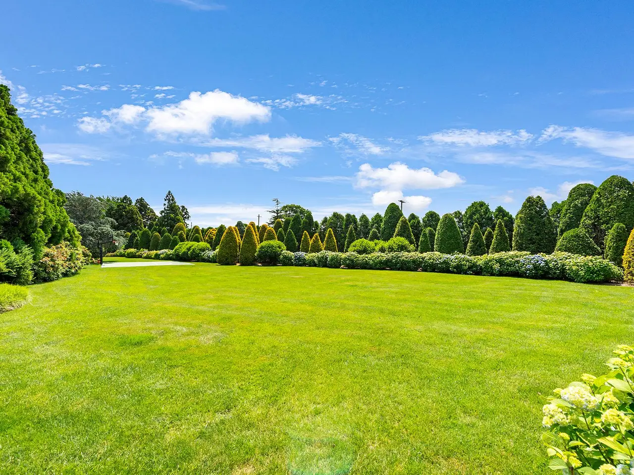 Located south of the highway in Southampton's prestigious Fordune Association and just moments from the ocean and very close to town, this exceptional estate represents the epitome of luxury living in the Hamptons. Spanning over 5.5 acres, the property boasts expansive lawns, meticulously-maintained gardens and millions of specimen plantings, ensuring unmatched privacy, tranquility and a parklike, amenity-rich environment. Built under the most rigorous commercial building standards/codes, every aspect of this turnkey estate, from its grand architectural design to its lavish interiors, showcases a dedication to excellence and sophistication. The compound includes a magnificent residence of approximately 20,000 square feet (including the finished lower level) and a 2,634 square foot accessory building that serves as a state-of-the-art fitness center with a gym, yoga studio with a 4-station yoga wall, massage room, spa and salon (for your private hair stylist). The grounds also feature a pool house, saltwater 40x60 swimming pool, tennis court with pavilion, basketball court and a 2-car garage/service building, primarily used for storing golf carts, which provide access to the ocean beach via the Fordune Association's beach access right of way. The main house is constructed with a combination of wood frame and structural steel, featuring western red cedar shingles and northeastern granite in a random pattern on parts of the façade, along with a recently replaced western red cedar roof. The home includes 13 bedrooms, 14 full baths and two half baths. The interior spaces are vast, with a grand foyer boasting 20-foot-high ceilings and a one-of-a-kind Natural American and Brazilian walnut staircase and wood flooring. Further on, the impressive 35 x 25 foot living room offers 21 foot ceilings. This sublime space includes a fireplace and walls of glass overlooking the expansive terraces and pool area. Off the living room, the east wing first floor houses a media room, a beautiful office/library with a stunning walnut finish and coffered ceilings, plus a bedroom suite. The second floor of the east wing, accessed by the main staircase in the foyer, includes a library and two bedroom suites, including the expansive primary bedroom. This suite features a sitting area, 4 closets, including a large walk-in, two bathrooms and a balcony overlooking the pool. The west wing first floor features two bedroom suites, plus a junior primary bedroom, a formal dining room and a professional kitchen that is both enormous and high-end, well-equipped and ideal for a private chef. The kitchen includes an expansive sitting area and a separate breakfast area. A second staircase leads to the very private guest wing with five bedroom suites. The generous lower level, accessible by two staircases, includes a state-of-the-art wine storage facility, a 400 square foot dedicated electrical, media, telephone and internet center, as well as a recreation room with a fireplace and media room. There is also a separate and private staff apartment with a living room, two bedrooms and two full baths.