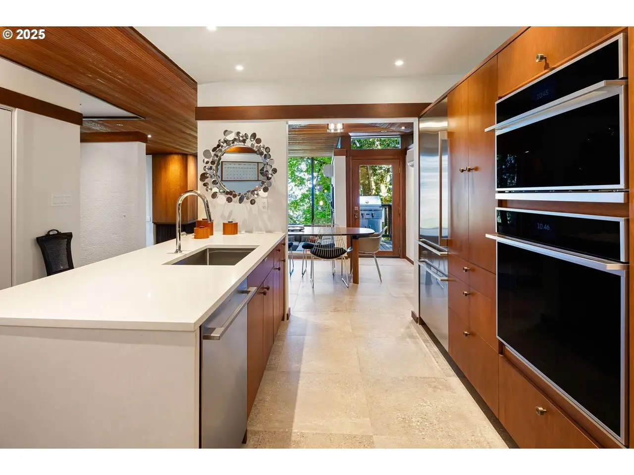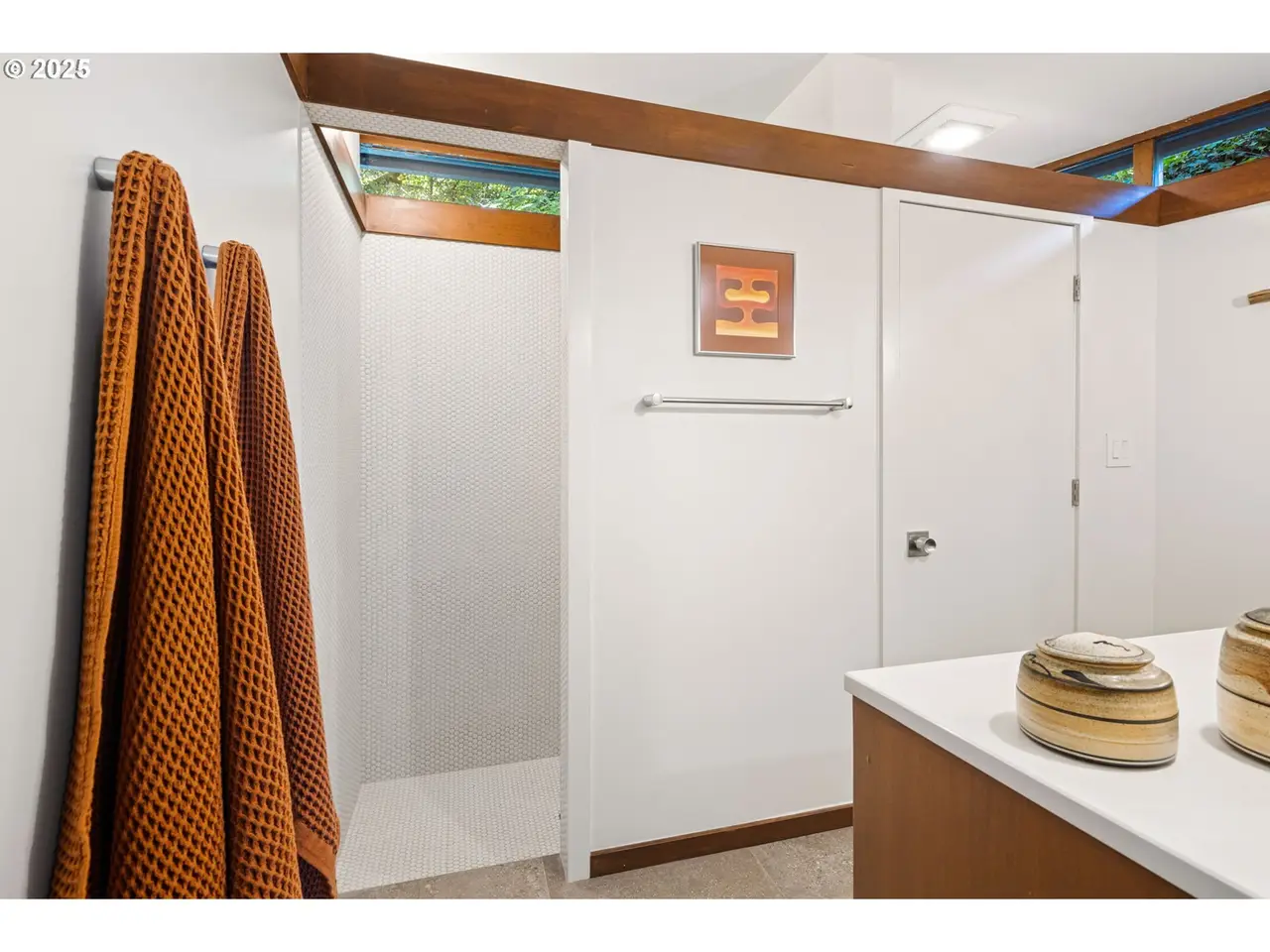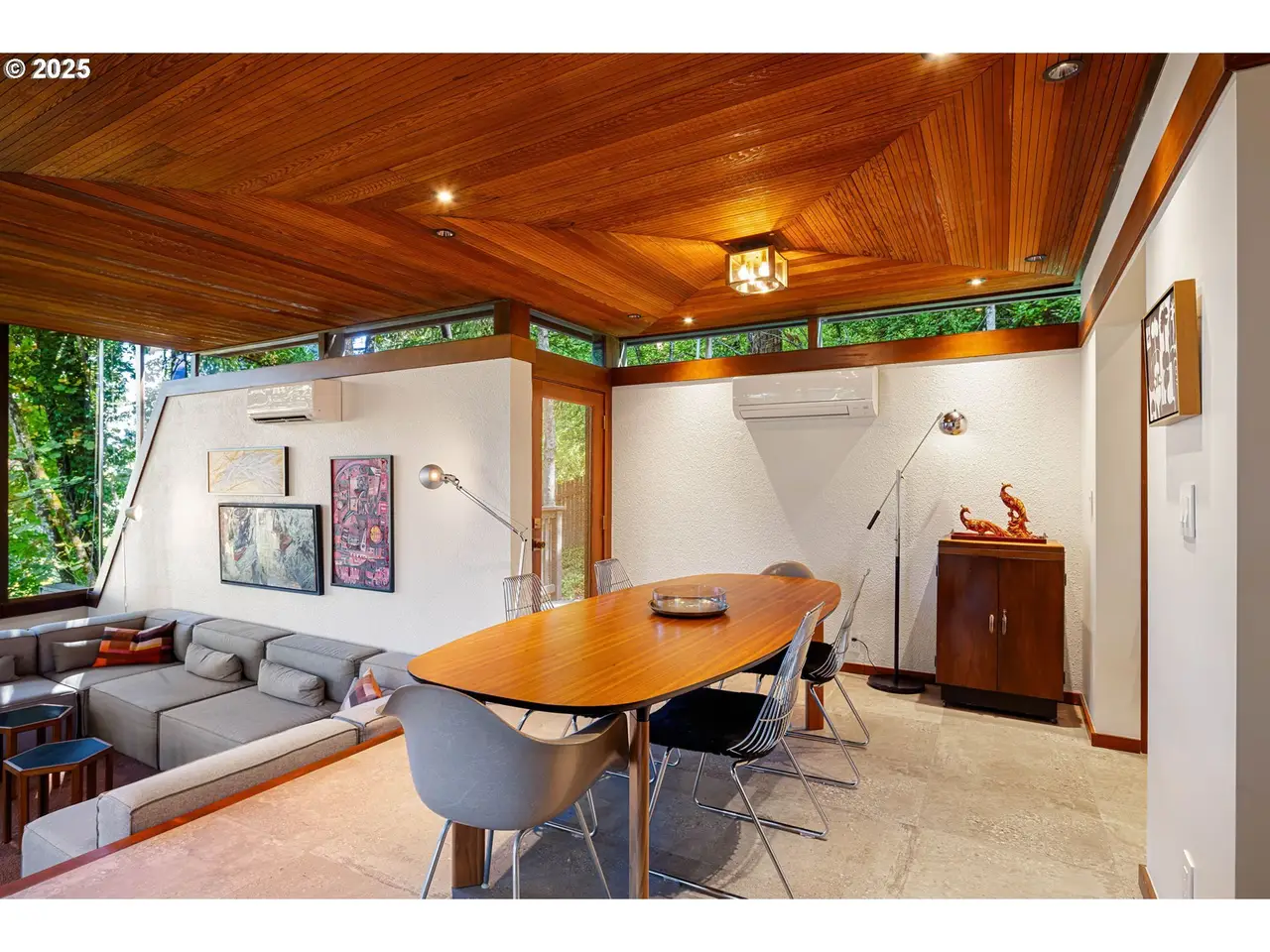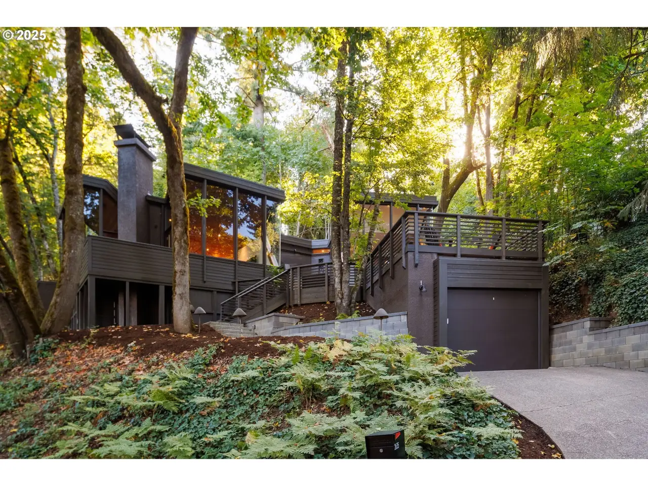 This iconic mid-century home is nestled amongst the trees near the University of Oregon, Hendricks Park and the Ridgeline Trail. The house was designed in 1965 by renowned Eugene architect Otto Poticha, and has been carefully renovated & reimagined to 21st century standards by exacting and creative owners. All the original integrity is intact, including solid cedar ceilings, and floor to ceiling picture windows w/ filtered views of downtown and coast range sunsets. Dramatic treehouse pavilions creatively showcase unique angles and sight lines. This stunning transformation provides a rare opportunity for architecture enthusiasts to buy an uncommon property that has been respectfully and thoroughly updated. Upon entering the home past a large entertaining deck, the main level includes a primary bedroom suite with laundry, kitchen, dining, sunken living room, porch and deck. The lower level has another bedroom/bathroom suite and storage areas. Every feature has been renovated for convenience and livability: new membrane roof, electrical panels, HVAC, water heater, decking, landscaping walls, kitchen, baths, flooring, doors, fixtures, hardware and finishes. This spectacular home awaits its next owners to fall in love with its warmth and magic. (No real estate sign at property.)