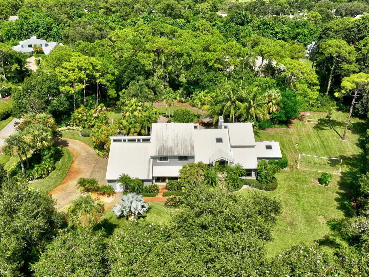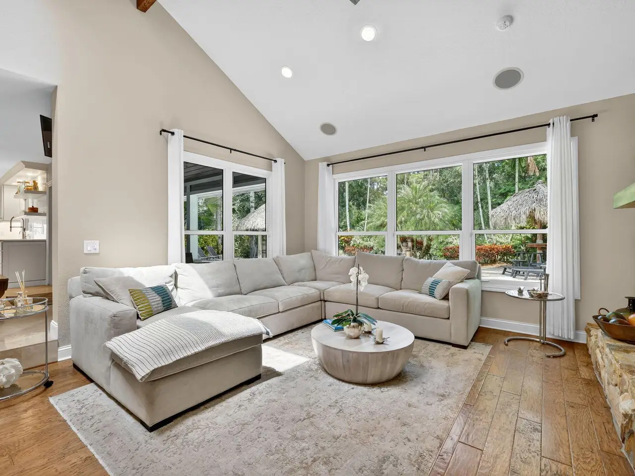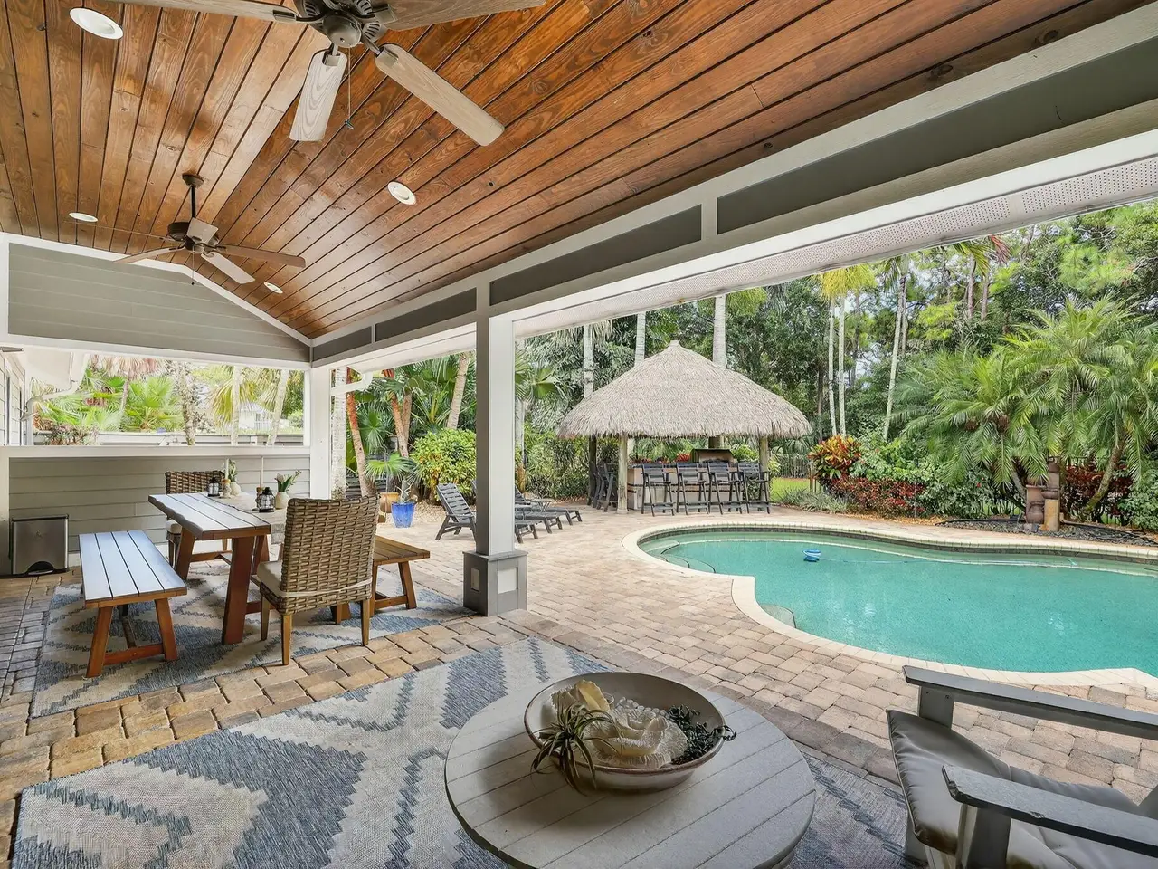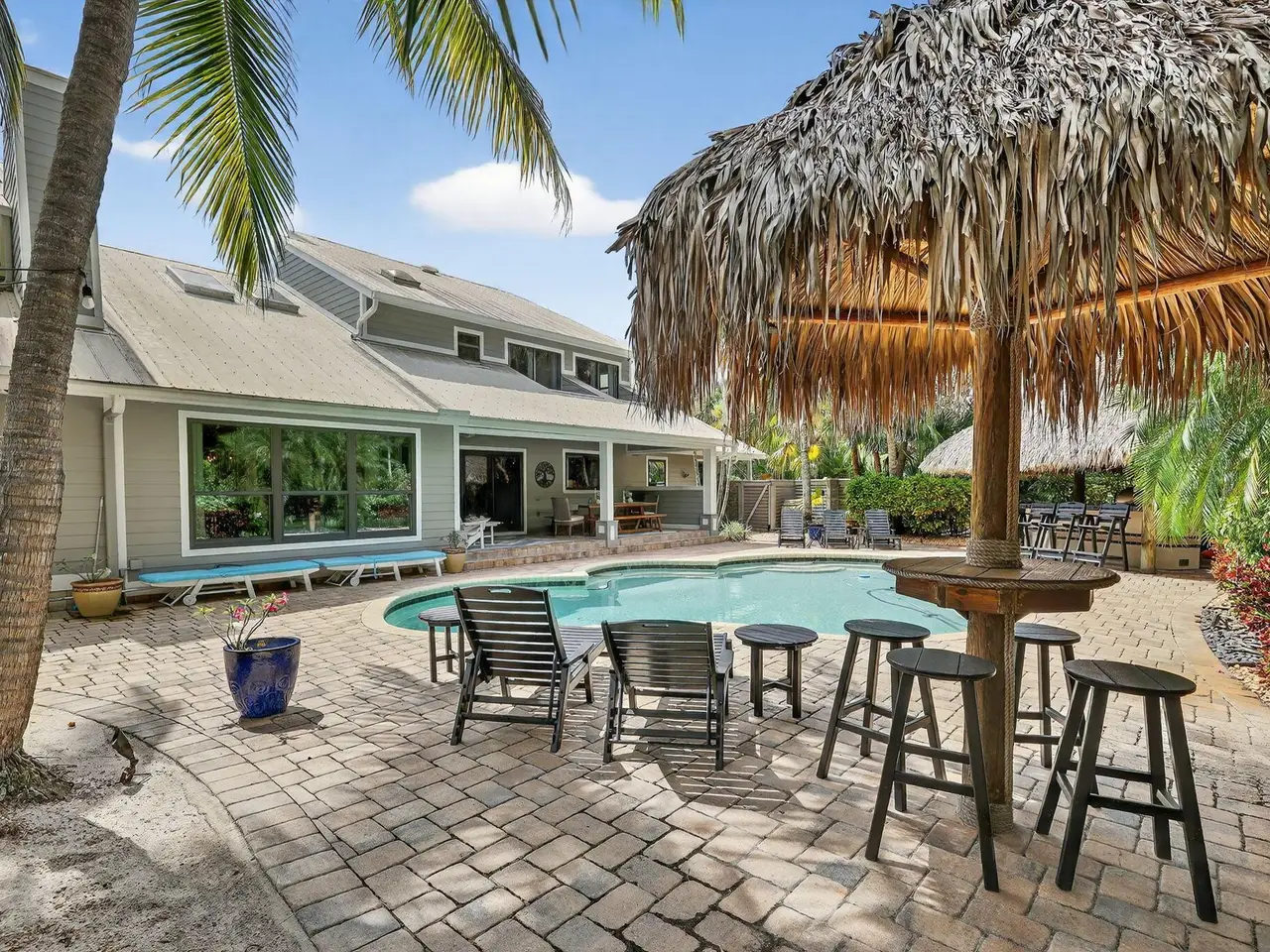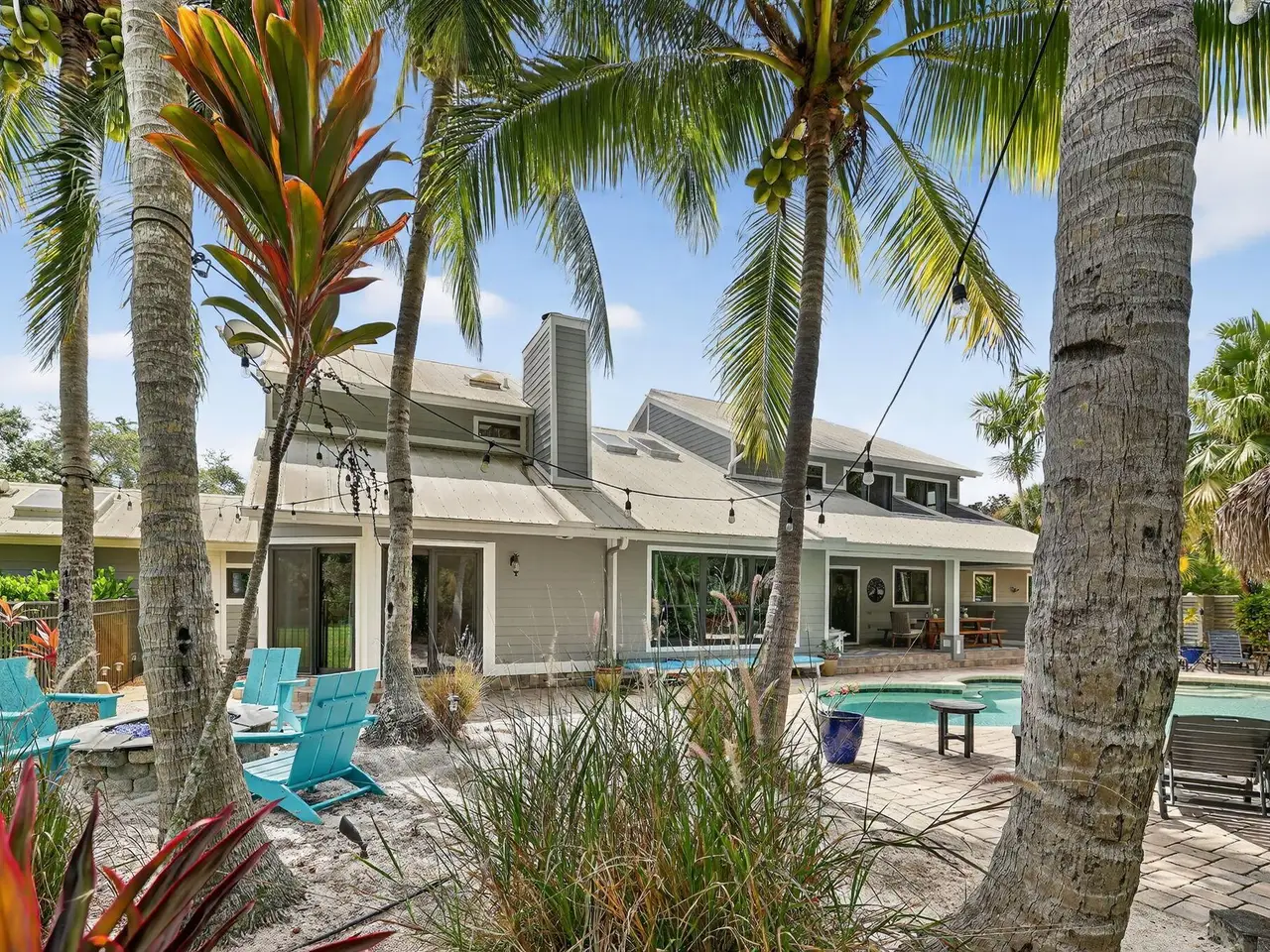 Live, work & play in your own tropical oasis! Nestled on over 1.5 lush acres in the heart of Palm City, this beautifully updated home features 5bed/3.5bath/3car, den & office spacious media room with closet and 2 gym studios. Enjoy over 5400+ sq ft of living space with room for everybody! Upgrades include impact windows and doors throughout, updated open kitchen with large island, quartz countertops and high-end appliances with master suite on main level with own sitting area. Step outside to your private paradise complete with tiki bar, grill & TV, cabana bath & saltwater pool with fire pit, perfect for year-round entertaining and relaxing in the Florida sunshine. Great location close to A-Rated schools, golf, tennis, I-95, Turnpike, fine and casual dining, beaches and PBI Airport.