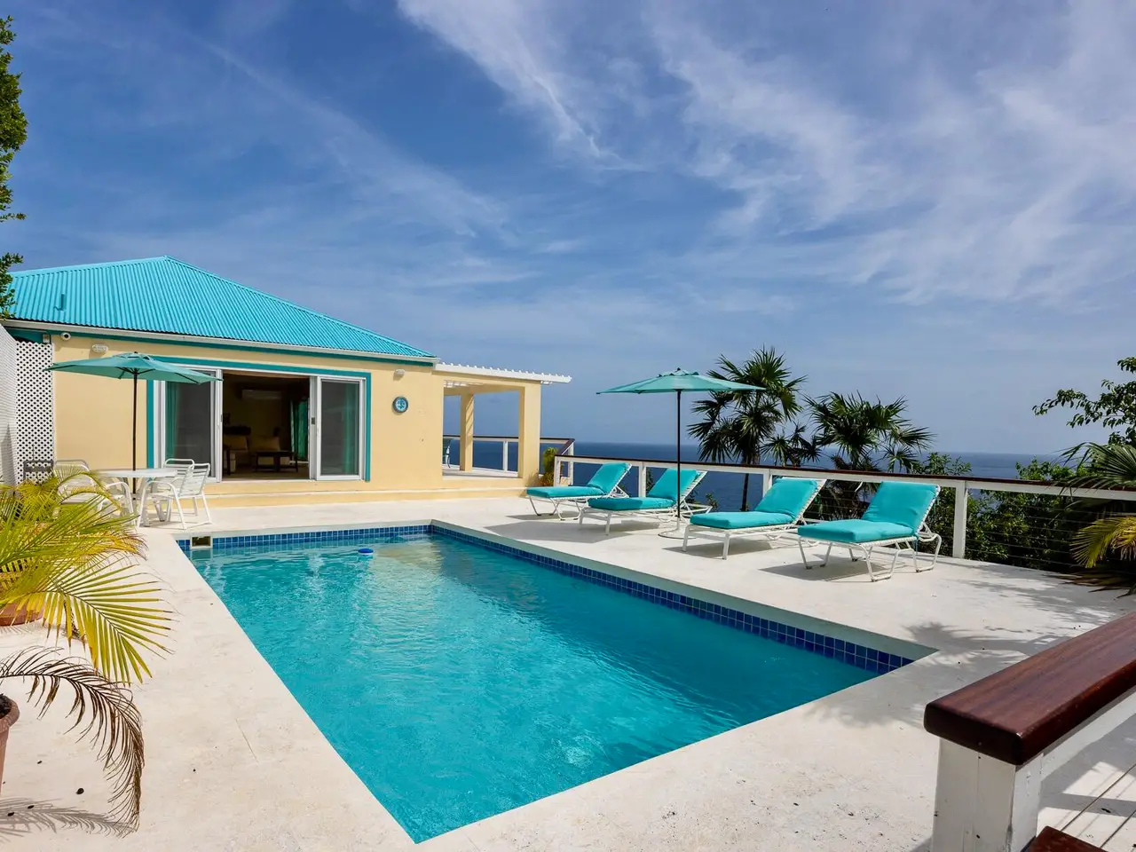 Fantastic opportunity to own a 4BR 4BA home in the prestigious, gated Peterborg enclave of Red Rock as well as a .54 adjacent parcel. This solid-concrete home boasts gorgeous down-island views and year-round trade-wind breezes. Easy, flat parking with minimal steps to the entrance of the main house!Enjoy the view from the veranda or relax on the large outdoor pool deck. There are 3-bedrooms in the main house with additional and separate apartment/guest room/office. All bedrooms have access to private outdoor areas and seating. Island charm and tropical living at its best!