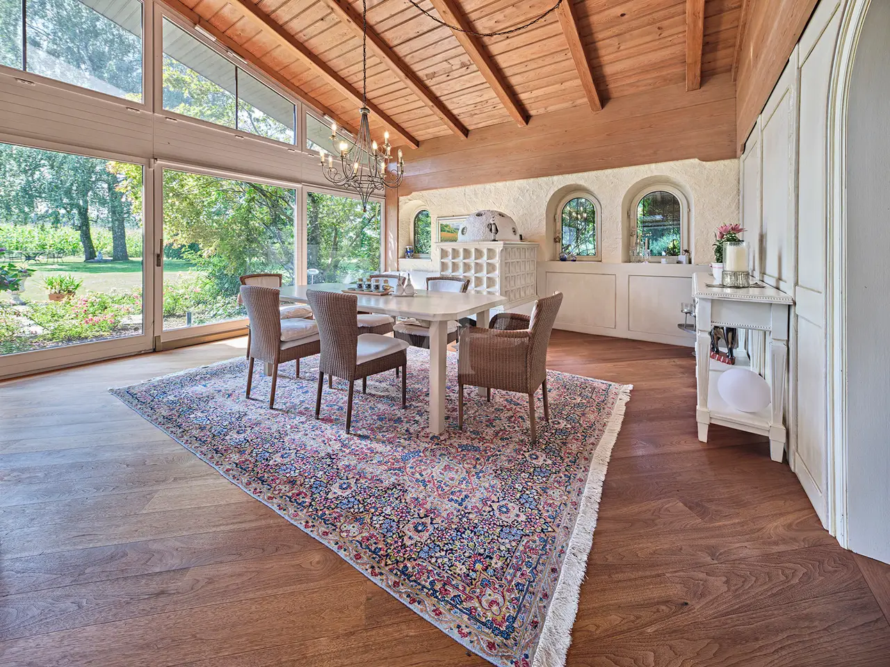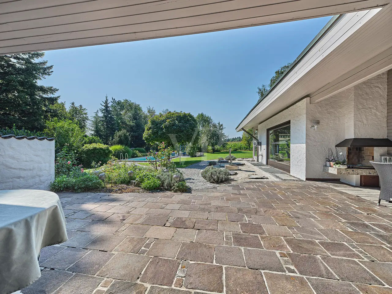 This spacious bungalow-style villa with room heights of up to 5 meters is located on a spacious 3,159 m² plot and offers a living space of around 330 m². The rooms are furnished to a high standard throughout and offer superior living comfort. Upon entering the house, you are greeted by a bright and spacious entrance area with a checkroom and access to the double garage. Numerous windows, some of which are floor-to-ceiling, provide plenty of natural light and an inviting atmosphere. The spacious living/dining room has a water-bearing tiled stove and large panoramic windows that lead onto the terrace and into the garden on the south side. The dining area forms a successful transition from the open-plan living area to the kitchen, which can be closed off. The fireplace room with indoor and outdoor fireplace is also ideal as a visitor or guest room. The kitchen, with high-quality slate flooring, has exclusive furnishings and brand-name electrical appliances. The master bedroom has a separate dressing room. The adjoining hallway is designed as a closet room and leads to two further bedrooms or children's rooms, each of which has its own conservatory. The daylight bathroom impresses with its comfortable fittings. A separate WC is available for guests. A particularly practical feature is that all rooms on the ground floor have their own terrace or garden access. The almost all-round natural stone terrace is partially covered and offers a variety of uses in almost any weather. The floors on the first floor are laid with very high-quality solid floorboards and parquet flooring. The doors are made of solid wood in an elegant arched style. The predominantly newly glazed wooden windows are fitted with custom-made fly screens. The basement offers additional comfort with a large spa area, including a swimming pool with counter-current system, a shower room, a sauna for 6-8 people, lounging areas and daylight windows. Four further basement rooms offer space for fitness/yoga, laundry, hobbies and a workshop. The fitness/yoga room has its own shower and WC. The heating is provided by district heating (wood chips). A photovoltaic system with an output of 10 kW and a Tesla buffer battery of the same size as well as a solar thermal system with a 750-liter buffer storage tank ensure an environmentally friendly energy supply. The outdoor area includes a tiled outdoor pool with a roll-down cover, a pavilion with thermal insulation glazing and a copper roof as well as two garden sheds. There is also a double garage with electric doors and 2-3 outdoor parking spaces. An alarm system for the house and garden provides additional security. This villa offers a wide range of possible uses and a high level of living comfort. As it was built in a mixed area as a former business villa, commercial use can also be considered here. If required, a commercial space of up to approx. 700 m² can be leased in the neighboring commercial hall. The location is very quiet despite the proximity to the commercial enterprises. The south-facing garden in particular offers unparalleled privacy and an unobstructed view of meadows and fields. As the businesses close at 6 p.m. at the latest and there is generally no work at all at weekends, the villa on offer is virtually a quiet, secluded location during these periods. You will receive further information with our detailed exposé.