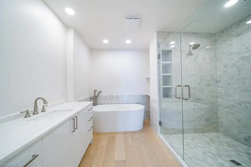 Experience the epitome of luxury living in the heart of downtown Naples, located above Provident Jewelers on prestigious 5th Avenue. This completely remodeled unit features 2 spacious bedrooms and 2.5 baths, all of which have been thoughtfully redesigned for modern living. Wide plank hardwood floors flow seamlessly throughout, while the chef's kitchen showcases high-gloss white cabinets, brushed gold hardware, BOSCH appliances, and stunning quartz countertops. The den area includes a built-in bar and shiplap wall accents, and the private laundry area offers ample storage. The owner's suite impresses with French door entry, hardwood floors, balcony access, and an en-suite bathroom with a large walk-in shower and floating tub. The guest suite features an en-suite bath, closet, and balcony access overlooking Cambier Park. Additionally, the residence boasts a rooftop swimming pool for owners and a reserved garage space secured under the building, just seconds away from sandy beaches, restaurants, and shops. There is nothing this convenient in downtown Old Naples with all these features and amenities. The very best available!