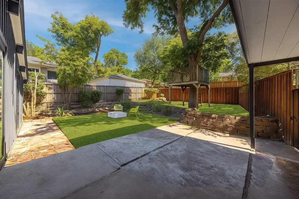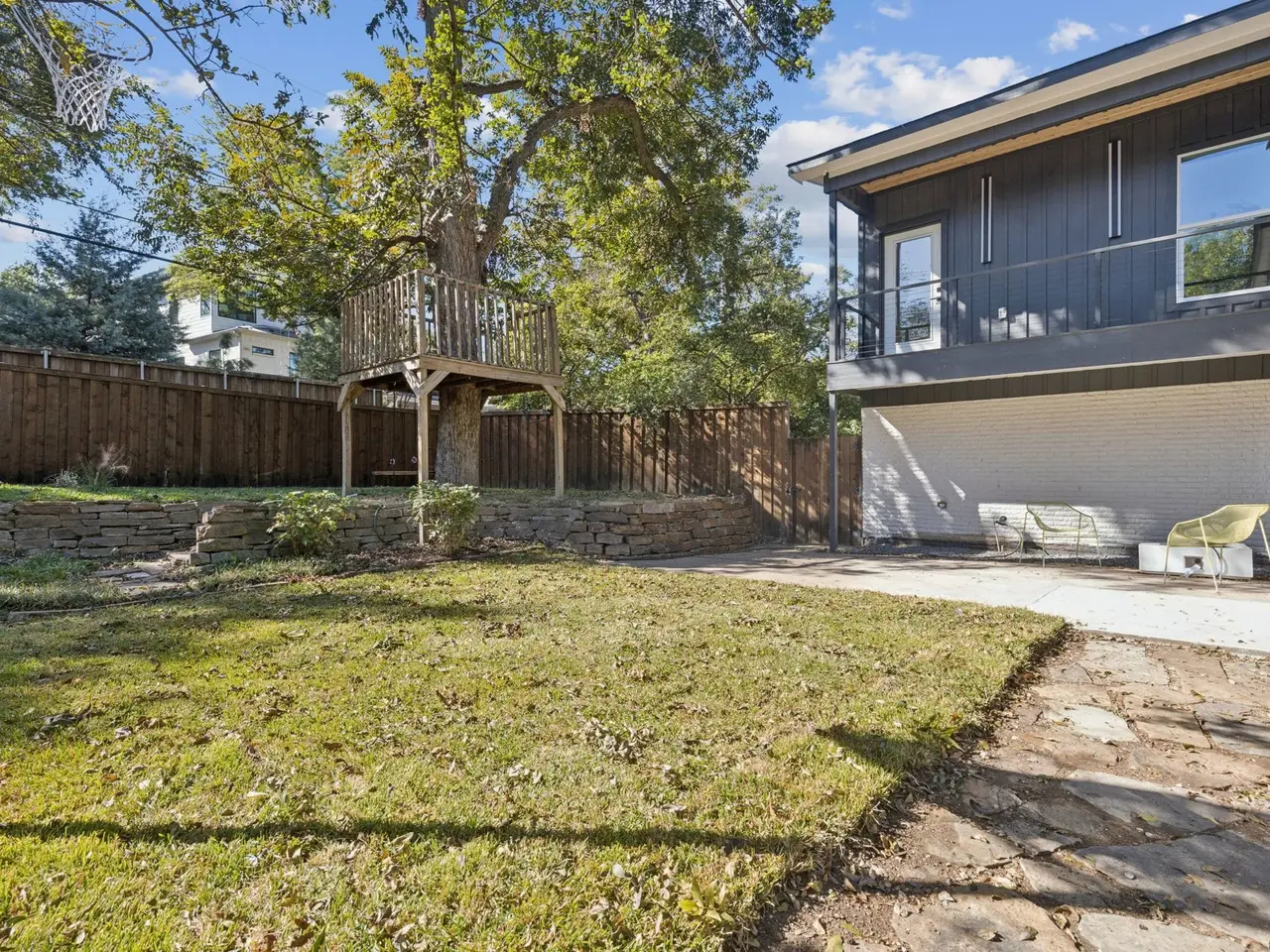 • Multi-level backyard with custom patios, firepit, and treehouse