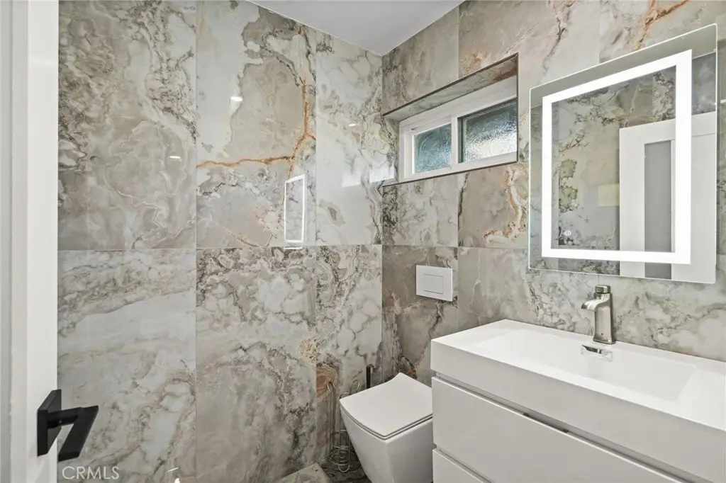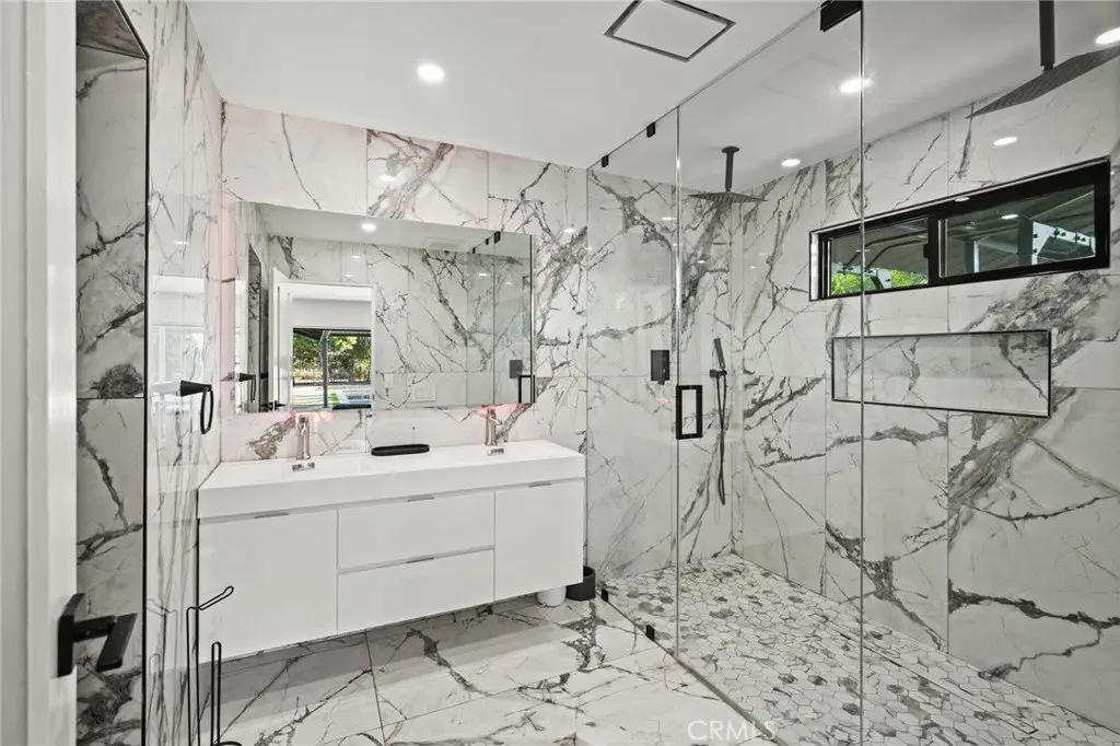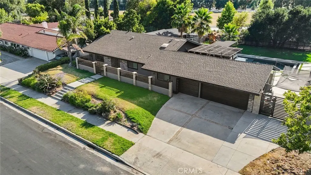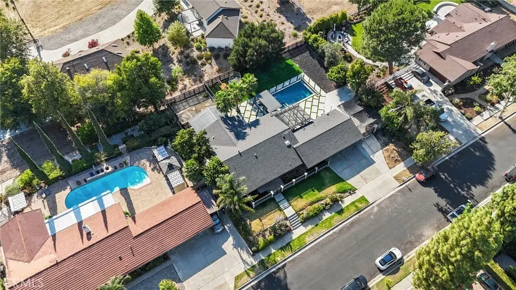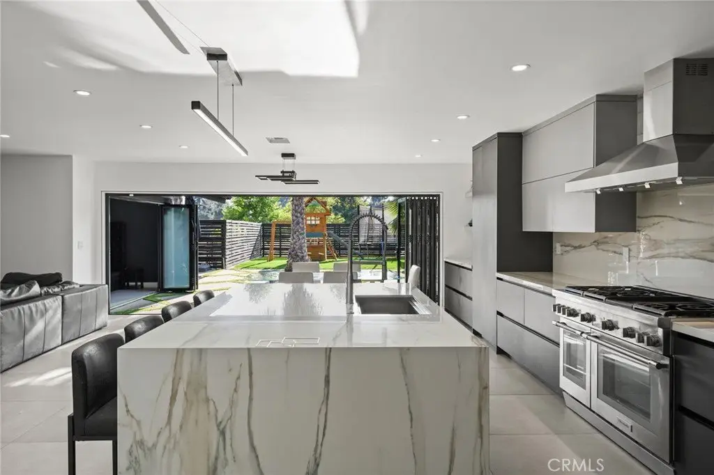 Picture-Perfect Modern Estate in Prime Chatsworth Neighborhood with ADU Potential! Welcome to this sprawling, single-story showpiece located in one of Chatsworth's most sought-after neighborhoods. Designed with a sleek, modern aesthetic, this minimalistic contemporary residence showcases minimalist interior finishes and exceptional craftsmanship throughout. Step into a seamless open floor plan where the living room impresses with a custom TV wall featuring built-in cabinetry, a dramatic slab backdrop, and a sleek electric fireplace. A full wall of windows floods the space with natural light, beautifully complementing the European grey tile floors, and modern finish throughout. The space flows effortlessly into a chef’s dream kitchen outfitted with a massive waterfall island, two-tone matte lacquer cabinetry, quartz countertops, and top-of-the-line Thermador appliances, including a built-in fridge and open shelving. Accordion-style glass pivot doors blur the lines between indoor and outdoor living, opening wide to reveal a resort-style backyard. Set on a massive, usable lot, the outdoor space is your private oasis, complete with modern landscaping, a sparkling pool and spa, sunken fire pit, built-in barbecue center with a Big Green Egg, and HUGE turf and concrete areas. The lot also includes RV access and ample space for an ADU. A dedicated pet-friendly area with privacy fencing ensures your furry friends have their own secure sanctuary. This 4-bedroom, 2.5-bathroom home features a luxurious primary suite reminiscent of a five-star resort. Enjoy serene backyard views through retractable accordion doors, and unwind in the spa-inspired en-suite bathroom adorned with 24”x48” porcelain tiles, black-veined accents, a massive walk-in shower with dual rain showers, and his-and-hers vanities. A spacious walk-in closet completes this dream retreat. Additional highlights include: Designer ocean-blue tiled guest bathroom with floating vanity and tub/shower combo. A private half bath in the fourth bedroom, perfect for guests or office use. Bonus family/media room adjacent to the kitchen, ideal for movie nights. 3-car garage with window views into the home and direct access to the living area. Whether you’re entertaining, relaxing, or envisioning future expansion with an ADU, this home delivers on every level. Don’t miss the opportunity to own this exceptional property in one of the Valley’s most desirable communities!