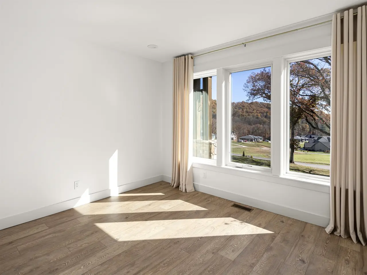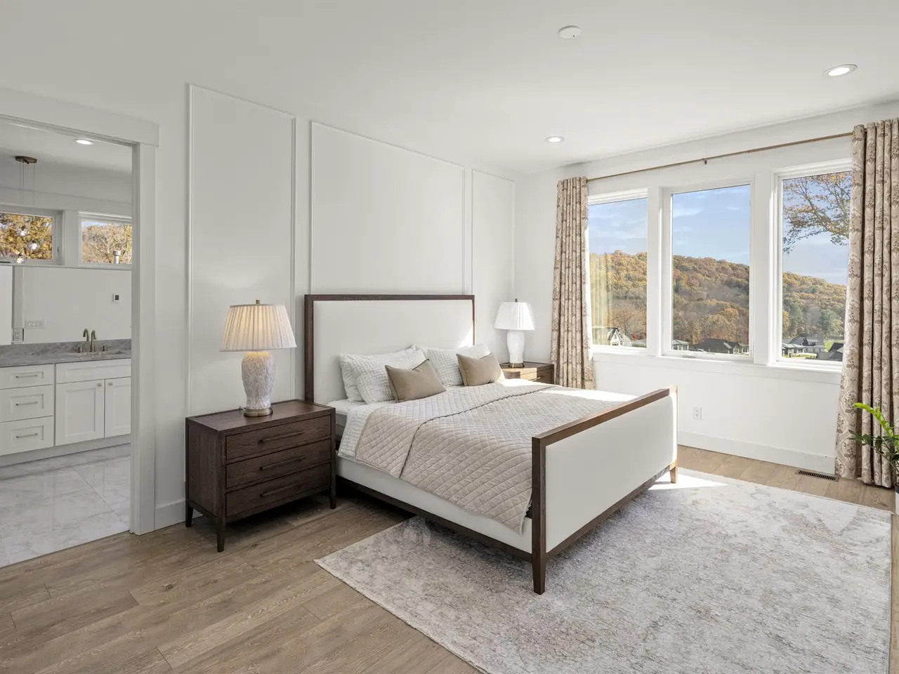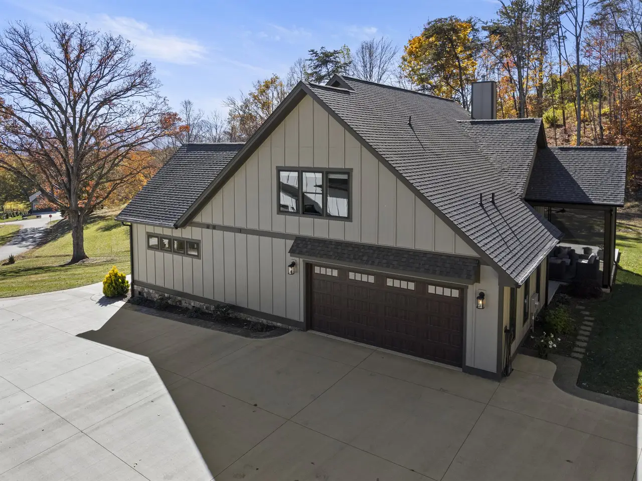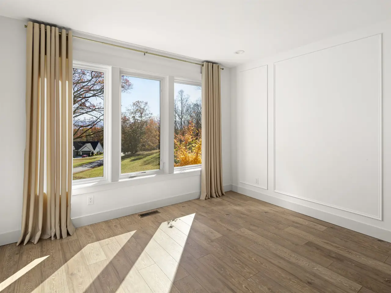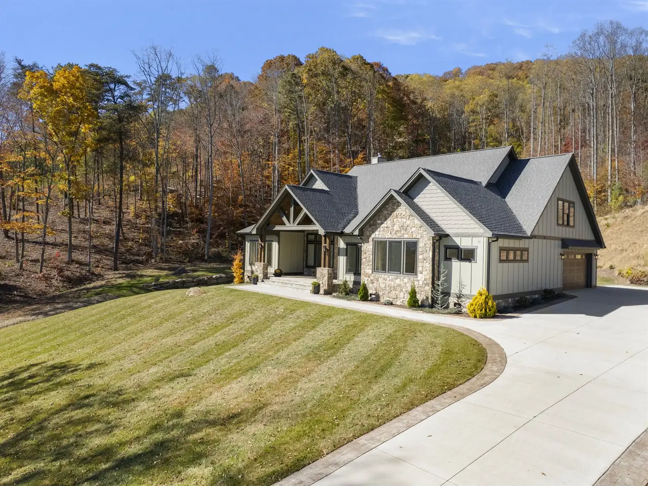 Welcome to Candler's newest premier gated community, featuring large mountain views and rolling hills. This stunning, modern 3,100+ sq ft home offers the perfect blend of luxury, comfort, and functionality. Includes 2,616 sq. ft. of main level living space, plus an additional non-continuous 540 sq. ft. ensuite guest bedroom above the garage, complete with a full bath and coffee bar (with beverage frig), which is perfect for guests, family or a private studio. When you step inside the front door, you'll find 12-ft ceilings, abundant natural light and an open-concept living area, including a soaring floor-to-ceiling Green Start Apex wood-burning fireplace with push-button start and adjustable digital controls, capable of efficiently heating the main living space and beyond. The gourmet kitchen is a chef'sdream, featuring a walk-in pantry with an undercounter beverage refrigerator, an oversized island with Taj Mahal Quartz countertops and additional custom touches throughout. The primary suite is a serene retreat offering stunning mountain views, a spa-inspired bath with a large soaking tub, walk-in shower and a spacious custom walk-in closet. Additional highlights include: Heated floors in the main level bathrooms and laundry room, custom built-in cabinetry in the office, central vacuum system and three-zone HVAC for year-round comfort, large walk-in closets with custom built-ins, screened-in back porch overlooking a large private backyard and a 662 sq. ft. basement/crawlspace which includes space for a workshop, storage area, or wine cellar. Enjoy the tranquility and breathtaking views of the Blue Ridge Mountains from this meticulously crafted home that perfectly blends modern style, technology, and mountain living.