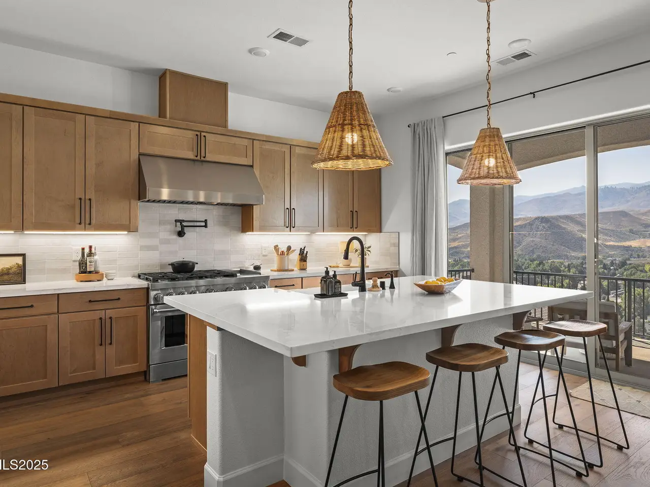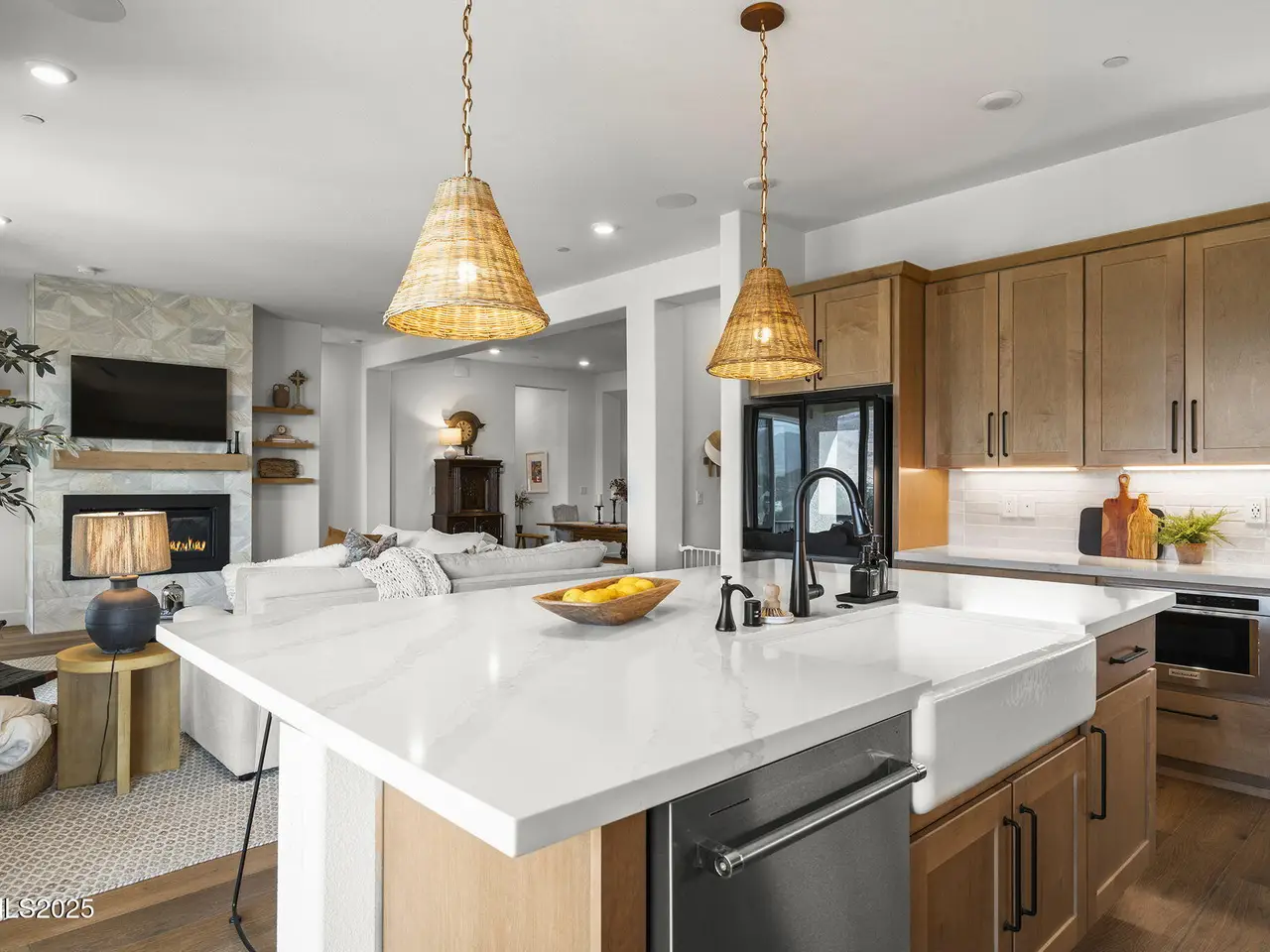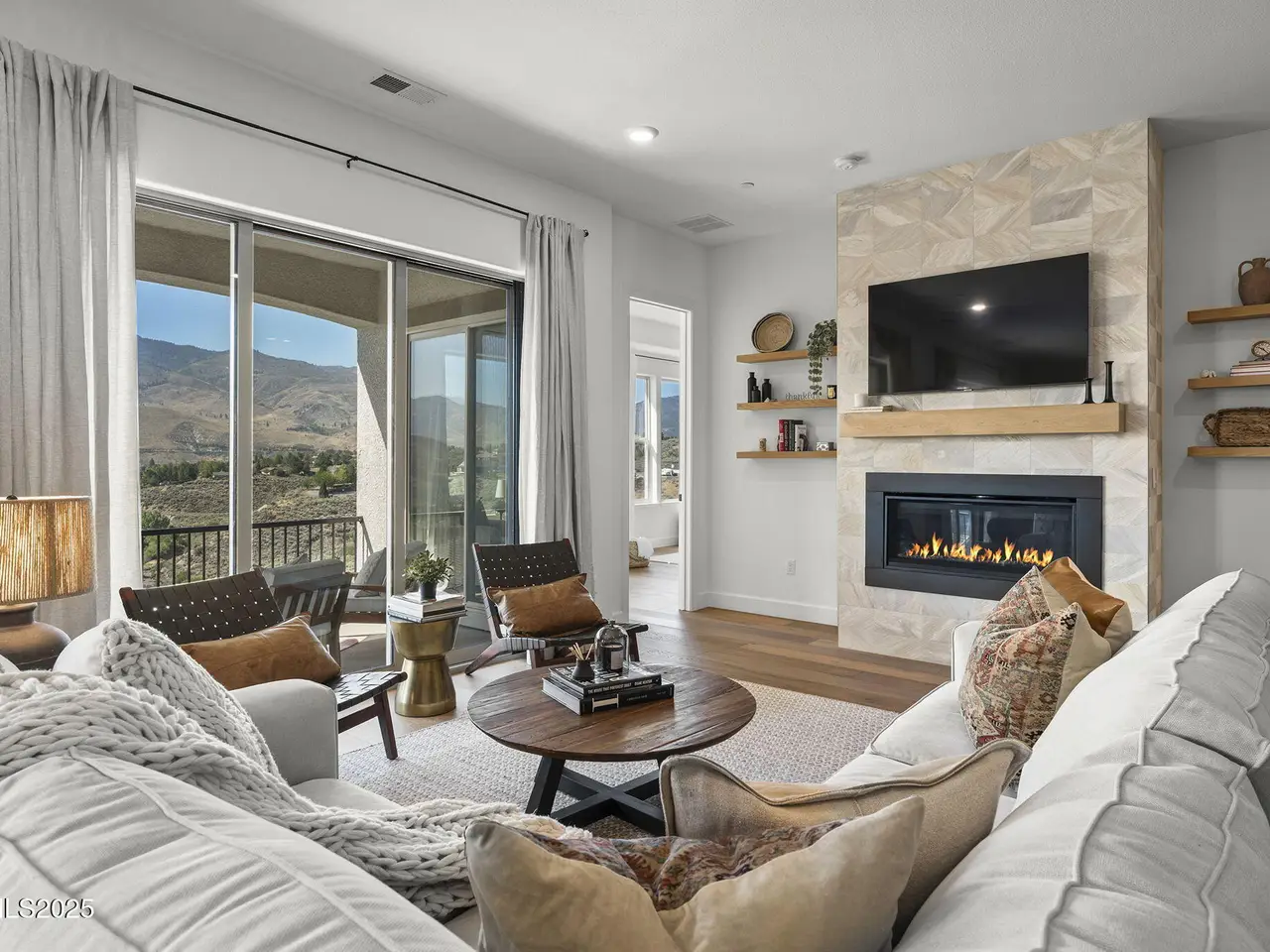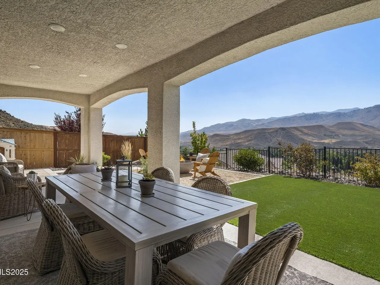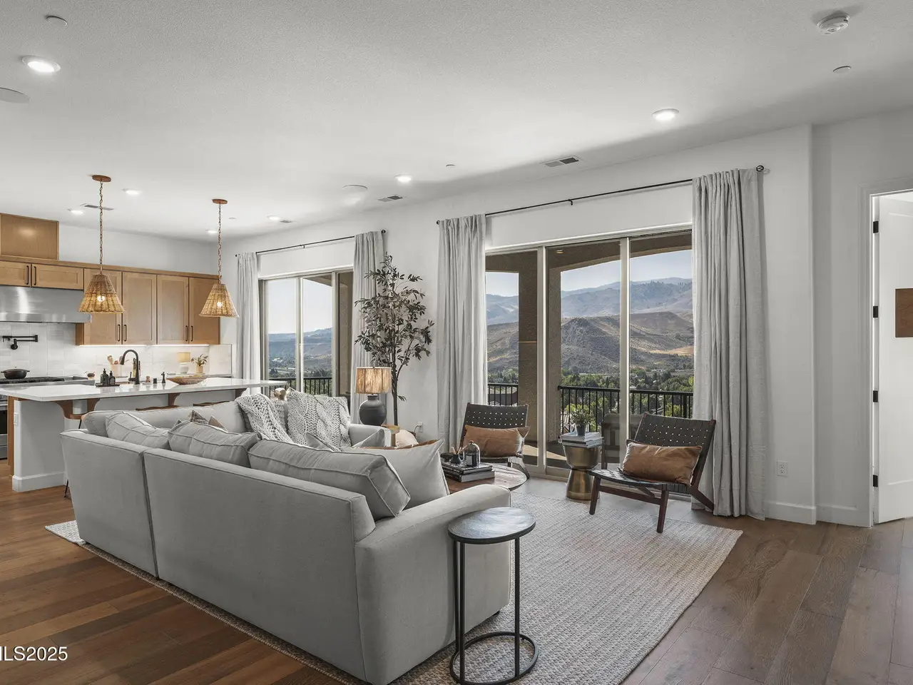 Opportunities like this don't come often. Tucked within Sunset Bluffs —an intimate hillside community in Northwest Reno of only 41 homes— this luxurious residence offers a lifestyle and is more than just a home, it displays model home perfection with unmatched, breathtaking views. Perched on a premier lot with no immediate rear neighbors, no neighbors on one side, and none directly across, it offers a level of privacy and serenity you simply won't find elsewhere. From the moment you step inside, your eyes are drawn to majestic, sweeping views of the Sierra Nevada mountains. Whether you're preparing a meal in the gourmet kitchen, relaxing by the great room fireplace, waking in your private primary suite, or unwinding on the oversized covered deck, the vistas are breathtaking—and unforgettable. Designed for main level living, the layout showcases dramatic 9' ceilings and rich hardwood flooring throughout. The open-concept great room centers around the 45" linear fireplace with floating beam mantel and full tile surround while flowing seamlessly into the chef's dream kitchen, complete with a Kitchen Aid stainless steel appliance package featuring a 48" six burner commercial-style gas range with griddle and double oven, Quartz counters, farmhouse style apron-front cast iron sink, under-cabinet lighting, roll-out shelving, walk-in pantry, coffee bar/prep area, and sleek designer finishes. Every detail has been thoughtfully curated for both style and function. The generous dining area completes this entertainer's dream space. Expansive 3-panel Western Sliders in both the great room and kitchen erase the boundary between indoor and outdoor living, framing nightly sunsets and wildlife sightings right from your own home. The split primary suite feels like a personal retreat, offering large windows that capture the morning light, direct deck access, and a spa-like bath with dual vanities, upgraded Kohler vessel sinks, a luxurious walk-in frameless glass shower and spacious walk-in closet. Two additional bedrooms share a beautifully upgraded full bath with dual Quartz vanities, drop-in sinks and a fully tiled tub/shower. A separate den/office with a glass-panel door, powder room, and fully appointed laundry room, including cabinets and laundry sink, complete the main level. The walk-out lower level is a world of its own and expands the home's versatility—complete with a large living area, flex space, and fully finished kitchenette, complete with sink, microwave and beverage fridge. Perfect for entertaining, extended guest stays, or multi-generational living, it even includes a bedroom, full bath, and direct access to the outdoor spaces. Additional features - • In-ceiling audio system • Automatic interior lighting in some locations • Central data panel • Three-car insulated garage with epoxy flooring and upgraded openers • Hardwood flooring on both levels, including the primary suite • Expansive covered deck & professionally designed outdoor living spaces • Rare private lot with uninterrupted views and unmatched seclusion • Numerous upgraded details and additional features throughout the home This is not just a home—it's a chance to live elevated, every single day. Homes with this level of privacy, luxury, and sweeping views rarely come available.